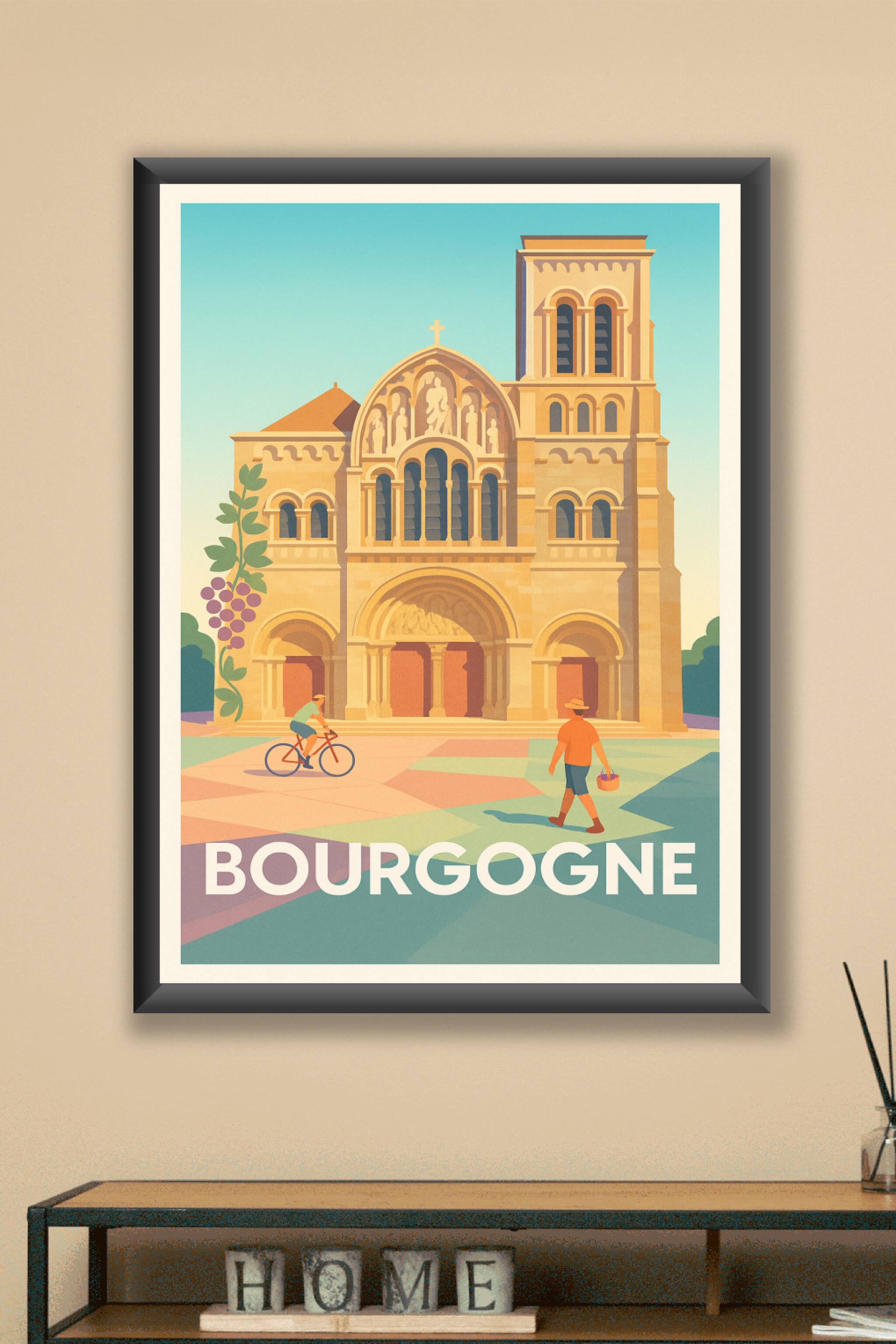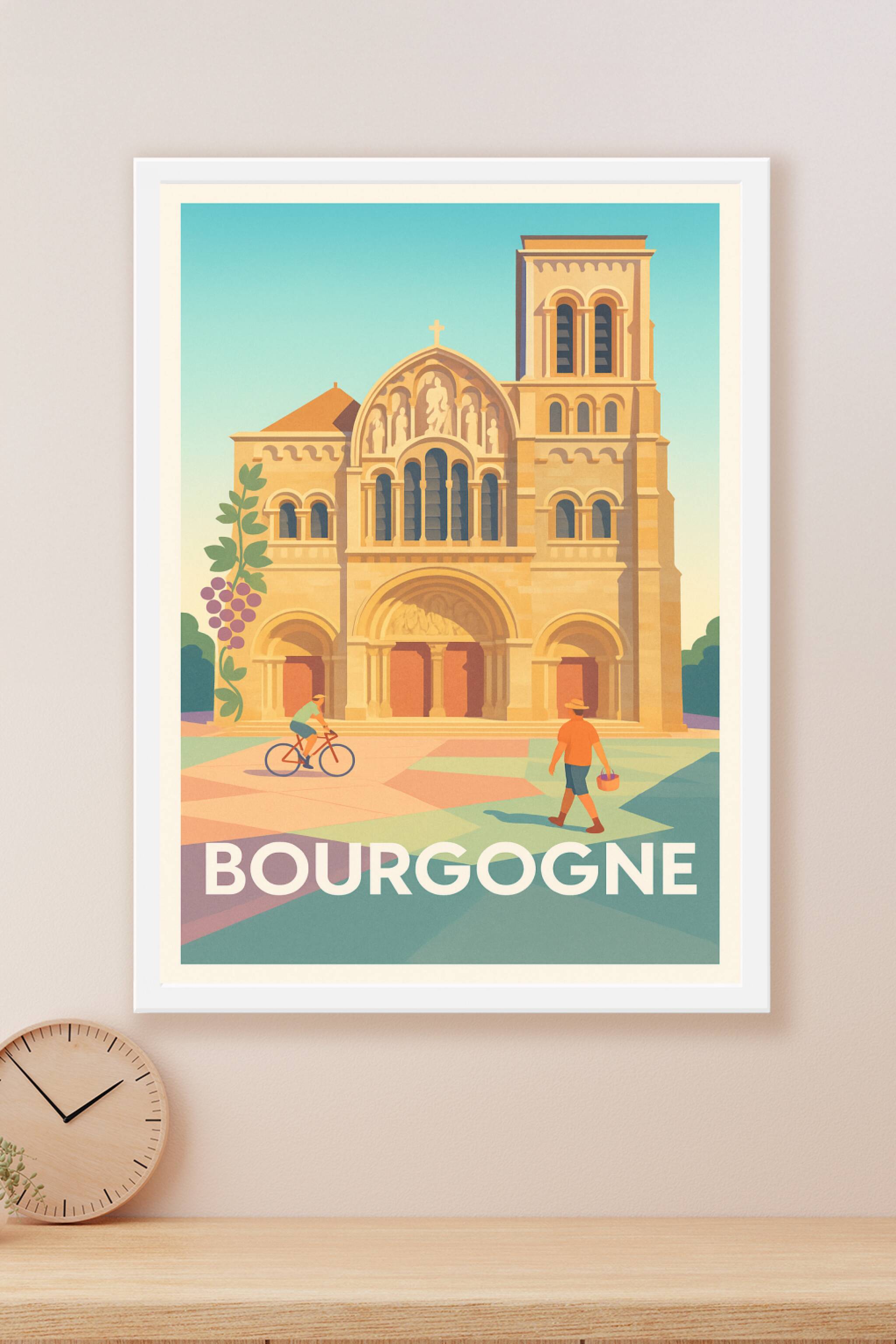 Découvrez la beauté authentique de la Bourgogne avec cette affiche illustrée mettant en avant son architecture remarquable et son ambiance paisible...
