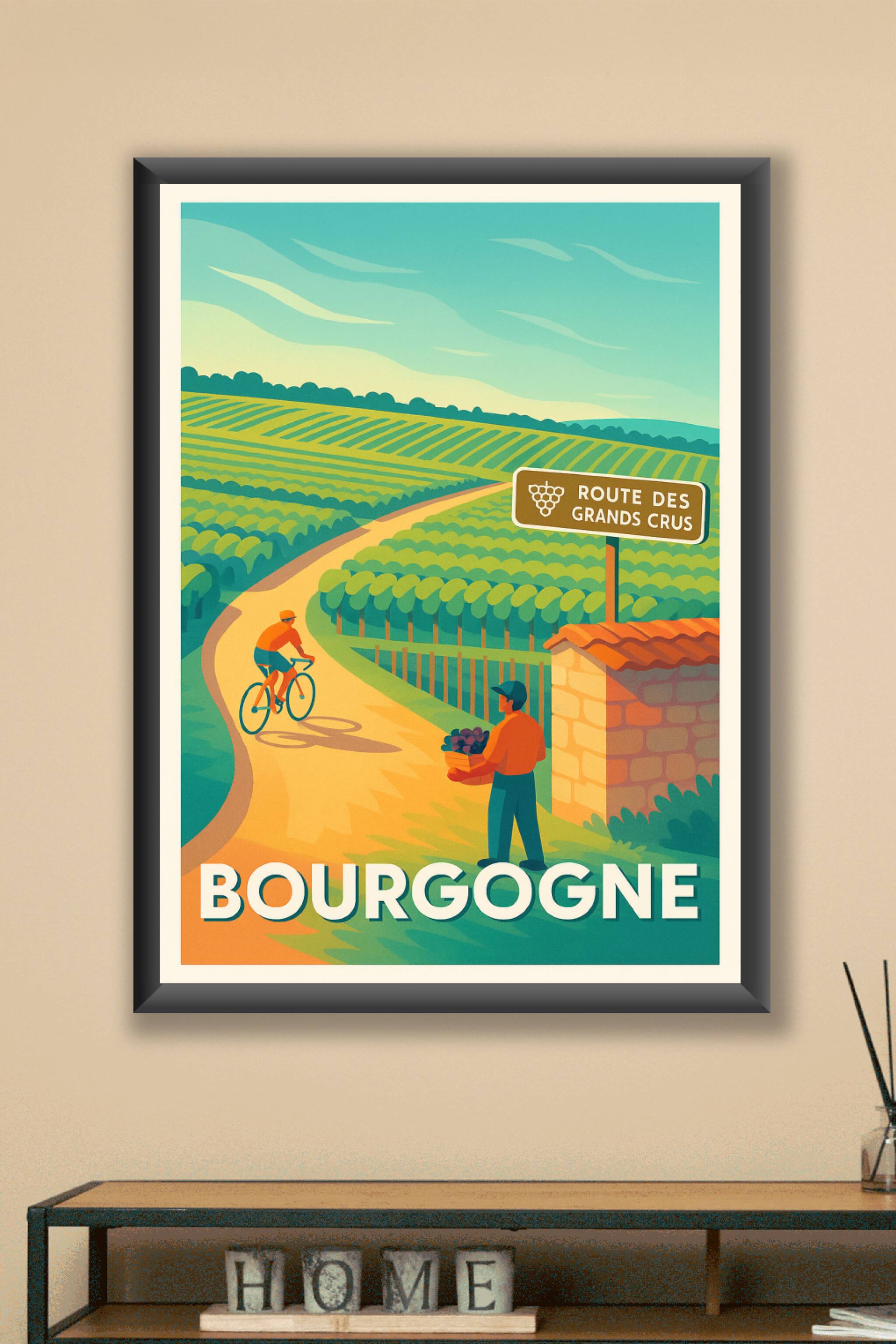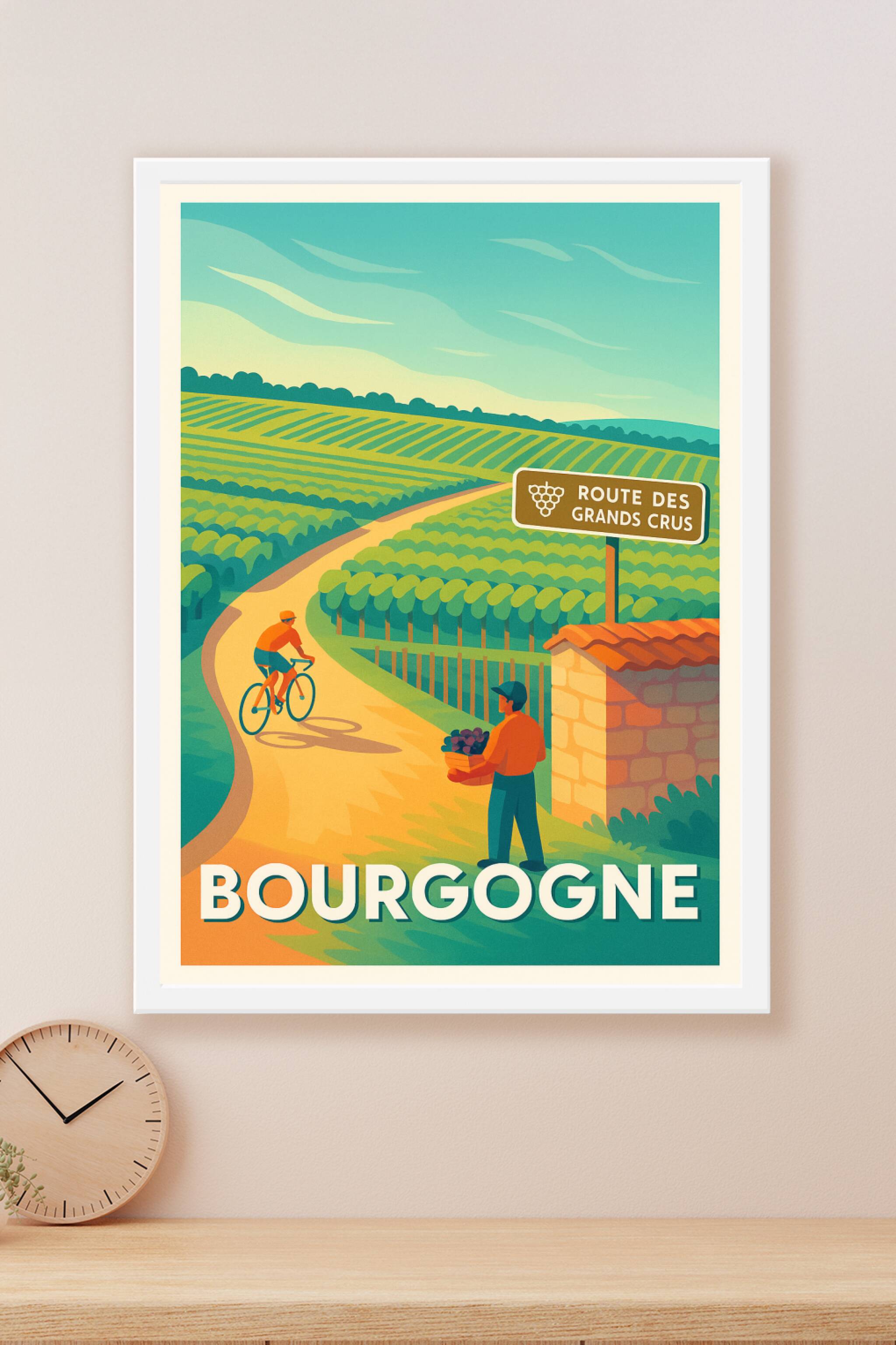 Découvrez la beauté intemporelle des vignobles de Bourgogne avec cette affiche captivante illustrant la célèbre Route des Grands Crus. Un chemin se...