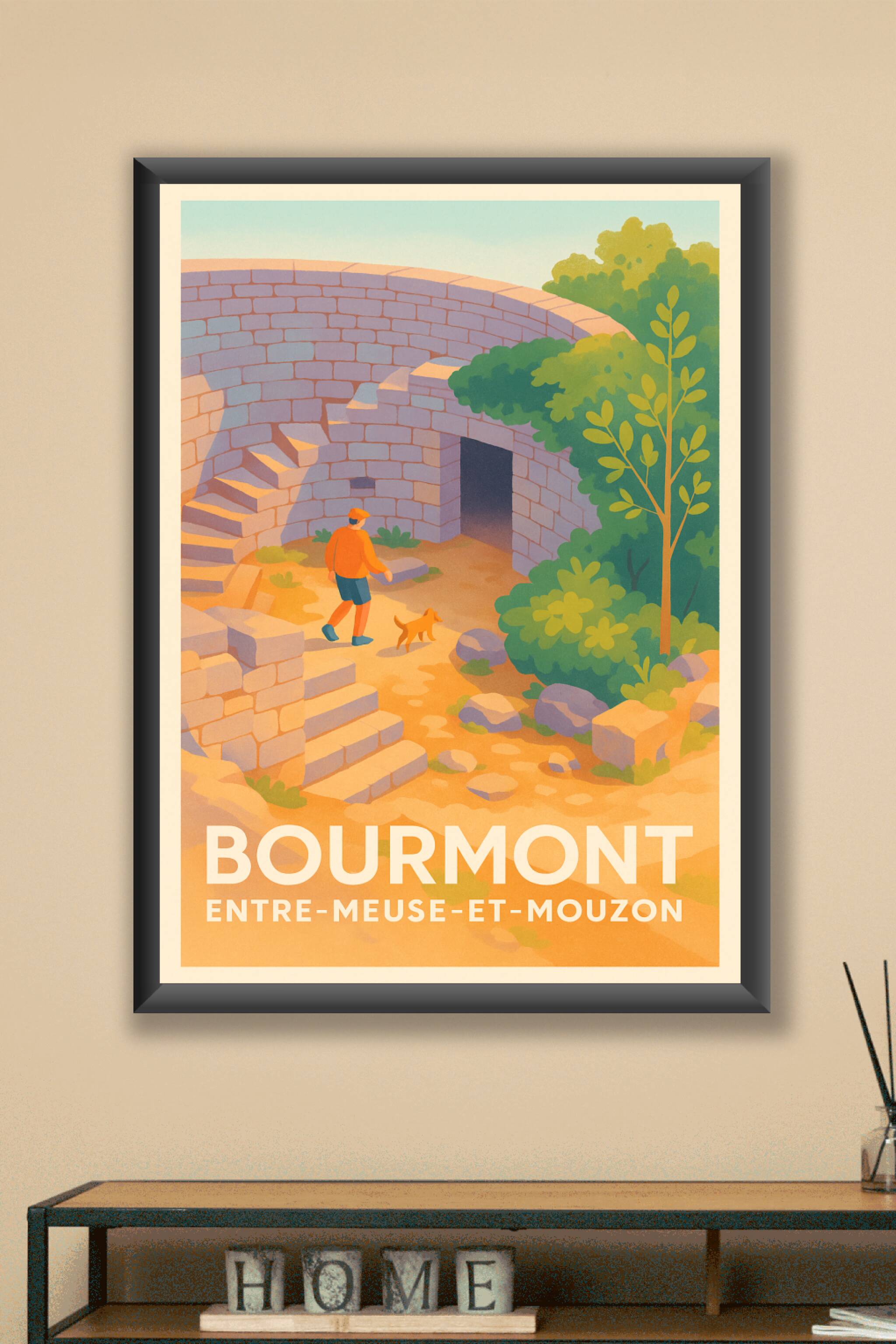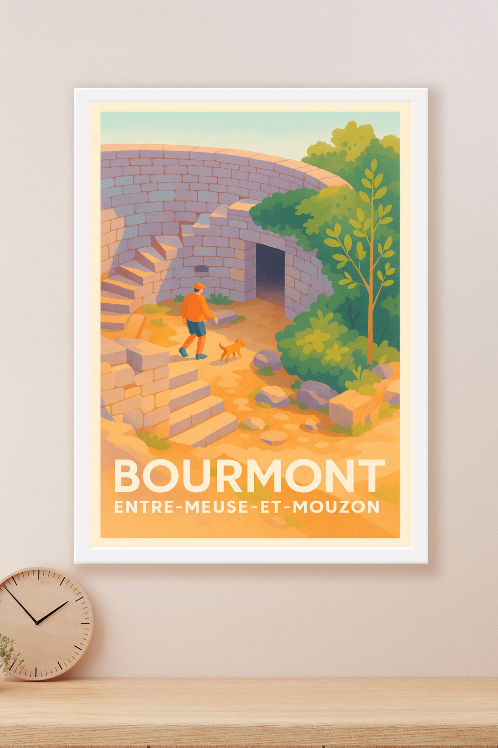Découvrez l'atmosphère paisible et mystérieuse de Bourmont à travers cette affiche illustrée mettant en scène un promeneur et son chien devant une ancienne construction en pierres, au cœur de la nature verdoyante. Ce poster, au style doux et chaleureux, vous invite à un véritable voyage visuel entre histoire et nature. Imprimée en tirage "Fine Art" sur un papier 305g coton haut de gamme, cette affiche garantit une qualité d'impression exceptionnelle et une durabilité remarquable. Disponible en plusieurs formats, du A1 au A4, avec ou sans cadre, elle s'adapte parfaitement à tous les espaces de votre intérieur. Sublimez votre décoration ou offrez un souvenir unique de Bourmont grâce à ce tirage premium 100% fabriqué en France.