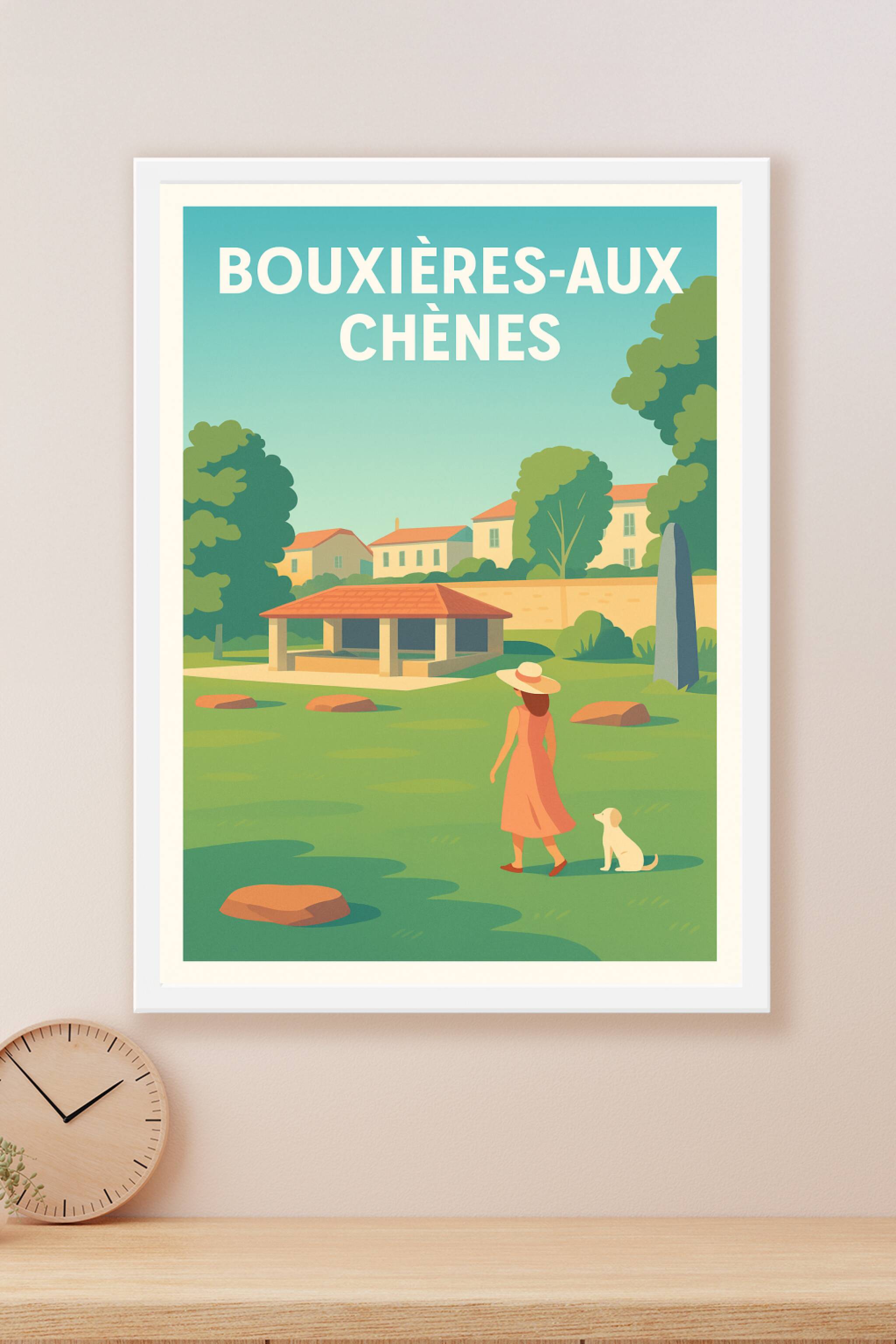 Découvrez la douceur de vivre à Bouxières-aux-Chênes avec cette superbe affiche illustrant une balade tranquille dans un espace historique et verdo...