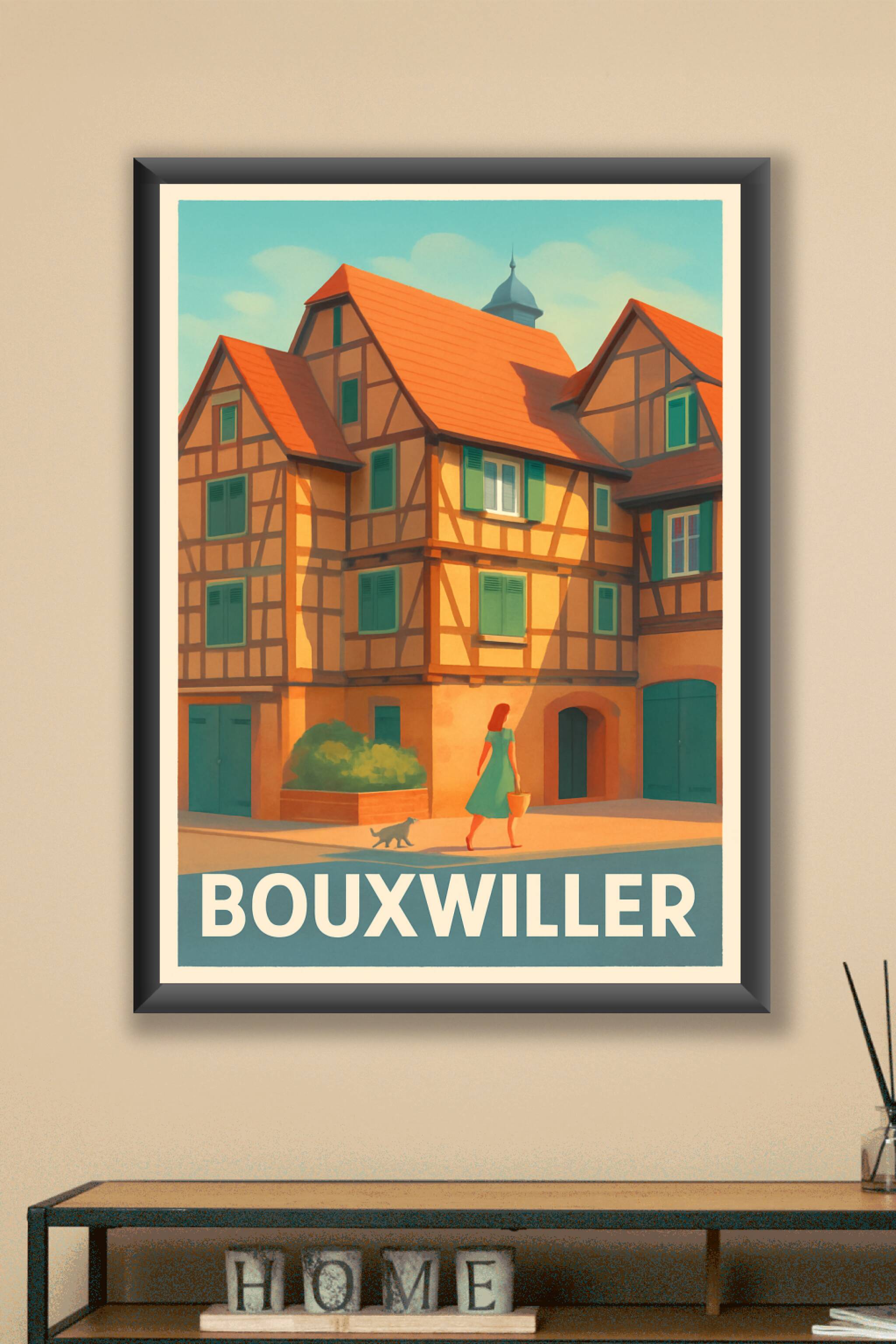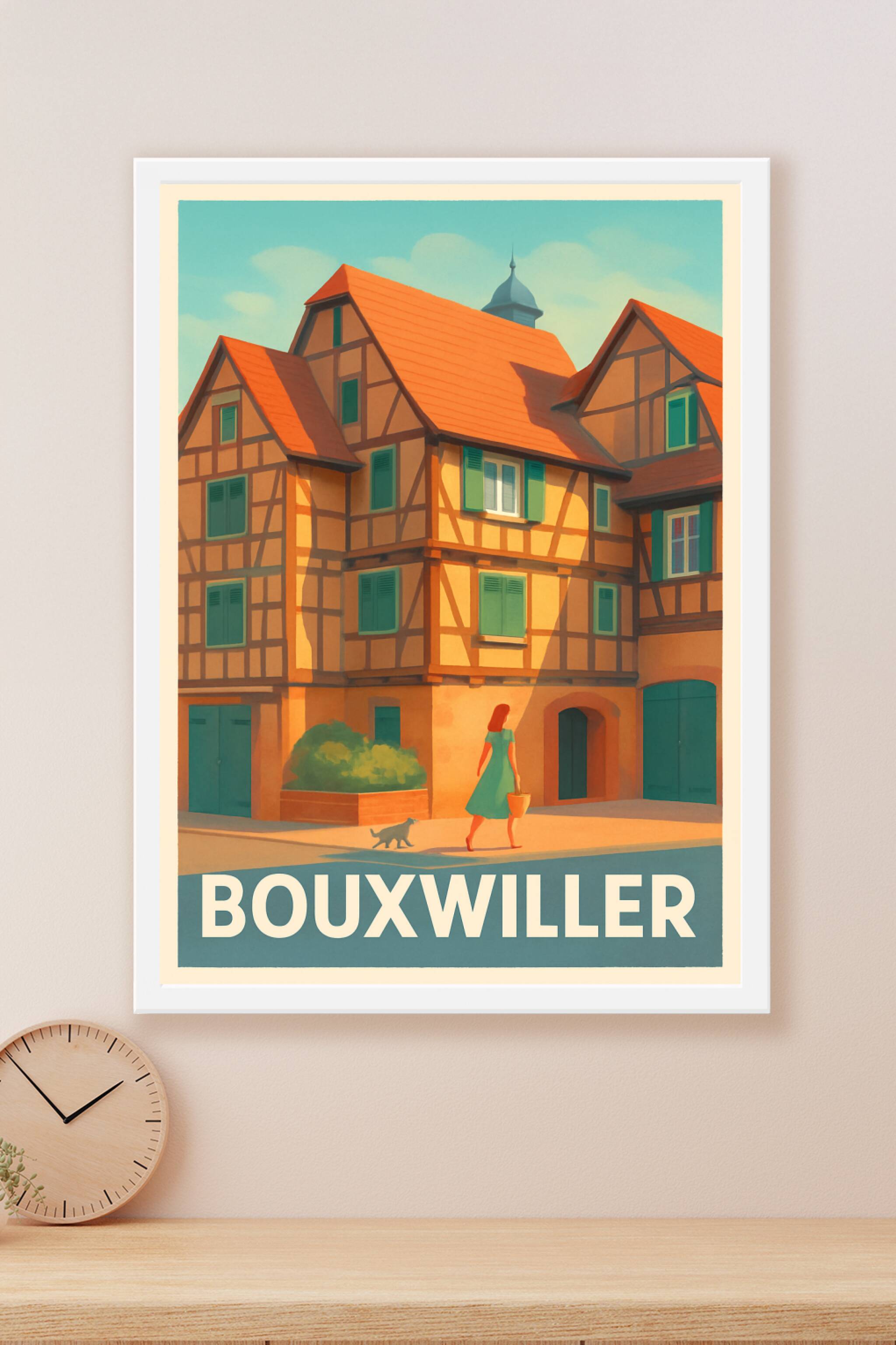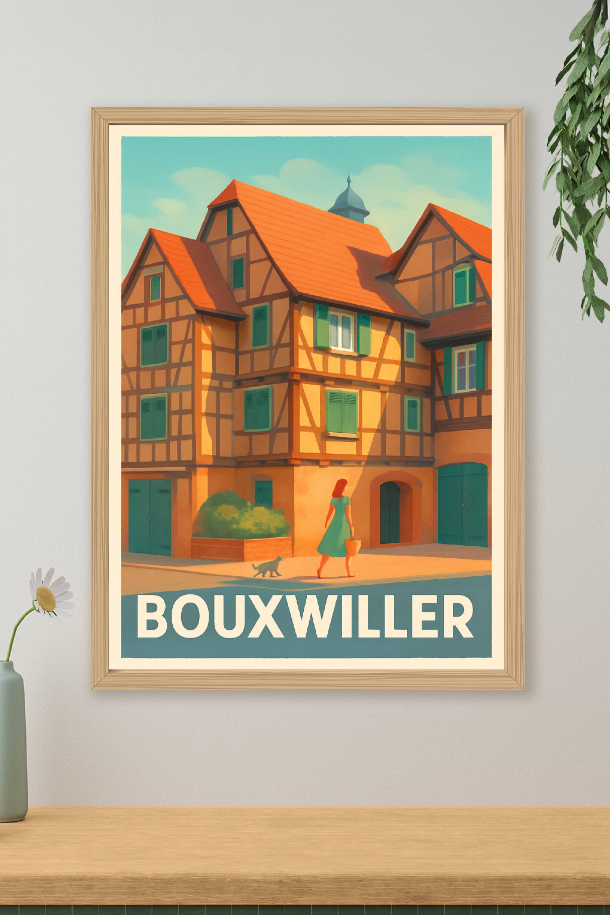 Découvrez la douceur de vivre en Alsace avec cette affiche illustrant un quartier typique de Bouxwiller, où les maisons à colombages baignées de lu...