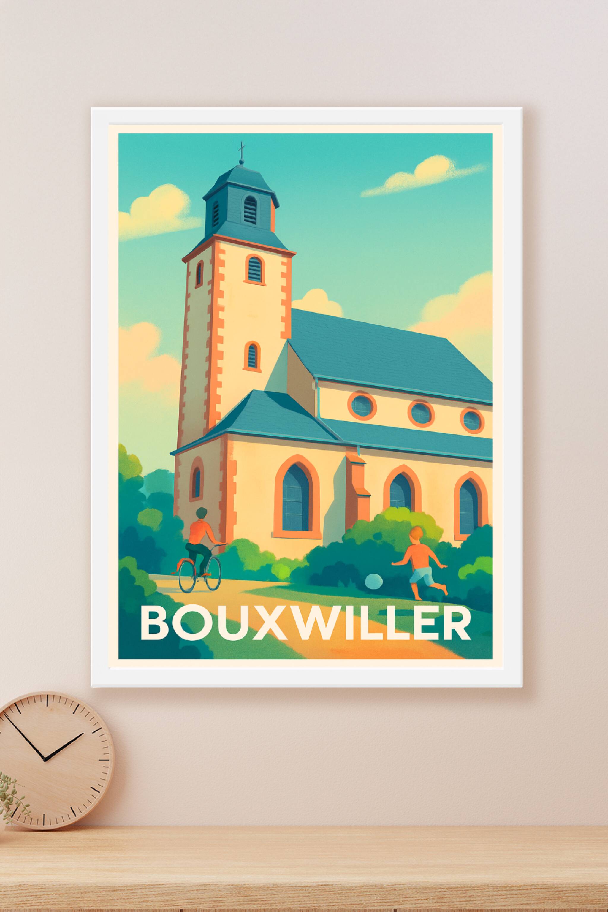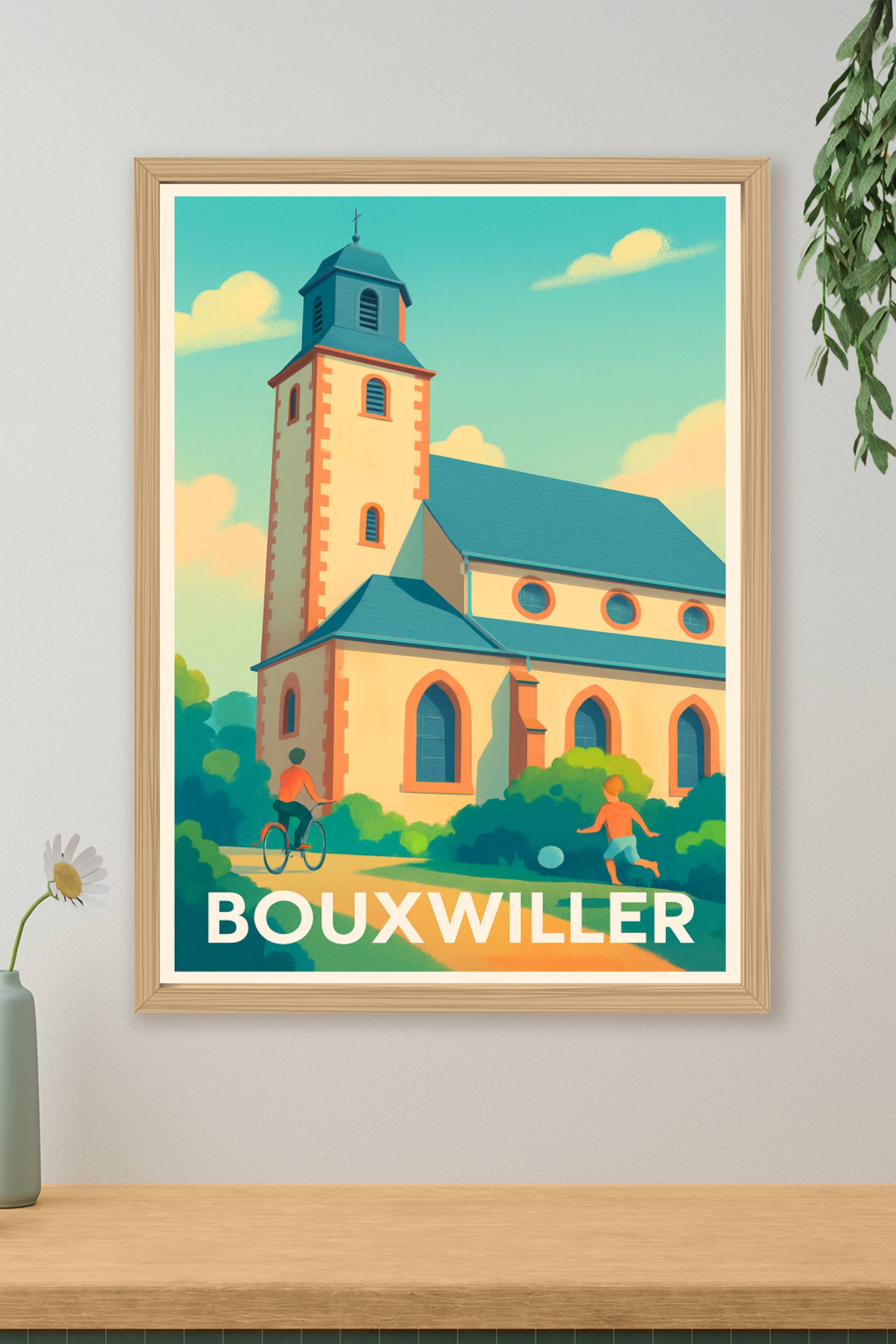Découvrez l'atmosphère tranquille et accueillante de Bouxwiller avec cette affiche illustrée mettant en avant son architecture typique et ses espac...