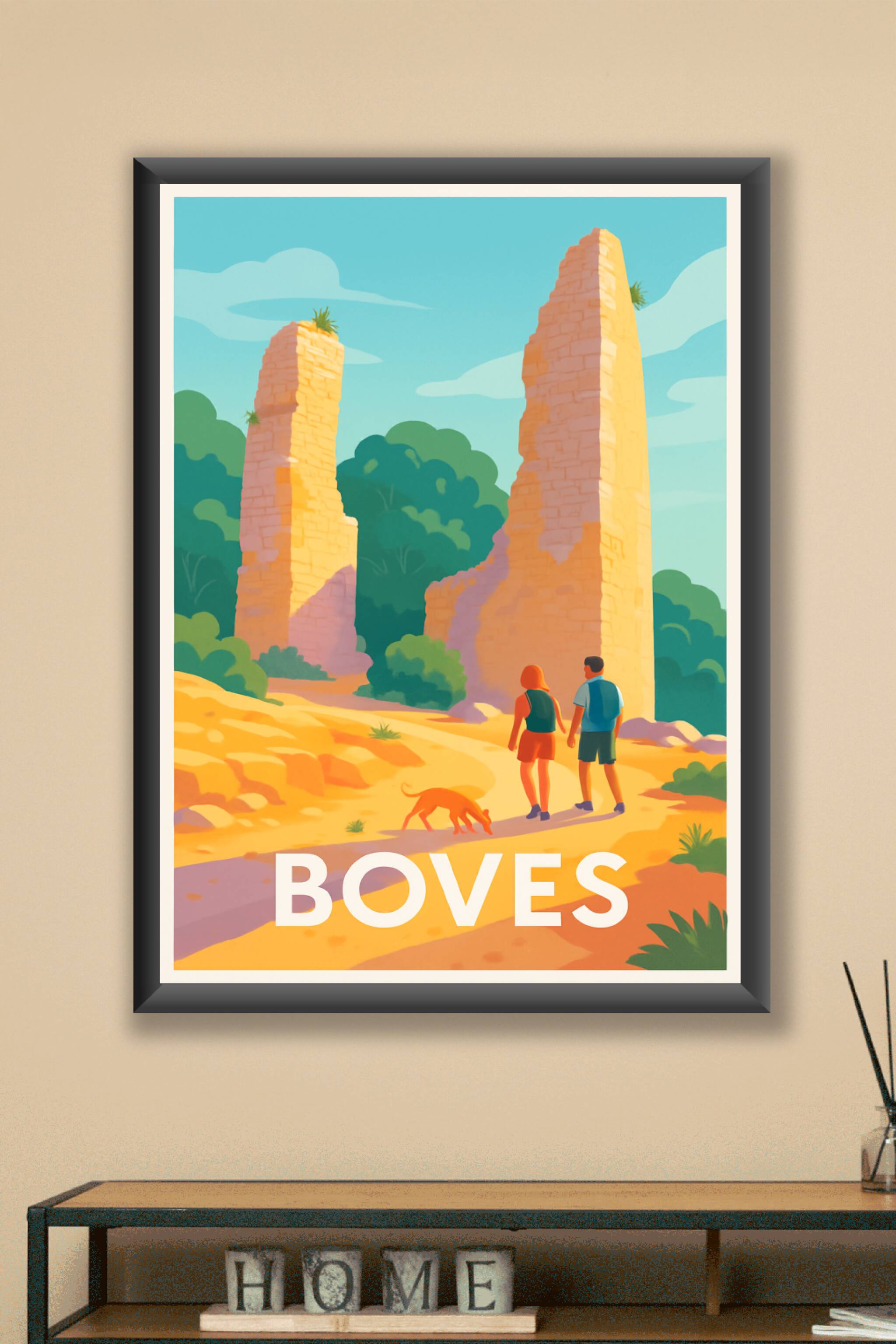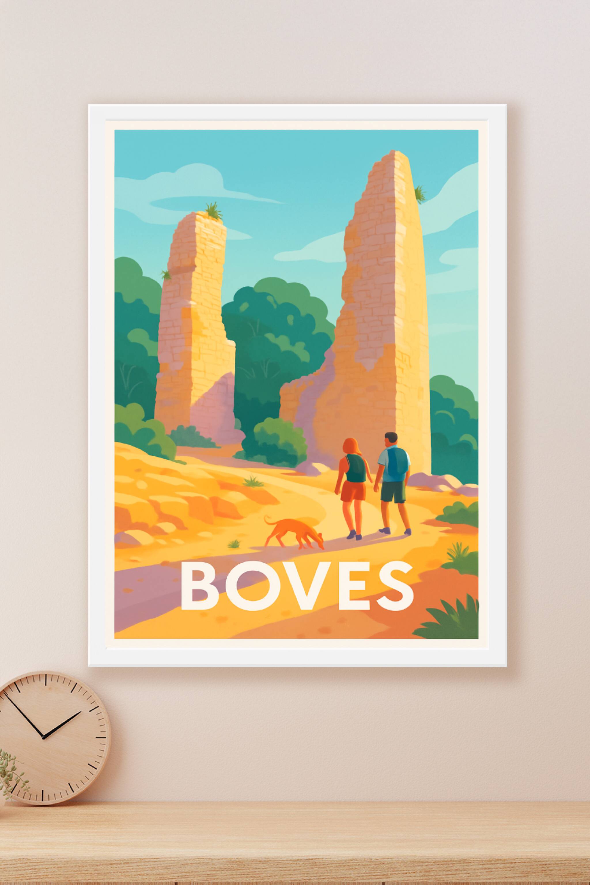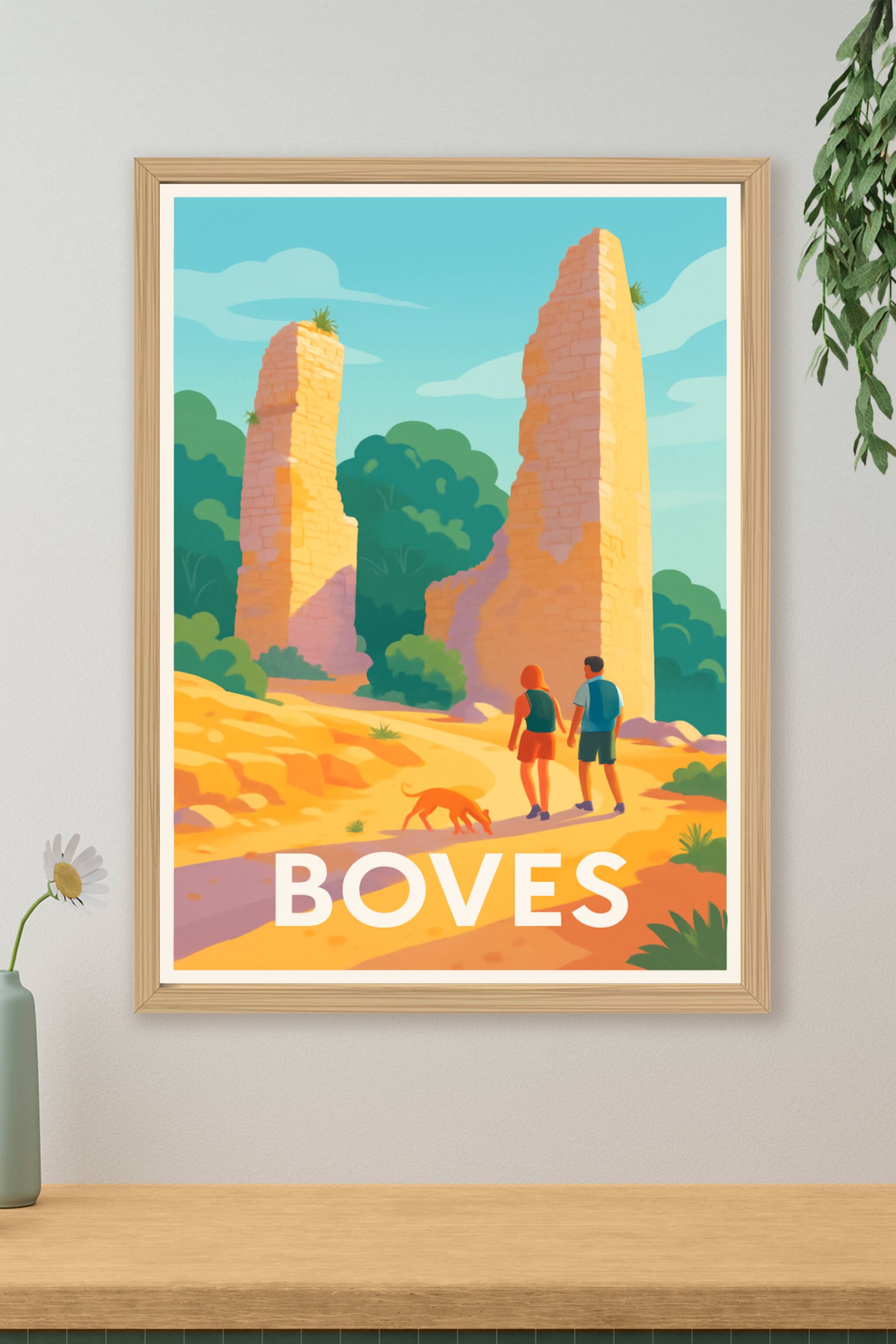 Découvrez la beauté naturelle et historique de Boves avec cette affiche illustrée représentant un couple en randonnée au pied des vestiges impressi...