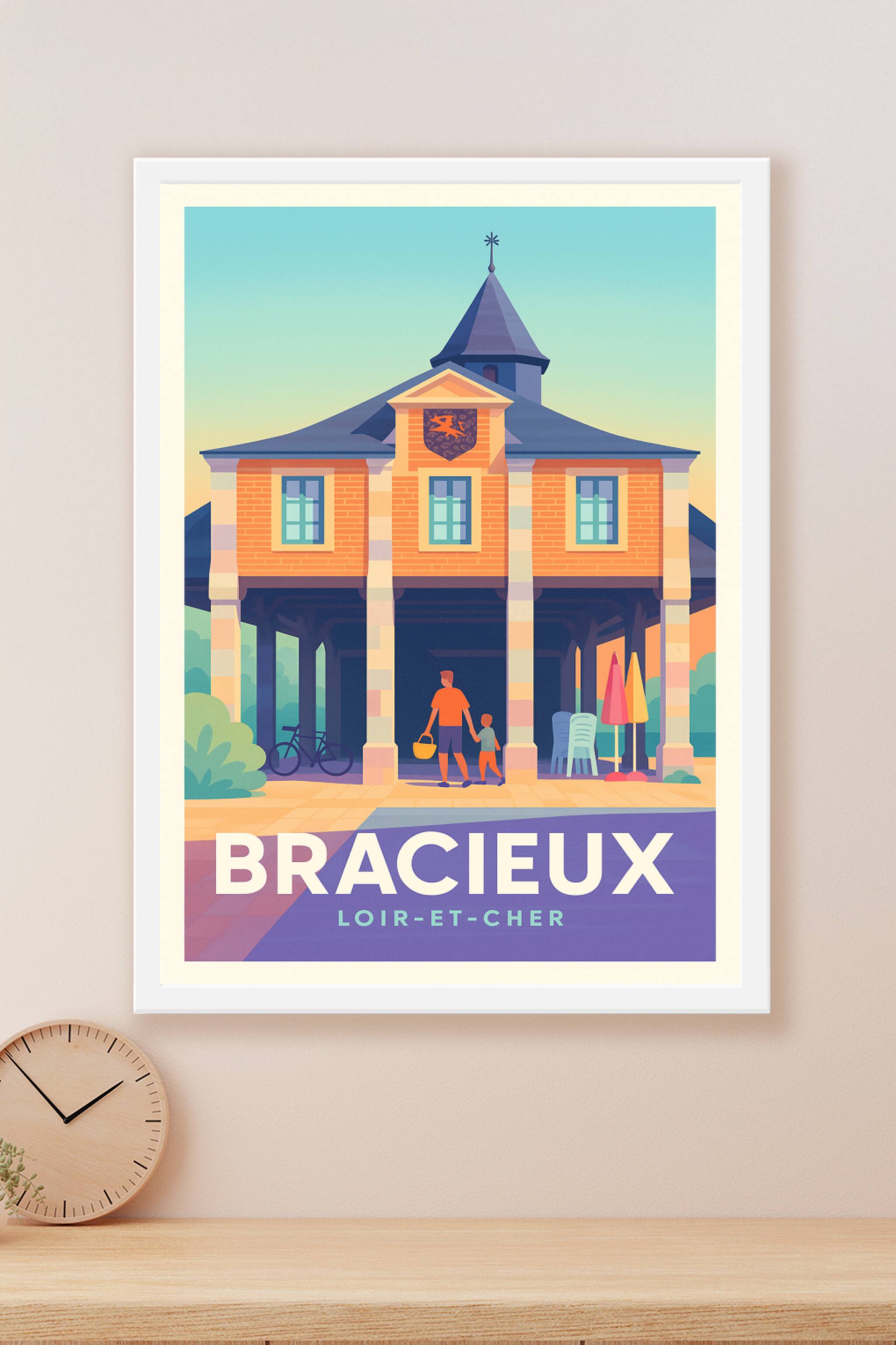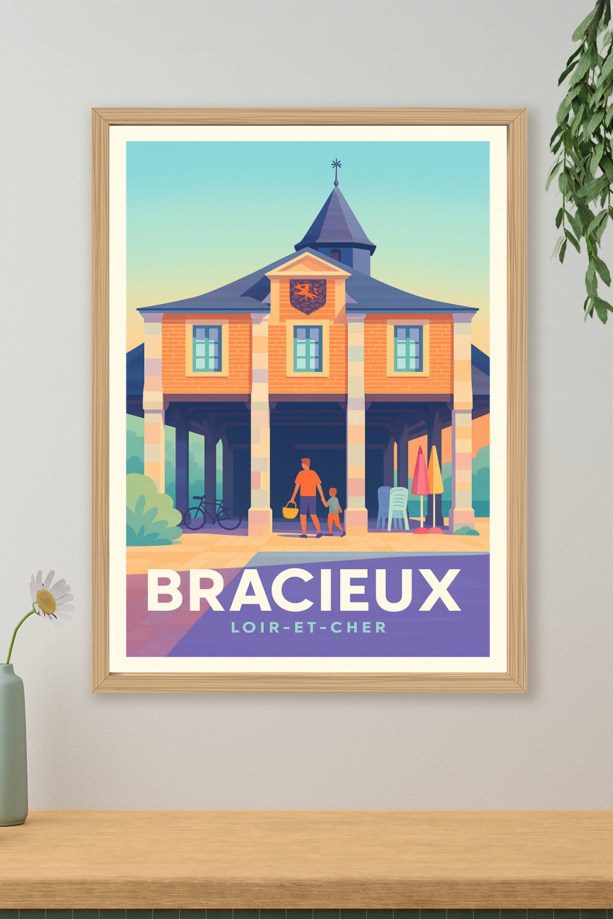 Découvrez le charme intemporel de Bracieux avec cette affiche illustrée représentant une scène paisible et conviviale devant un bâtiment emblématiq...