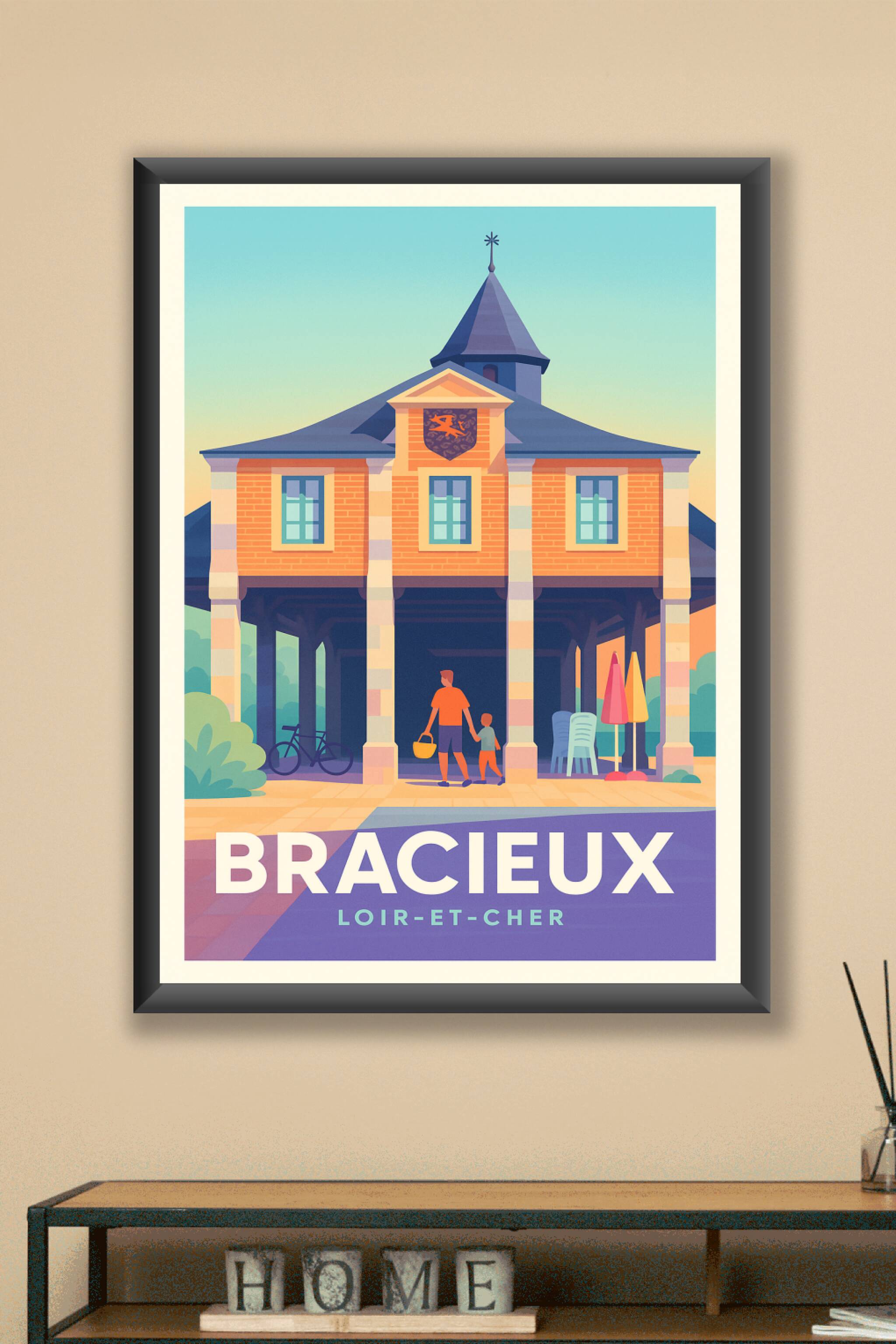 Découvrez le charme intemporel de Bracieux avec cette affiche illustrée représentant une scène paisible et conviviale devant un bâtiment emblématique de la ville. Ce poster aux couleurs douces et pastels invite à la sérénité et à la découverte de ce coin authentique de Loir-et-Cher.Ce poster est imprimé en tirage "Fine Art" sur papier 305g coton, garantissant une qualité d'impression exceptionnelle et une tenue dans le temps. Disponible en plusieurs formats, de A1 à A4, vous pouvez choisir votre préférence avec ou sans cadre pour adapter cette affiche à votre décoration intérieure. Sublimez votre intérieur ou offrez un souvenir unique de Bracieux avec cette création pleine de douceur et de caractère, 100% fabriquée en France.