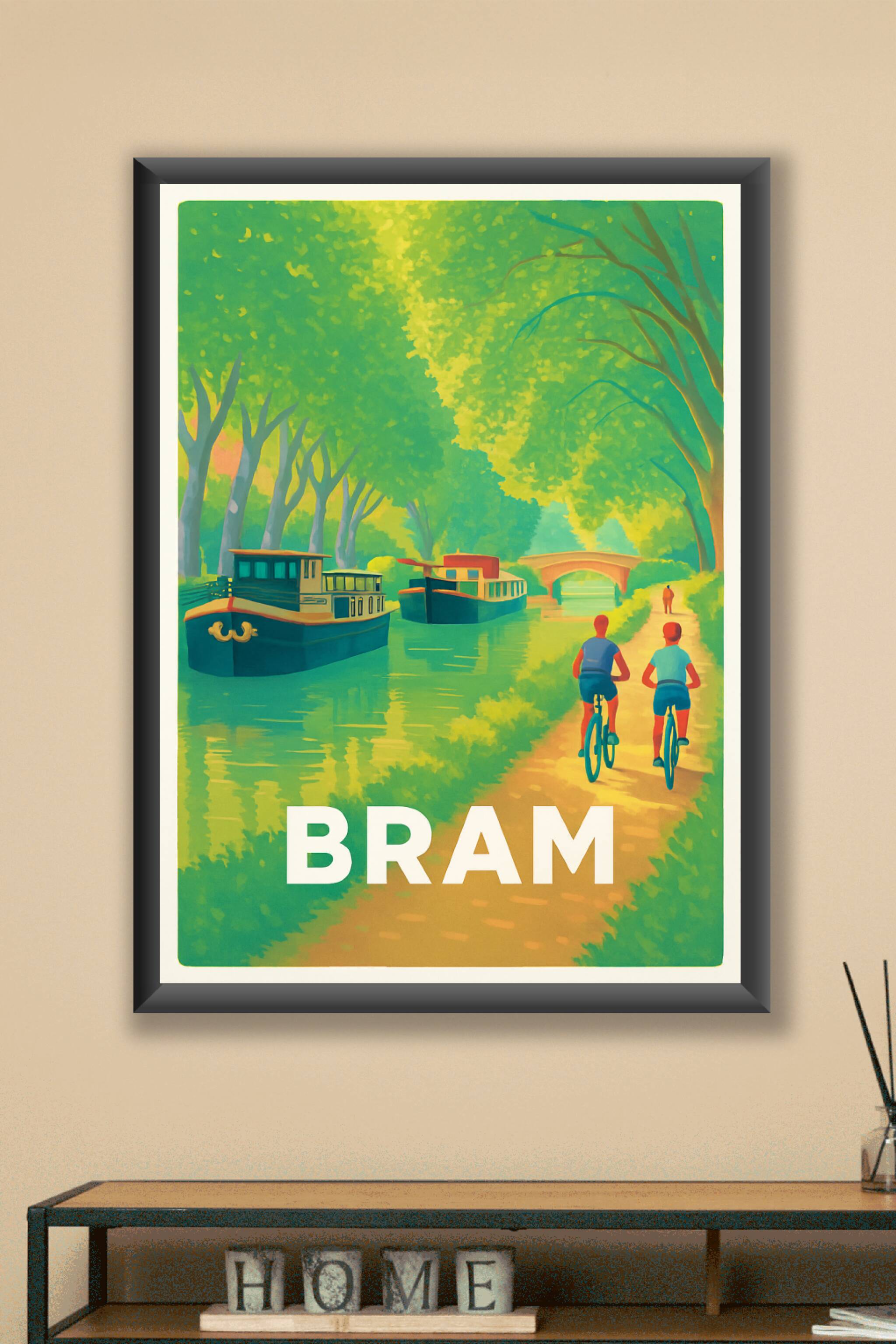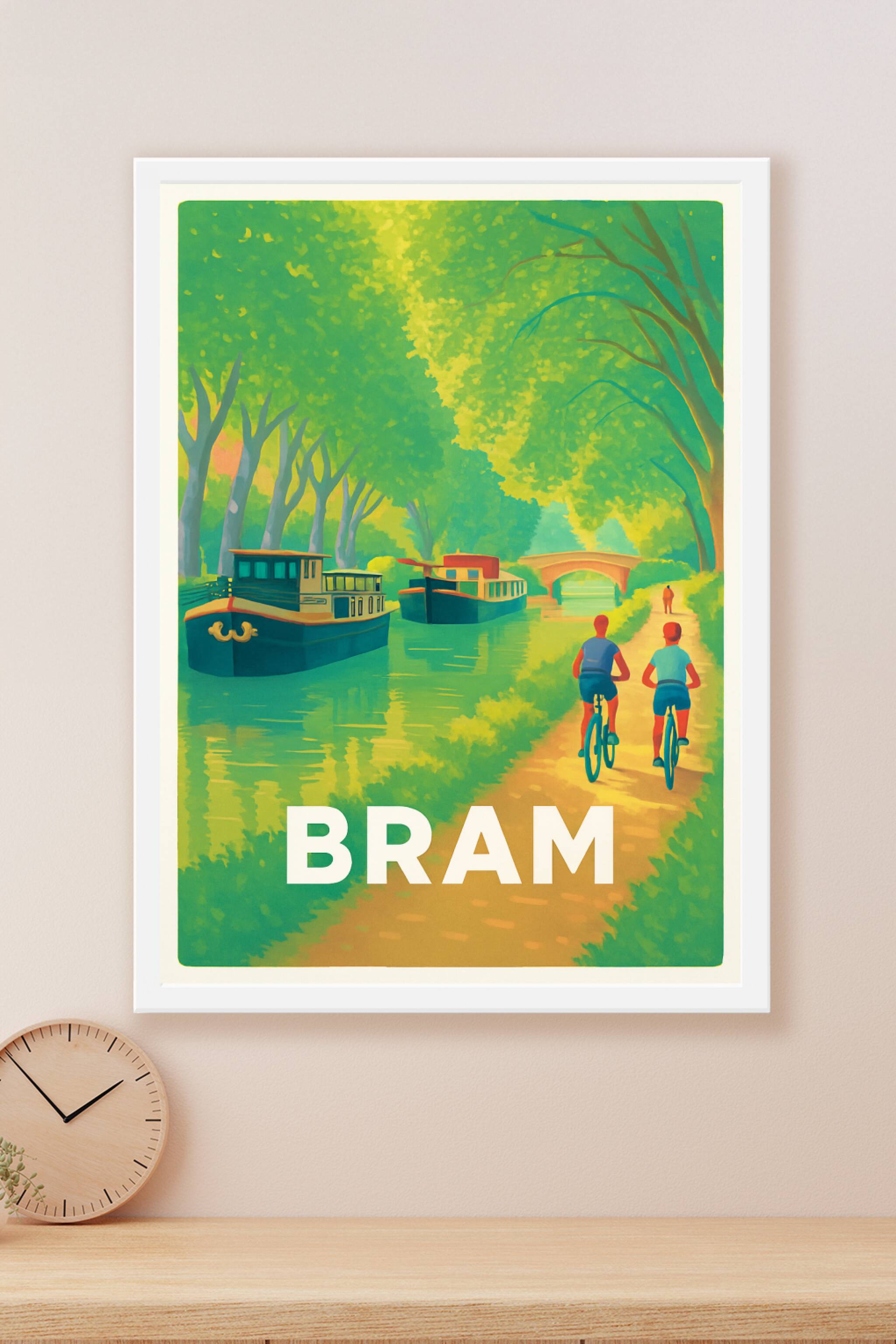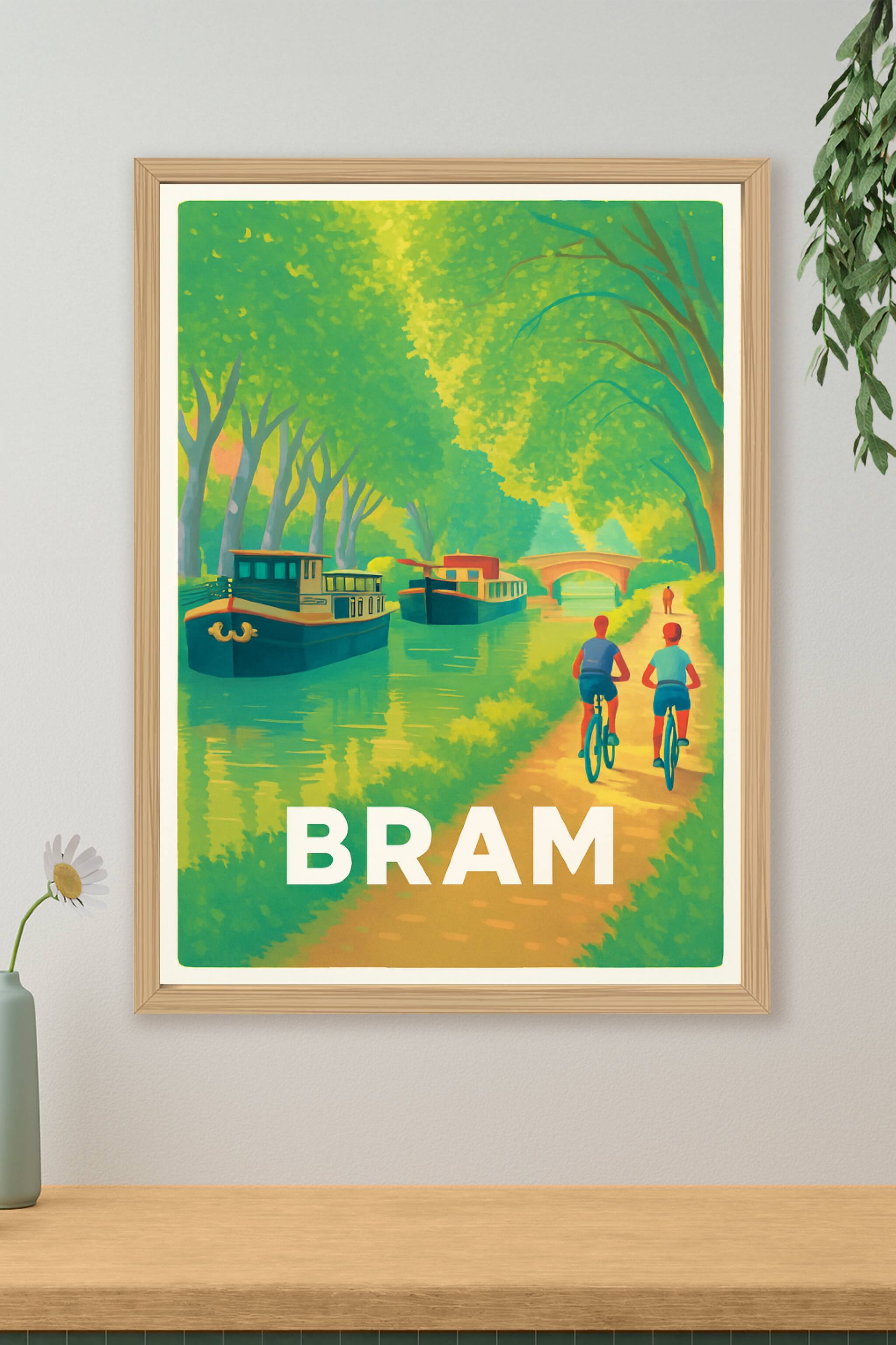 Découvrez la sérénité de Bram avec cette affiche illustrée mettant en scène une promenade le long du canal bordé de péniches et d'arbres verdoyants...