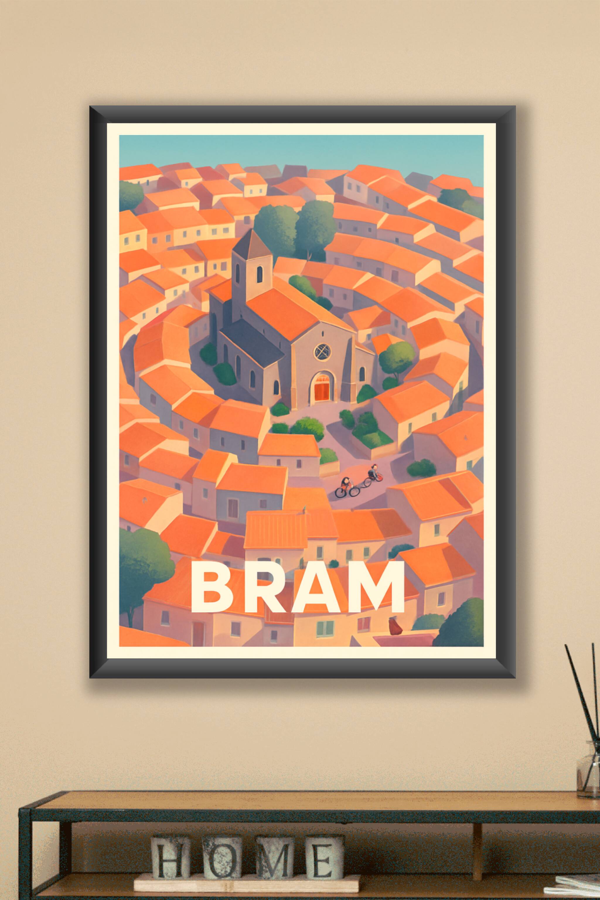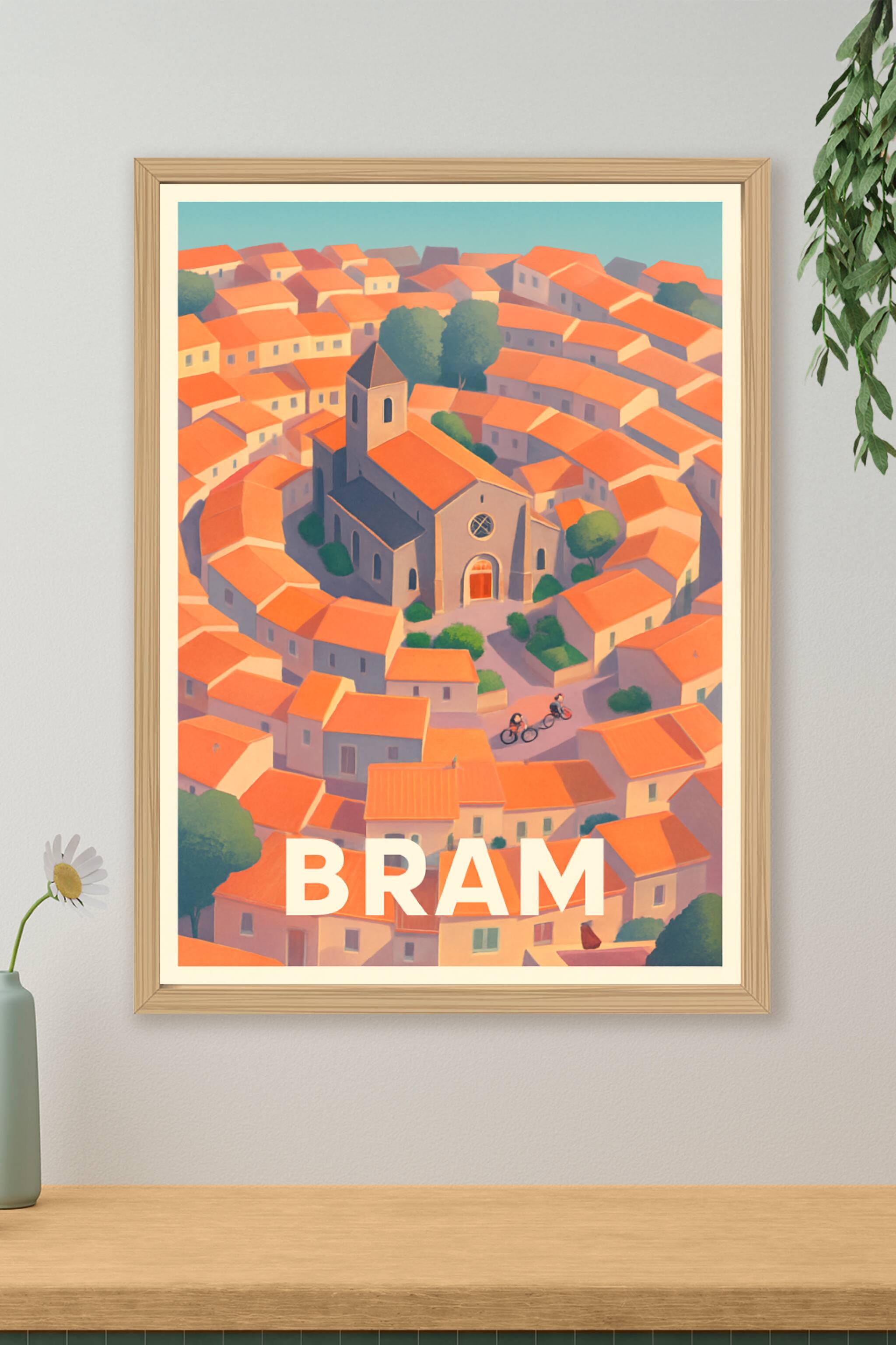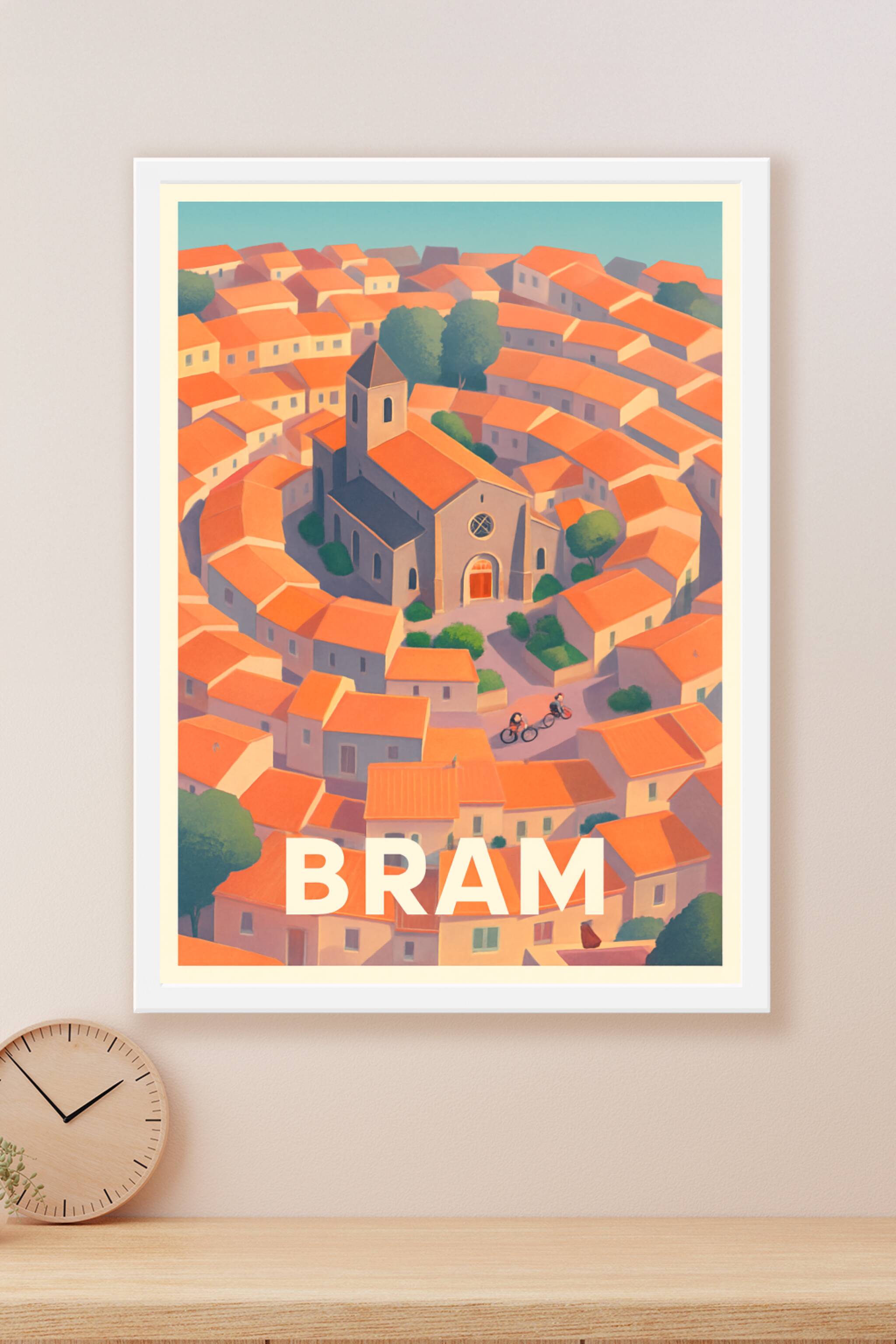 Découvrez l'atmosphère unique de Bram avec cette affiche illustrée représentant le cœur historique de la ville, où les maisons aux toits terracotta...