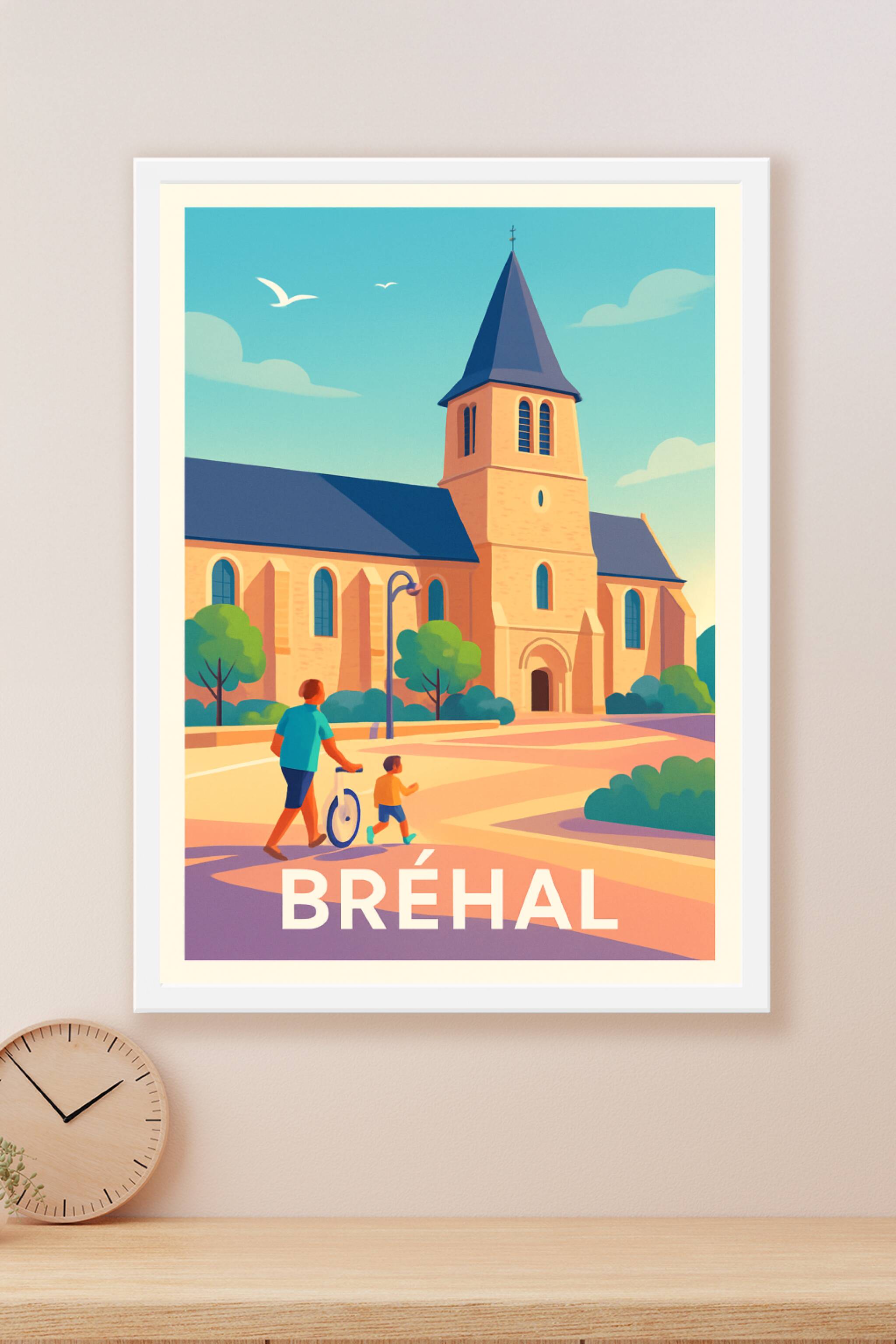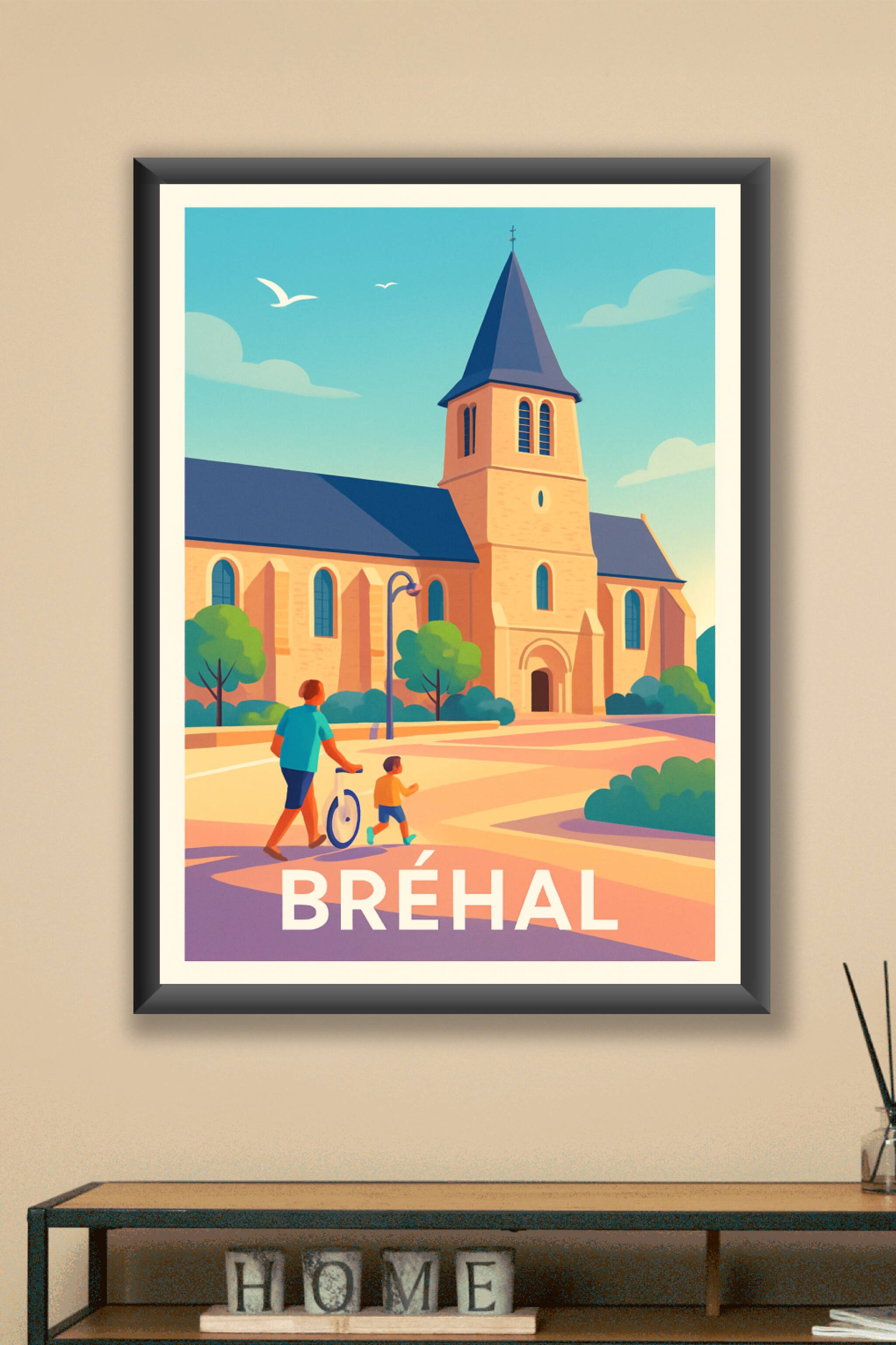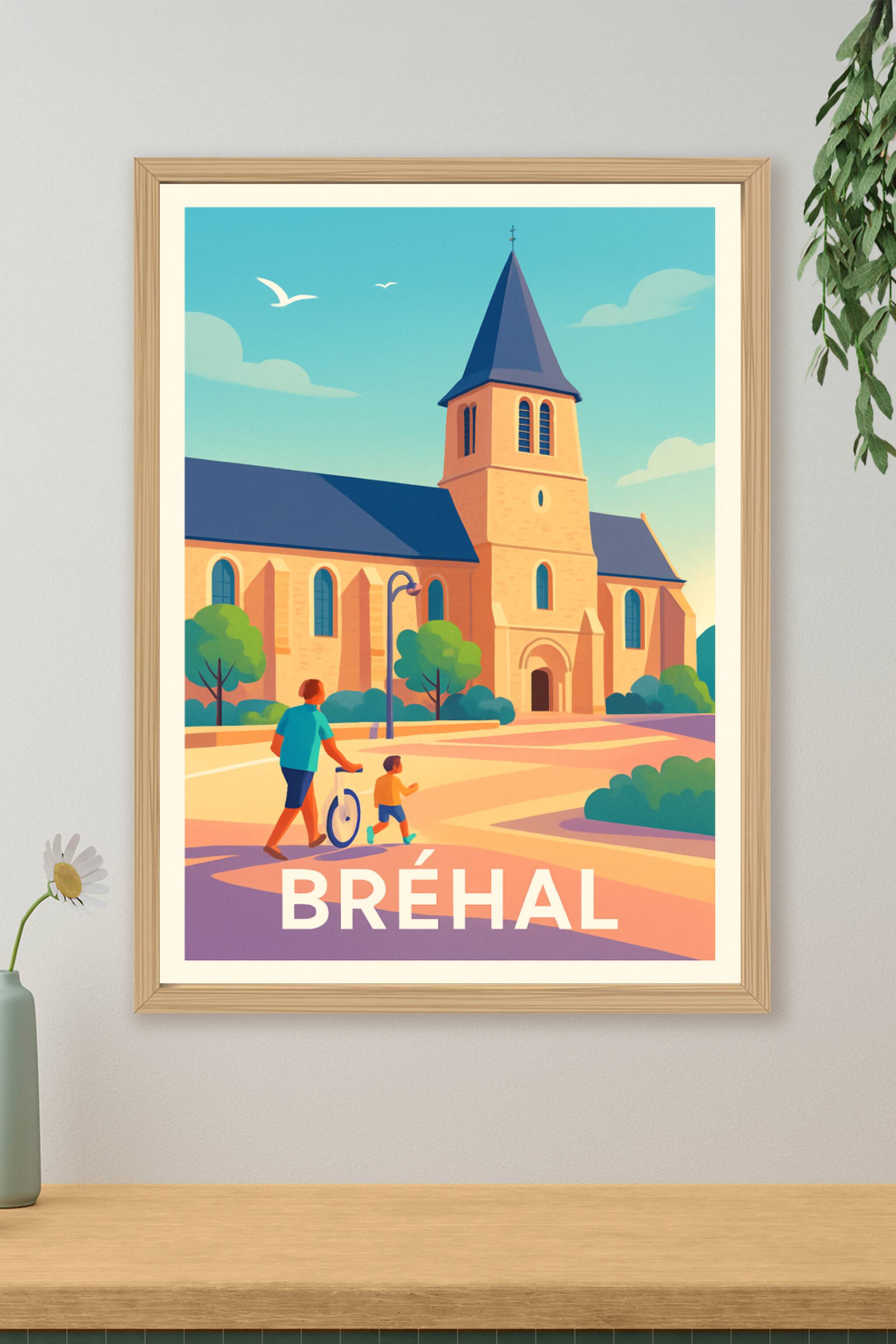 Découvrez l'atmosphère paisible et chaleureuse de Bréhal à travers cette affiche illustrée mettant en avant son architecture typique et ses rues ba...
