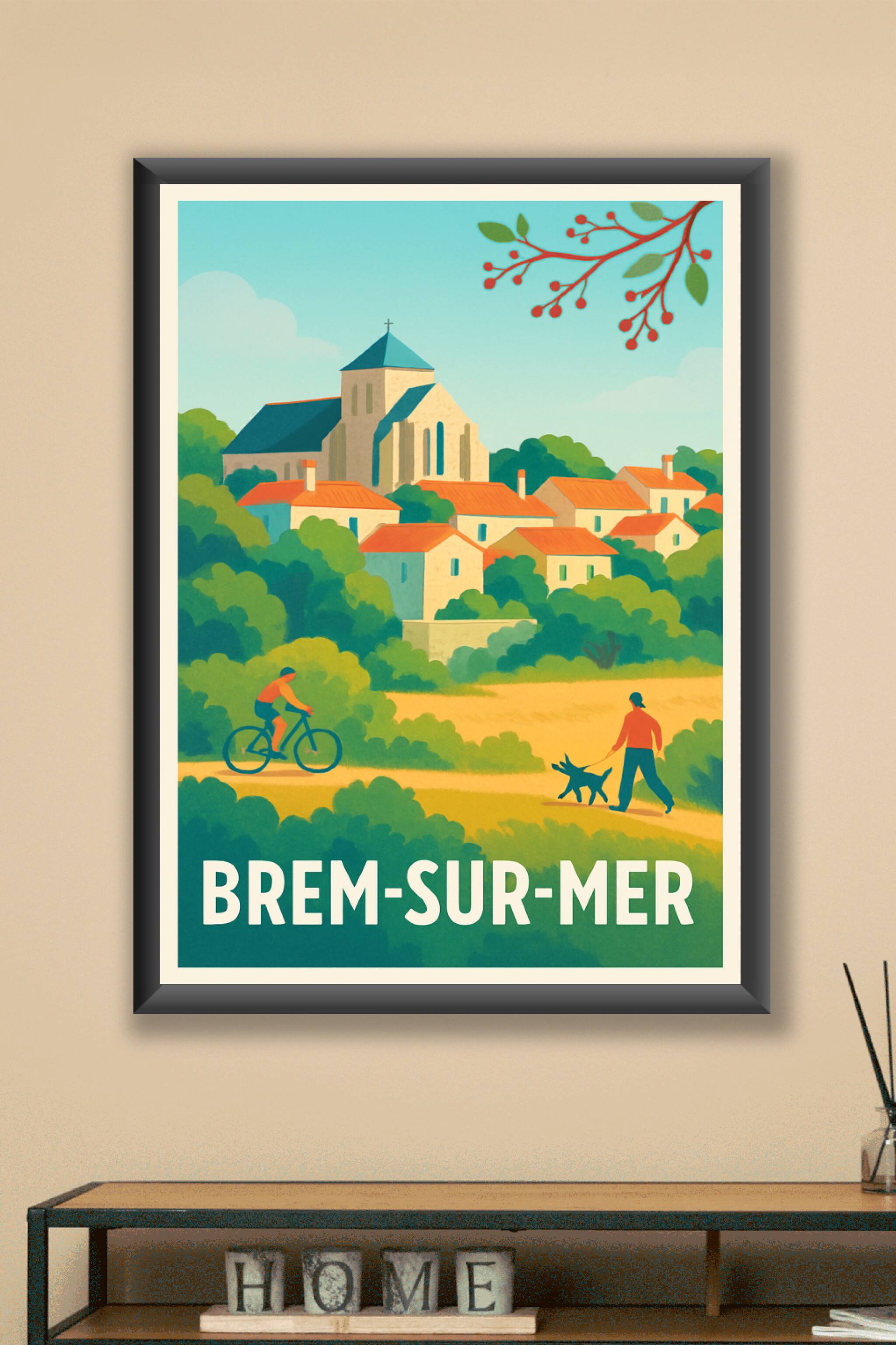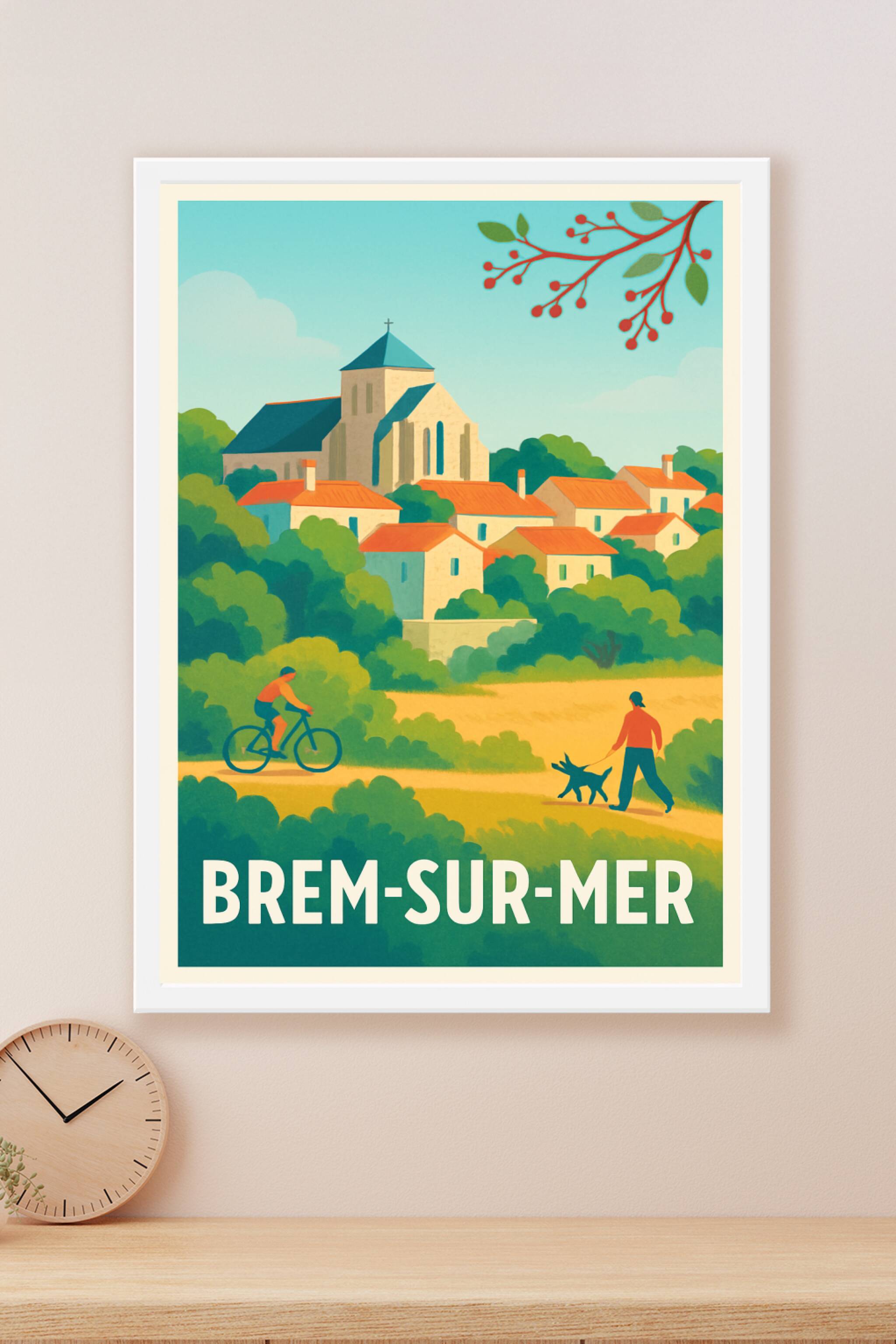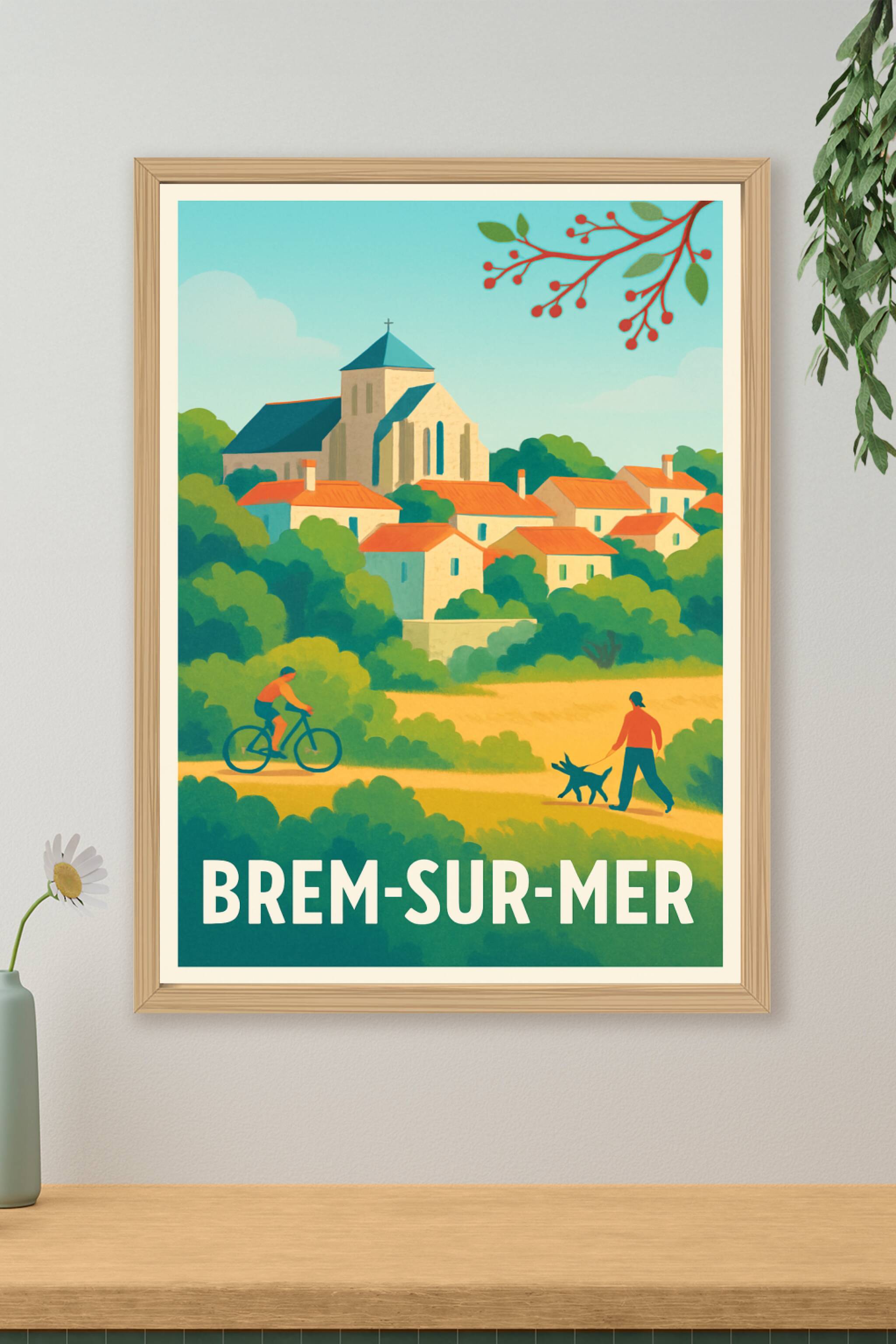 Découvrez la beauté paisible de Brem-sur-Mer avec cette affiche au design vintage évoquant un village pittoresque entre nature et patrimoine. Ce po...