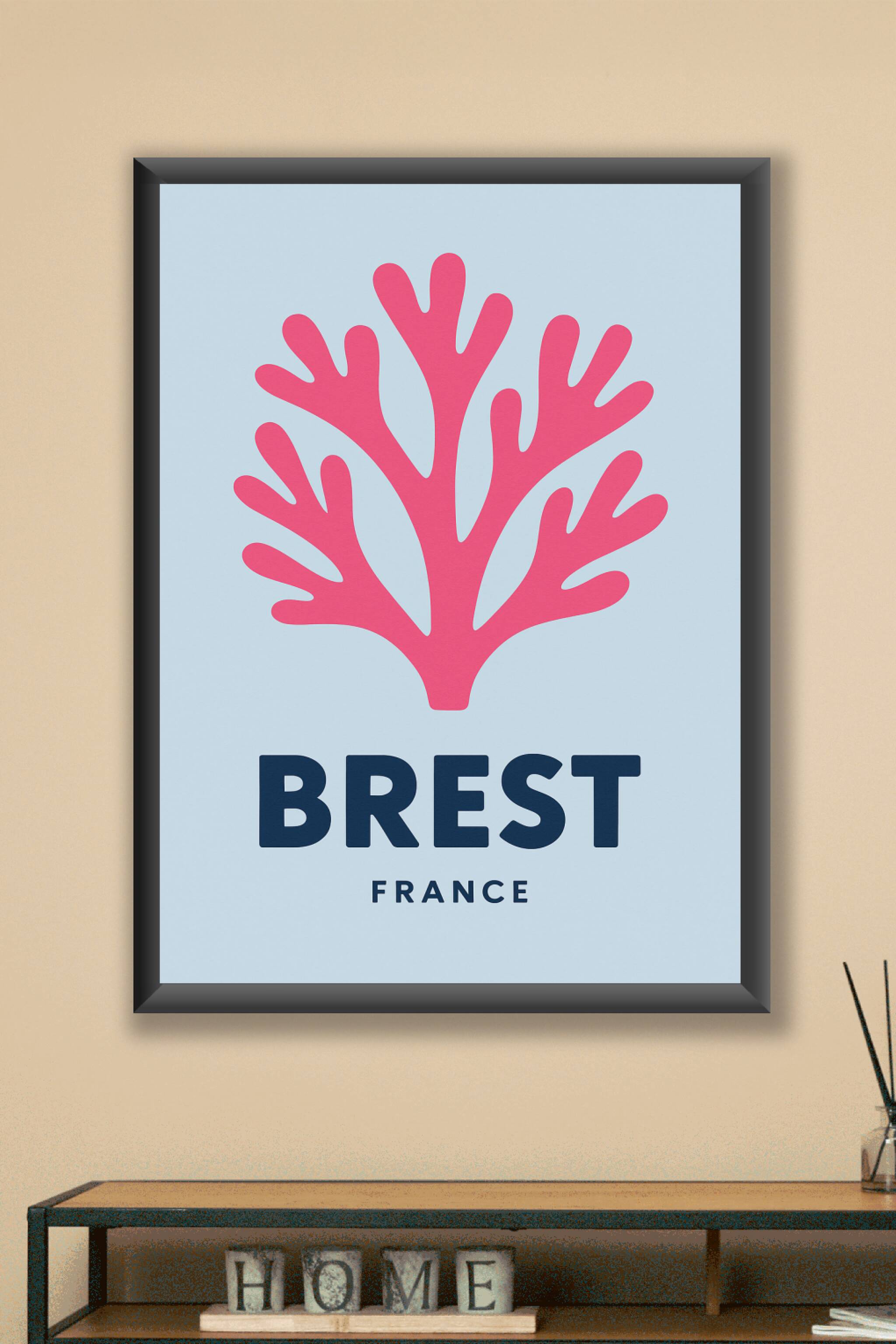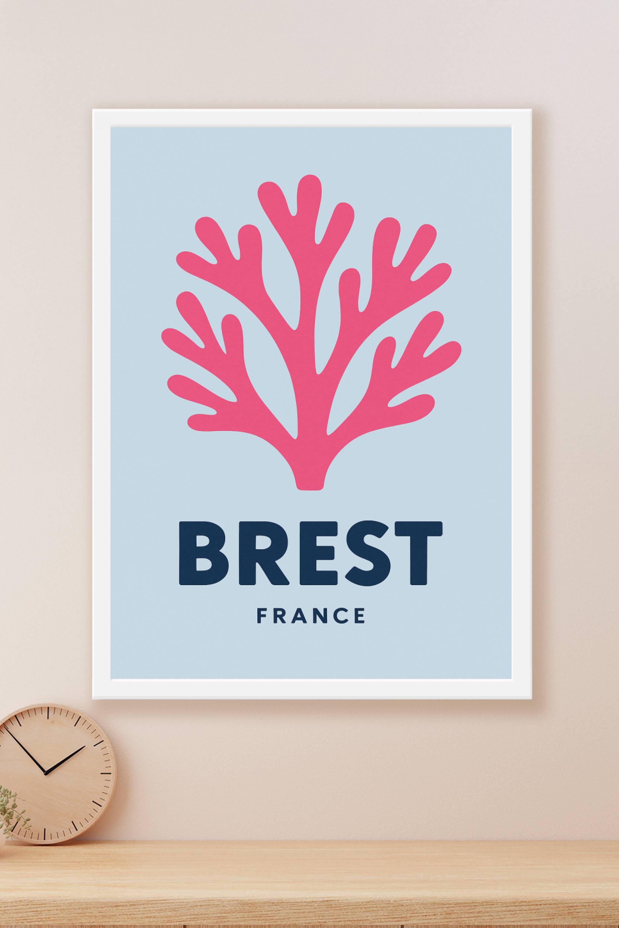 Apportez une touche de fraîcheur et d'originalité à votre décoration avec cette affiche illustrant un corail stylisé en rose vif sur fond bleu clair, symbole de la ville portuaire de Brest. Ce poster moderne et épuré capture l'esprit marin et l'authenticité brestoise. Imprimée en haute définition sur un papier couché brillant 250 g/m², cette affiche offre une qualité d'image nette et des couleurs durables qui sublimeront votre intérieur. Disponible en plusieurs dimensions allant de A1 à A4, avec ou sans cadre, elle s'adapte à tous les espaces pour décorer votre maison ou offrir un cadeau unique en lien avec Brest.