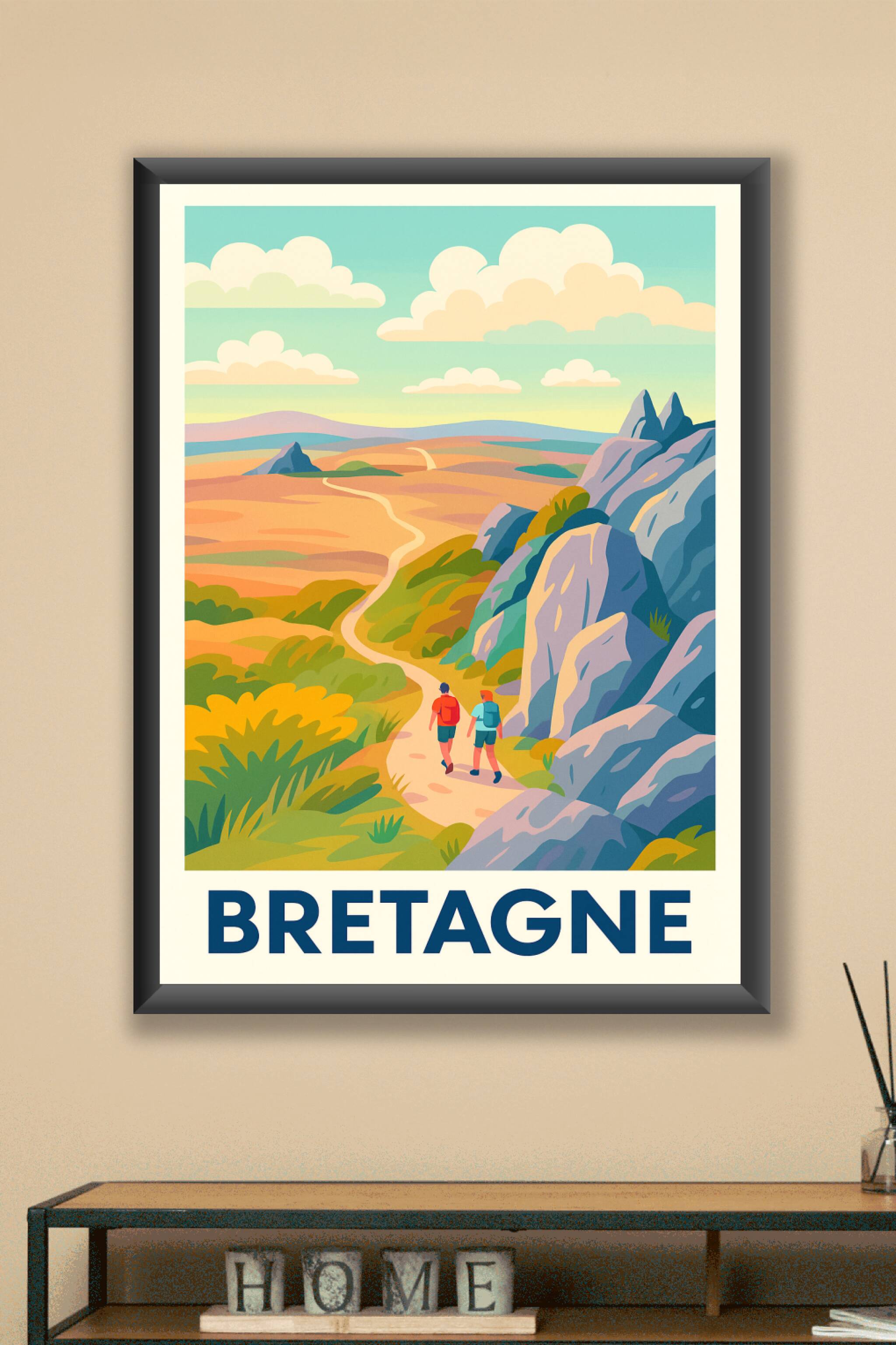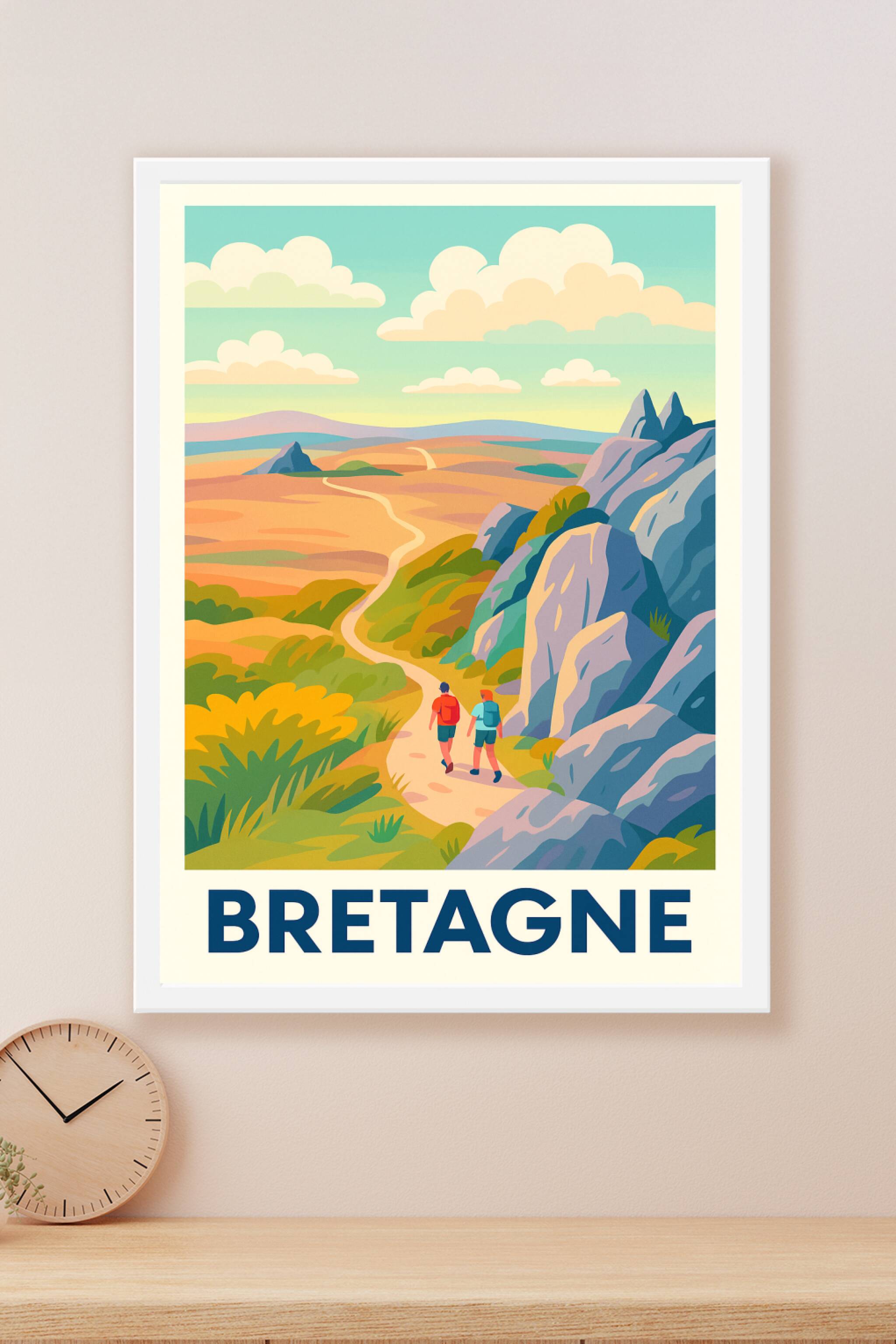 Découvrez la beauté sauvage des paysages bretons avec cette affiche illustrée aux couleurs douces et vivantes. Cette scène invite à l'aventure et à la promenade sur les sentiers parmi rochers et landes. Disponible sous forme de poster en tirage "Fine Art" sur papier 305g coton, cette affiche garantit une qualité d'impression exceptionnelle et une résistance dans le temps. Proposée en plusieurs formats allant de A1 à A4, avec ou sans cadre, elle s'adapte parfaitement à votre décoration intérieure. Apportez une touche d'évasion à votre intérieur avec cette magnifique affiche Bretagne, idéale pour les amateurs de nature et de grand air.
