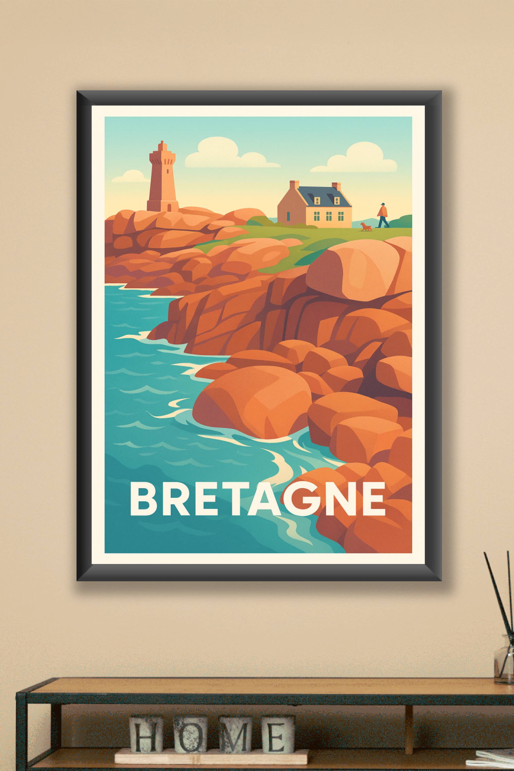 Évadez-vous avec cette affiche illustrée représentant les célèbres côtes bretonnes, où se dressent fièrement les rochers rouges et un phare embléma...
