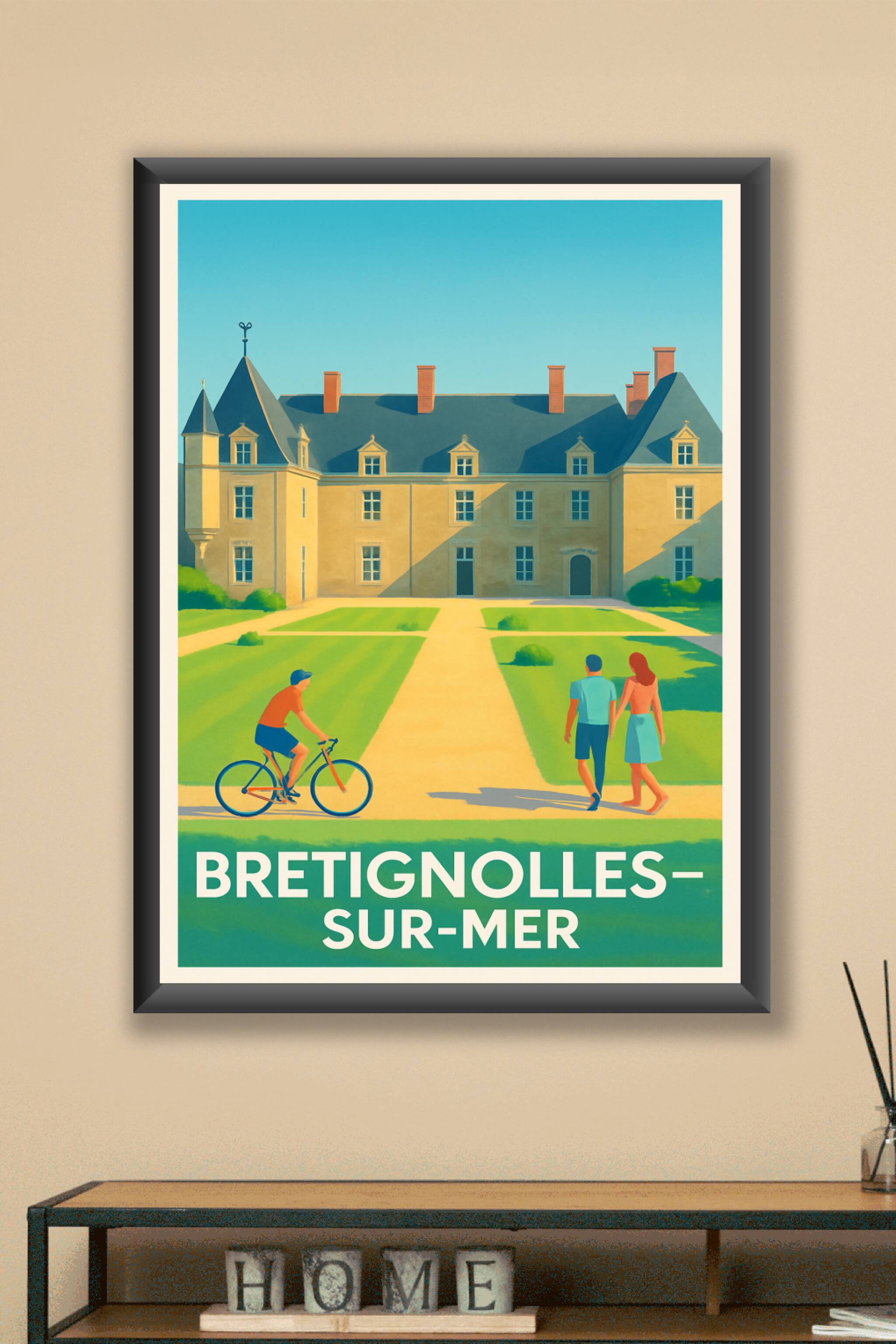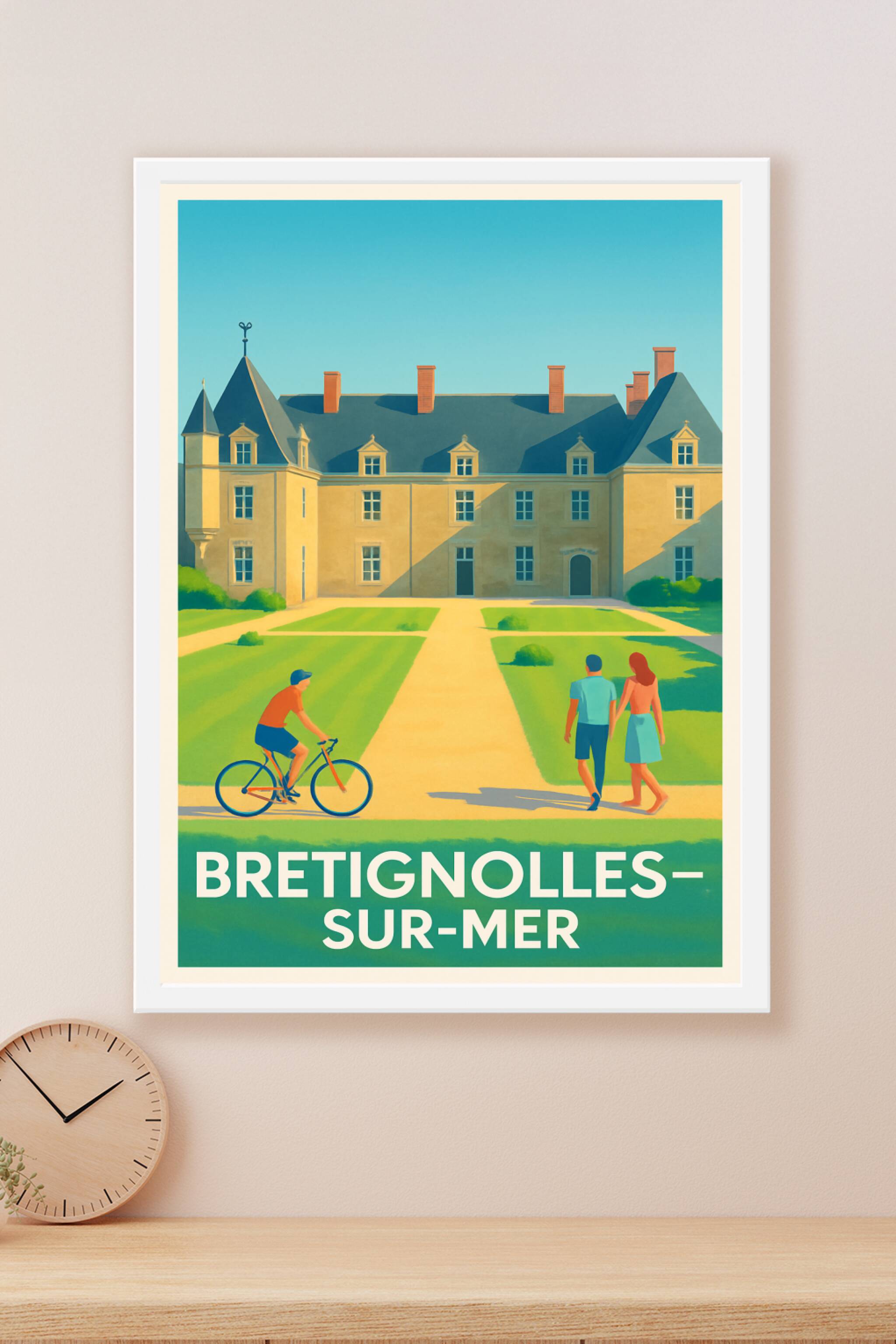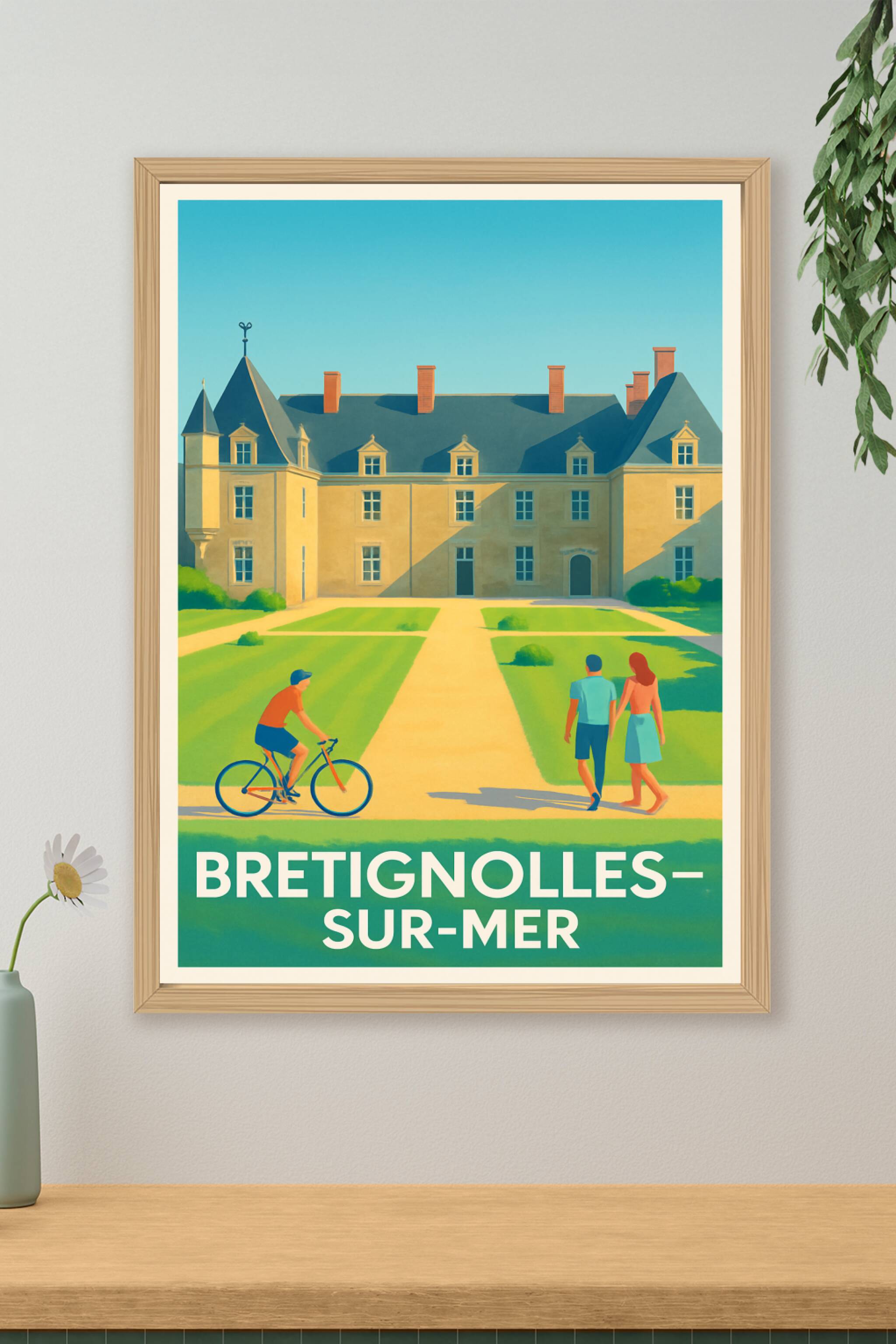 Découvrez l'élégance paisible de Bretignolles-sur-Mer avec cette affiche au style vintage qui met en scène un manoir emblématique baigné par la lum...