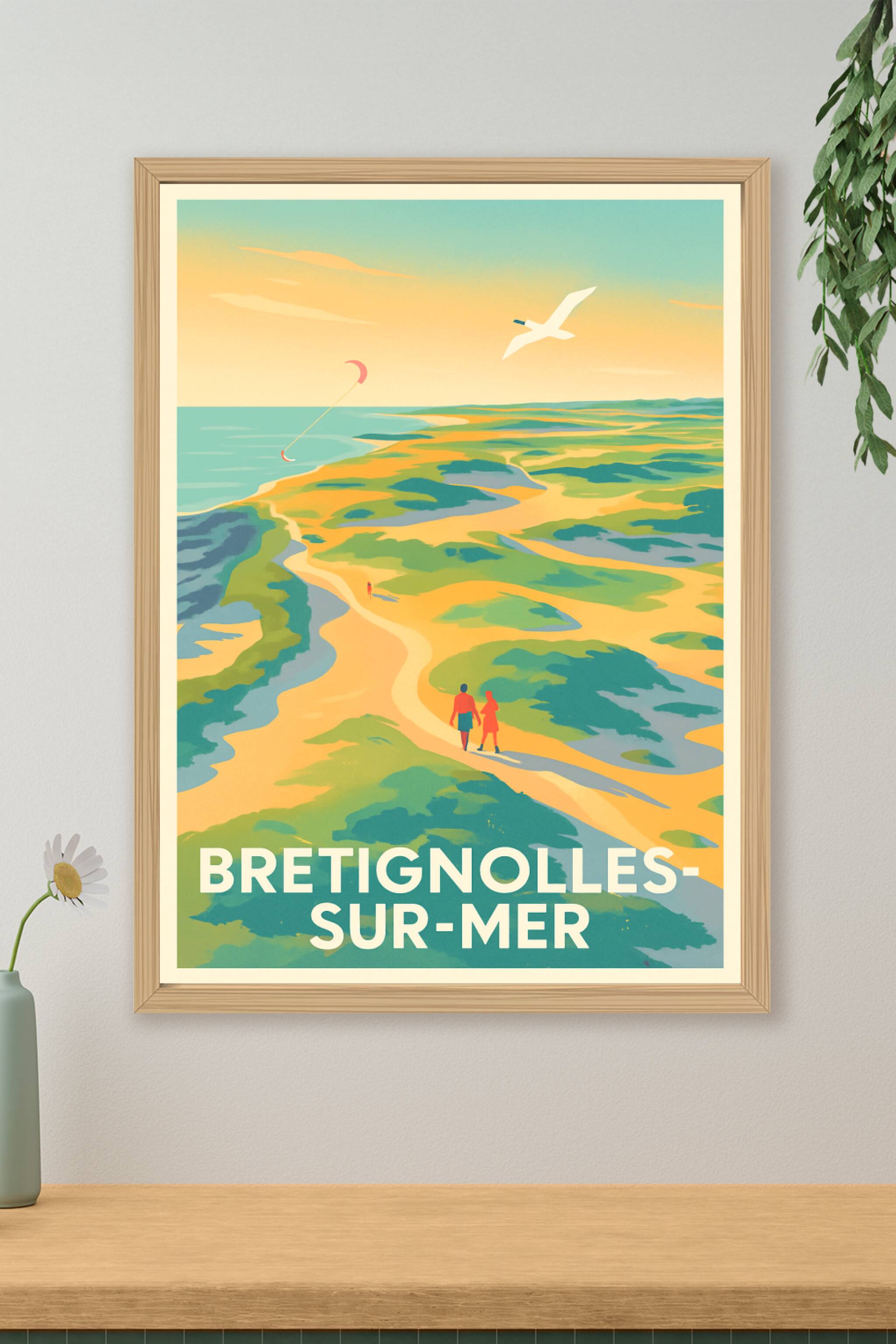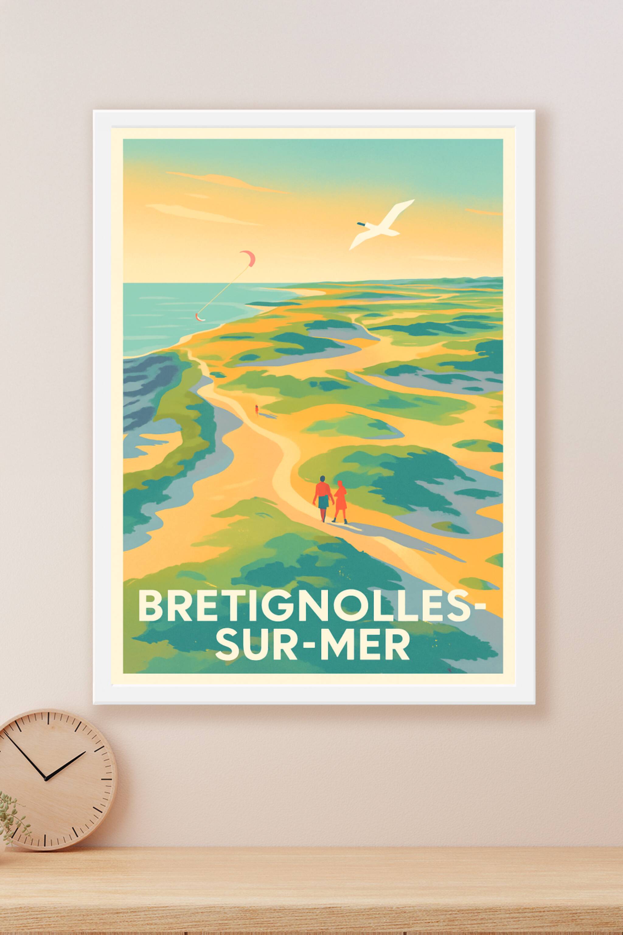 Découvrez la quiétude et la beauté naturelle de Bretignolles-sur-Mer avec cette affiche au design vintage évoquant les paysages marins et les balad...