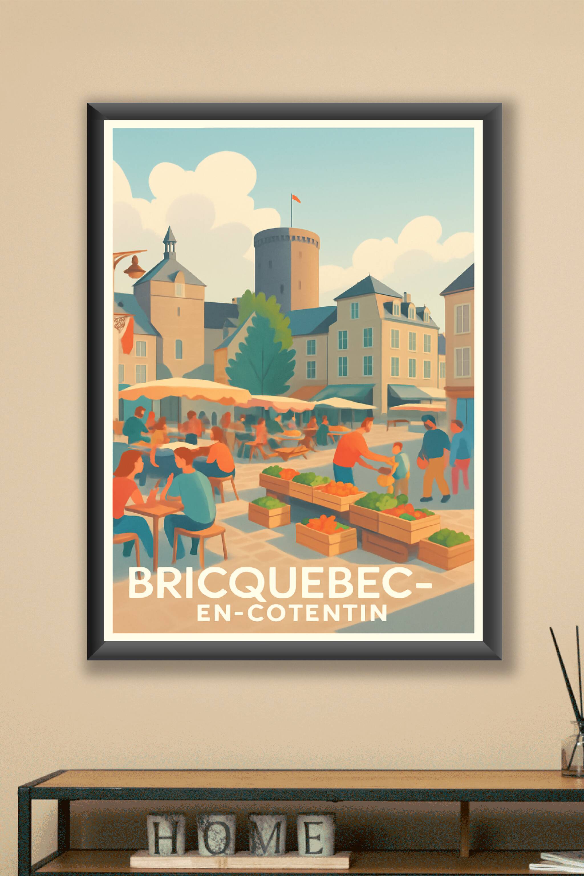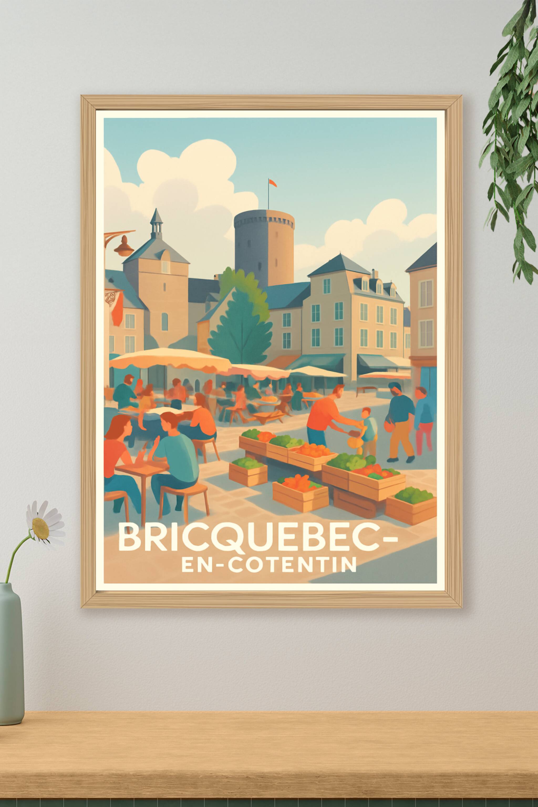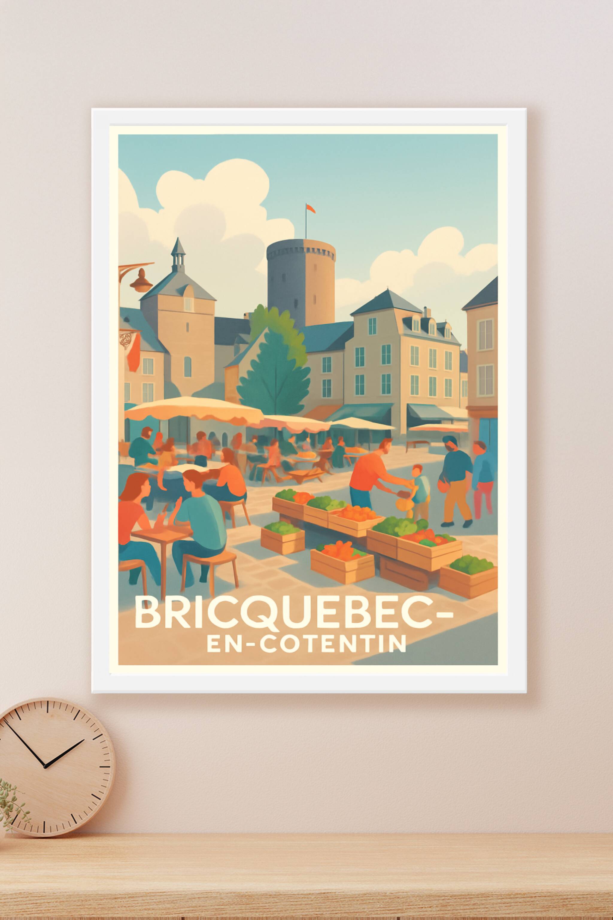 Découvrez l'esprit chaleureux et animé de Bricquebec-en-Cotentin avec cette affiche illustrée qui met en scène un marché ensoleillé, où habitants e...