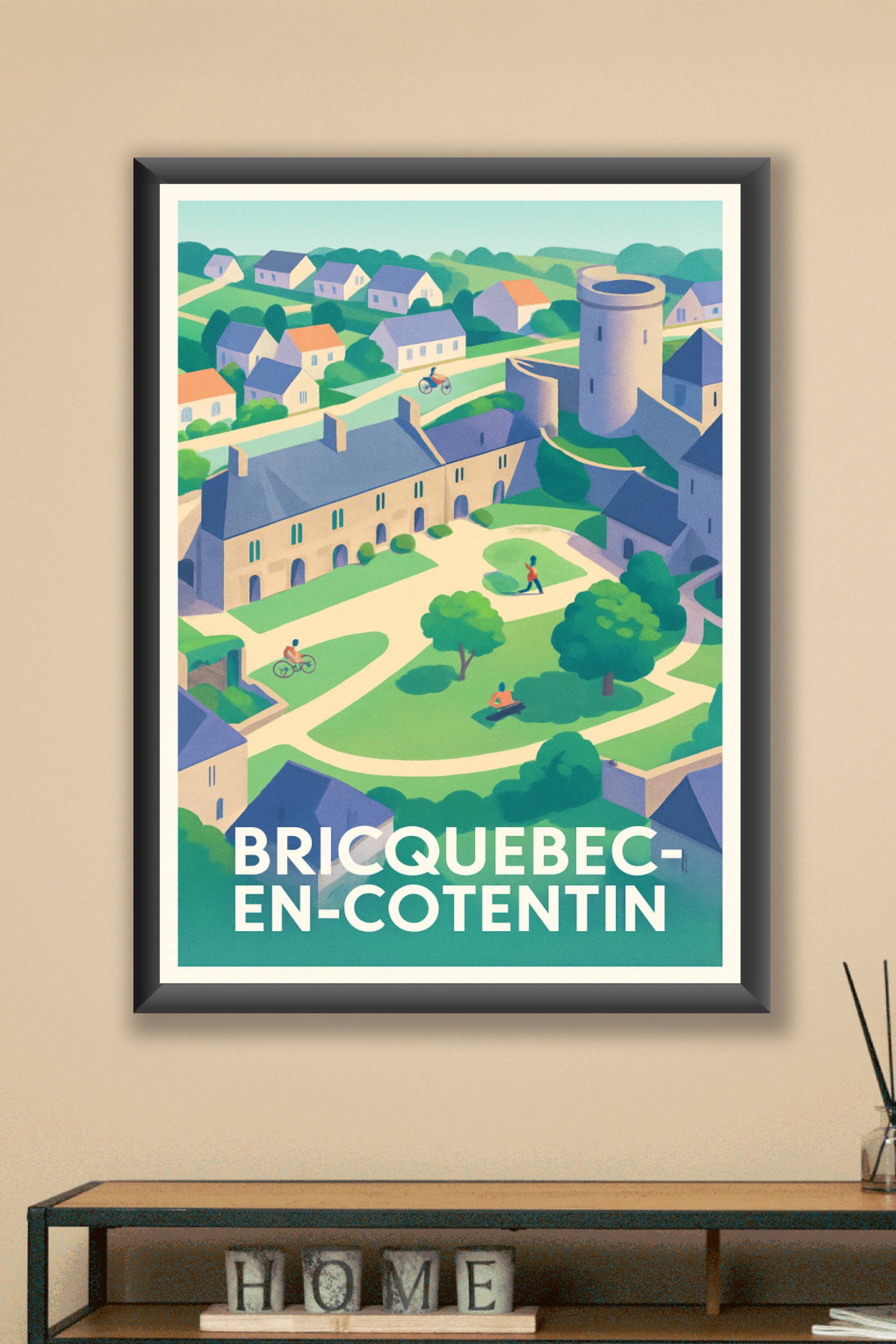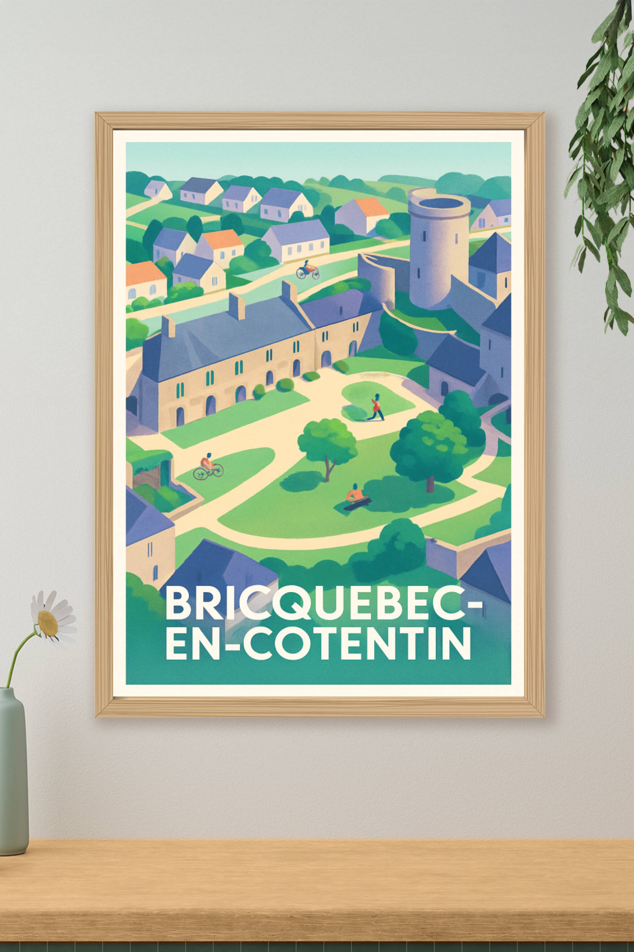 Découvrez le charme paisible de Bricquebec-en-Cotentin à travers cette affiche illustrée aux couleurs douces et lumineuses, mettant en valeur ses m...