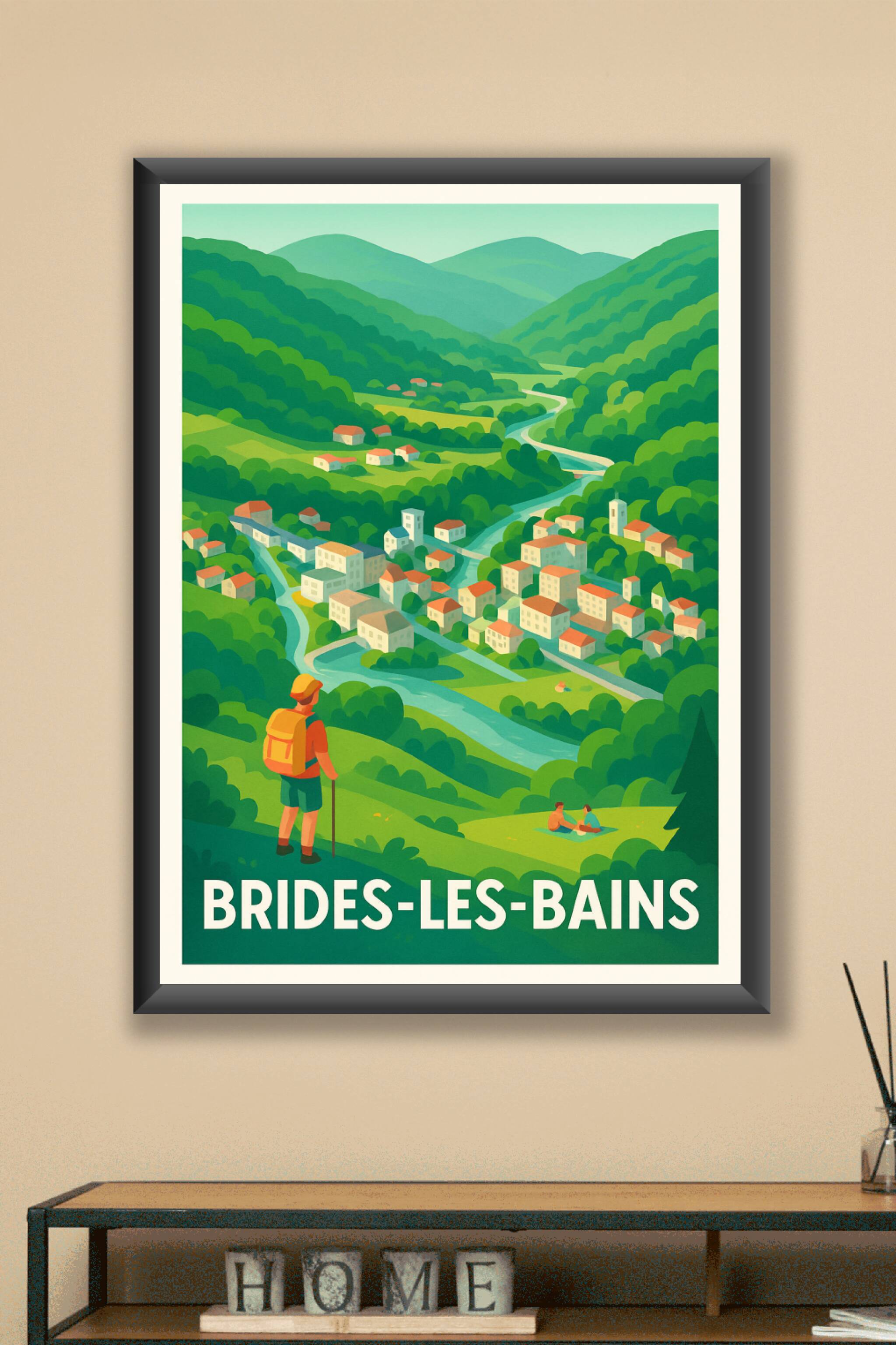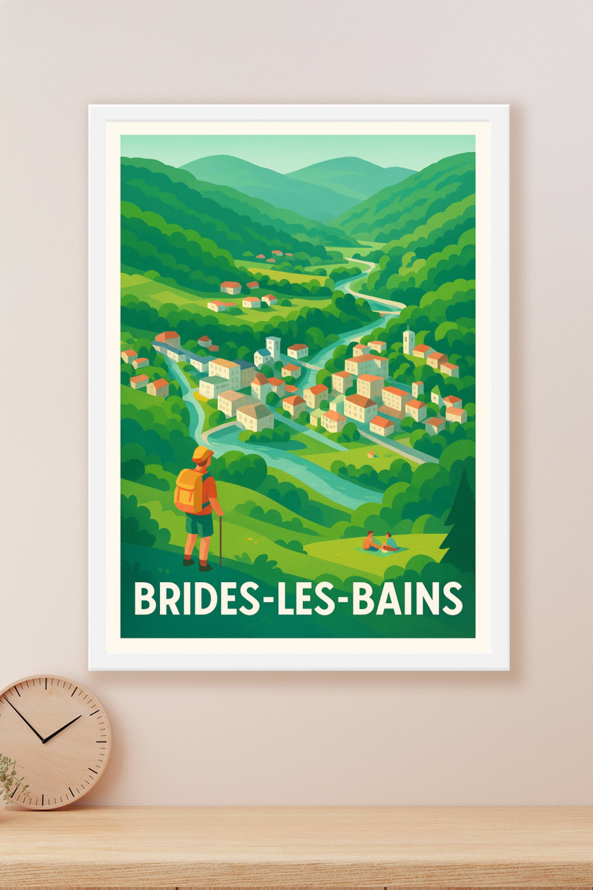 Découvrez la beauté paisible de Brides-les-Bains avec cette affiche illustrée au style rétro, parfaite pour les amoureux de randonnée et de paysage...