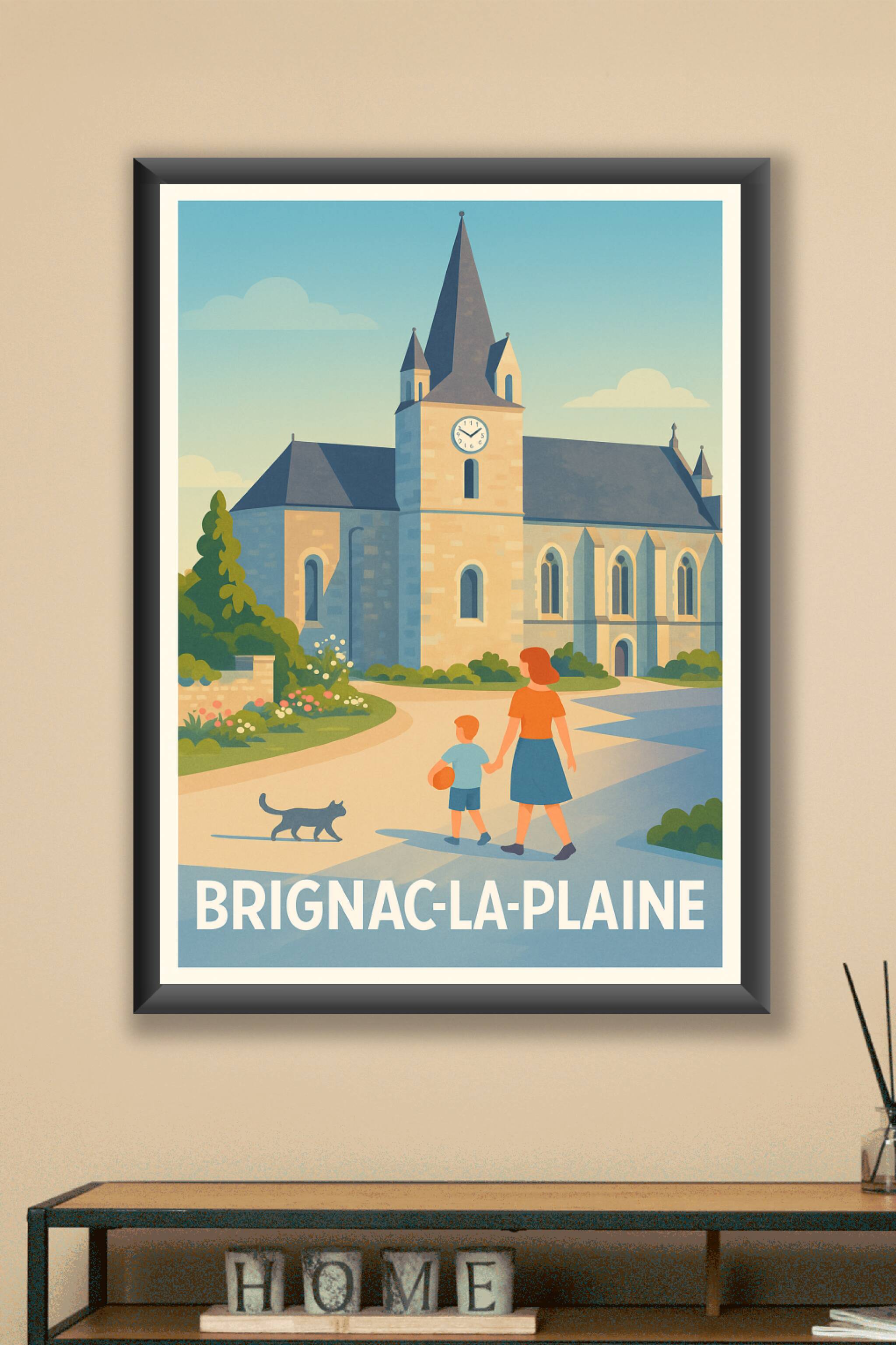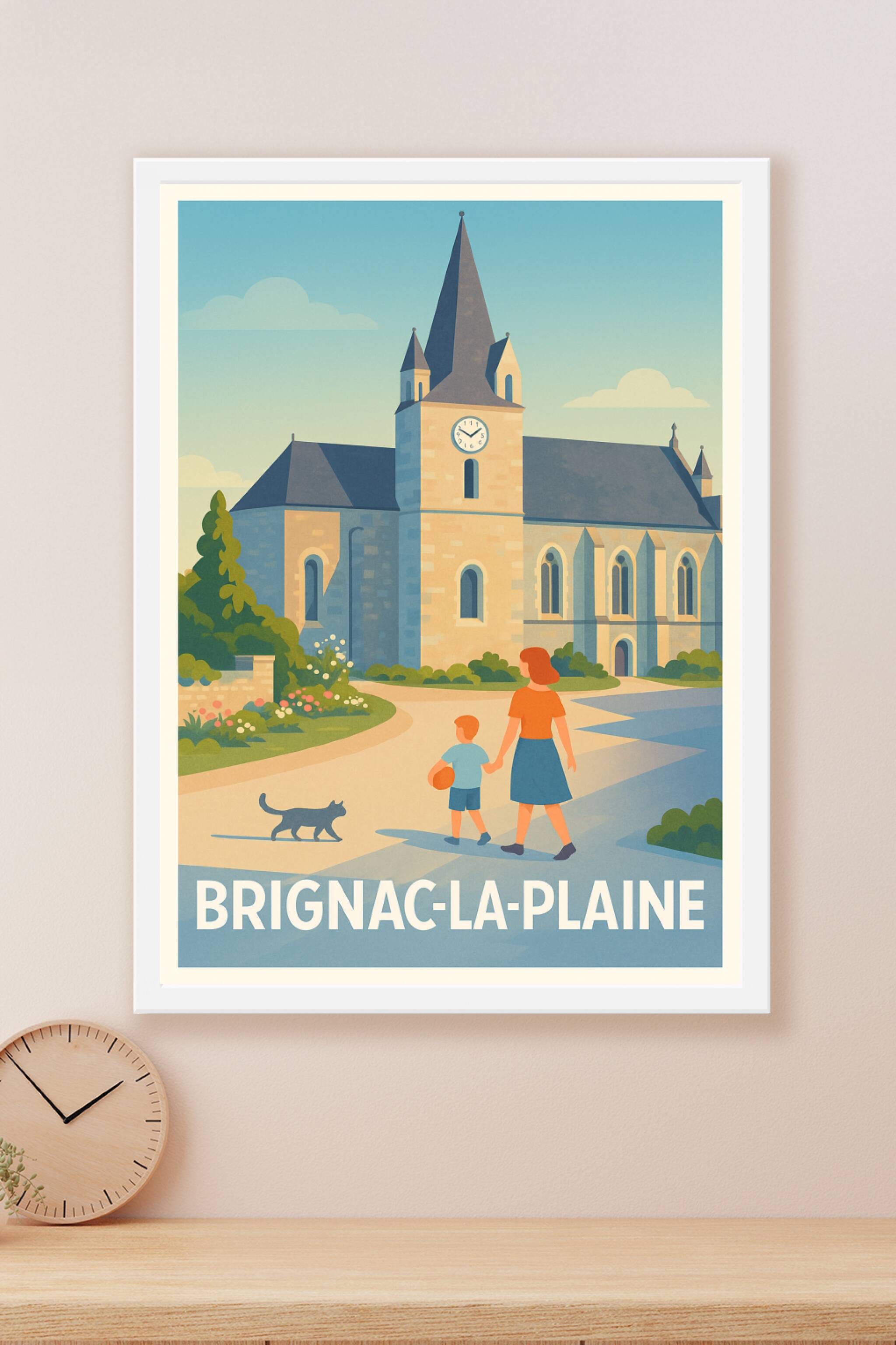 Découvrez la quiétude et le charme authentique de Brignac-la-Plaine avec cette affiche illustrée représentant une scène paisible devant son église ...