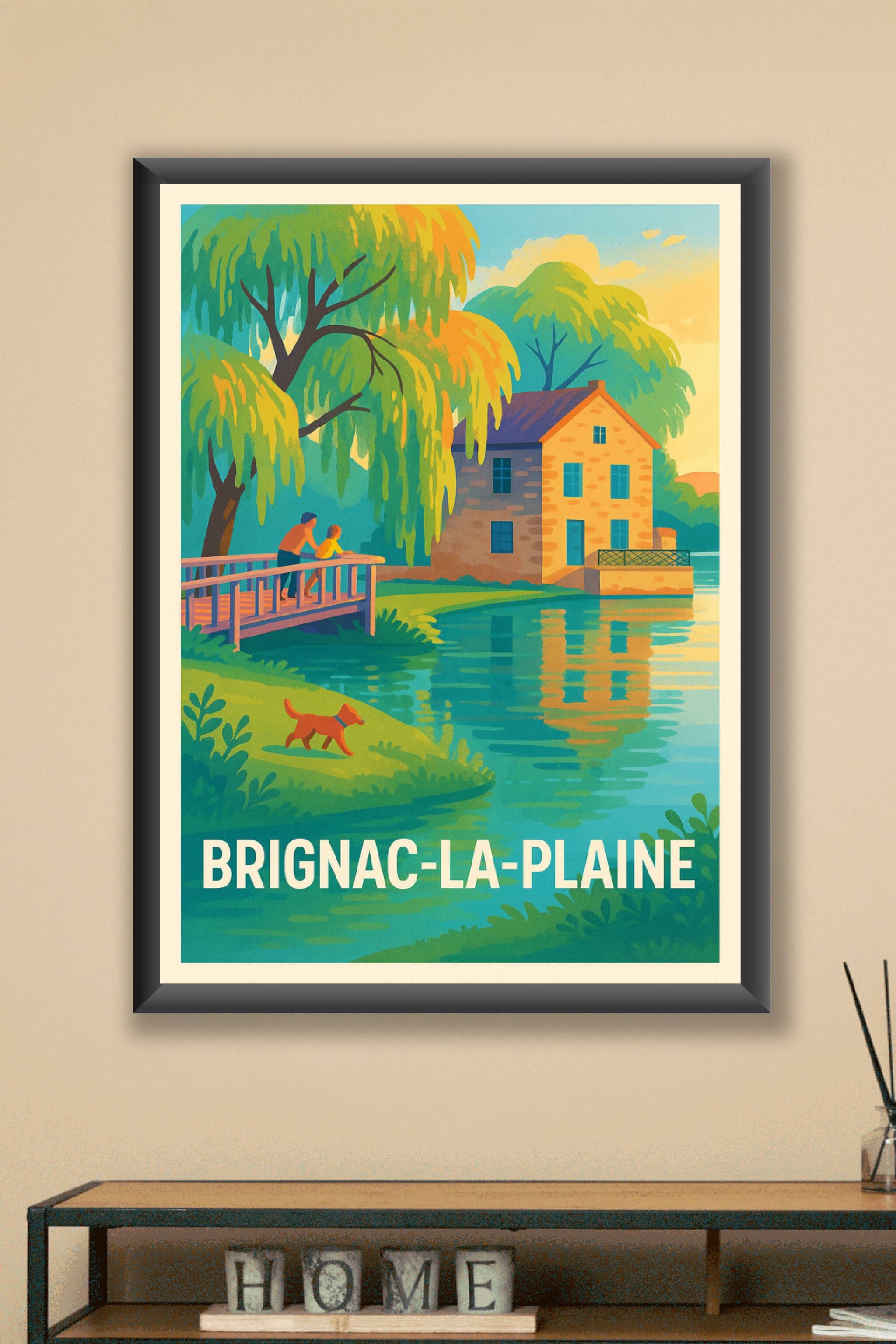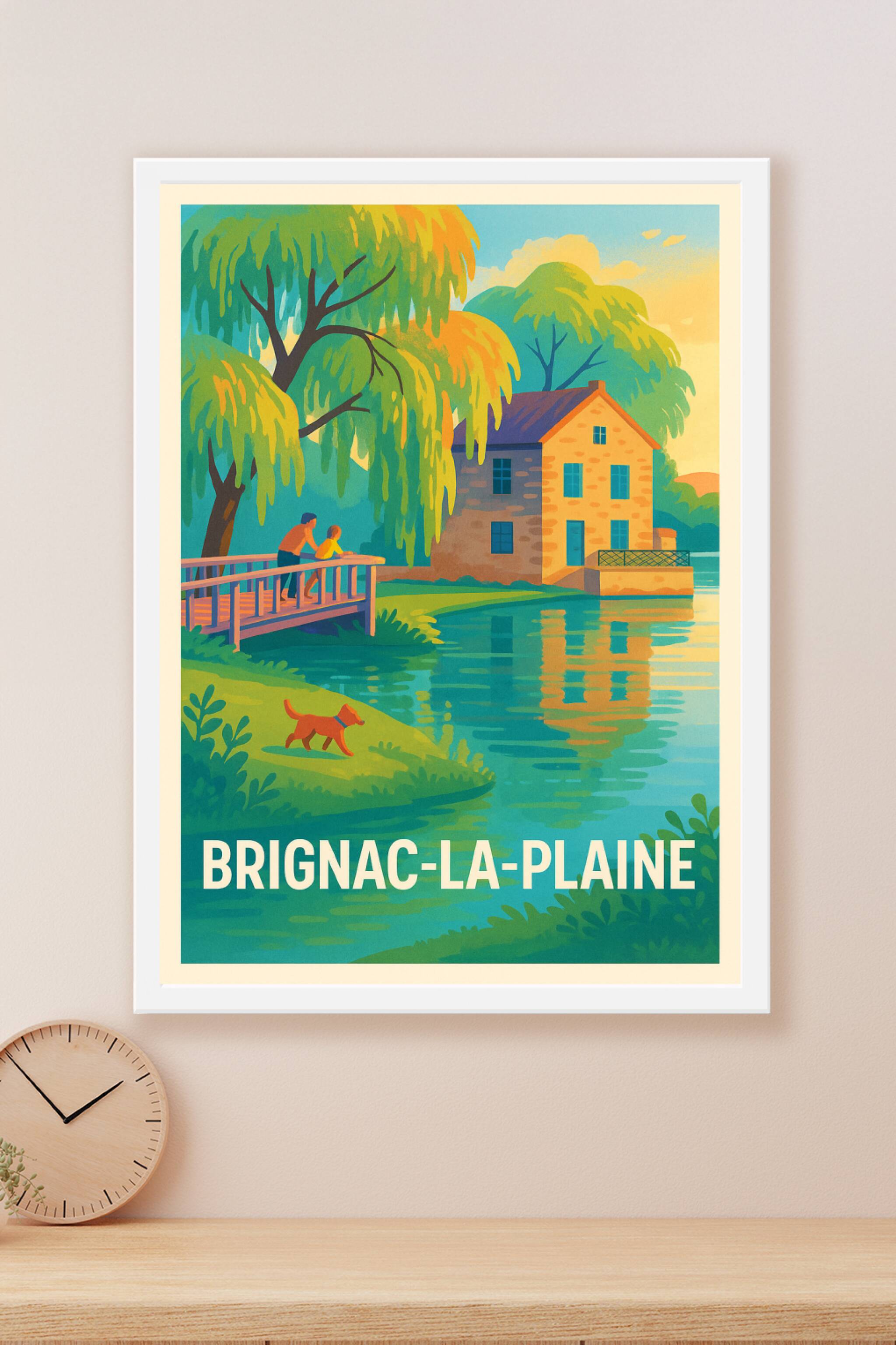 Découvrez la quiétude bucolique de Brignac-la-Plaine avec cette magnifique affiche illustrée mettant en scène une maison au charme champêtre au bor...