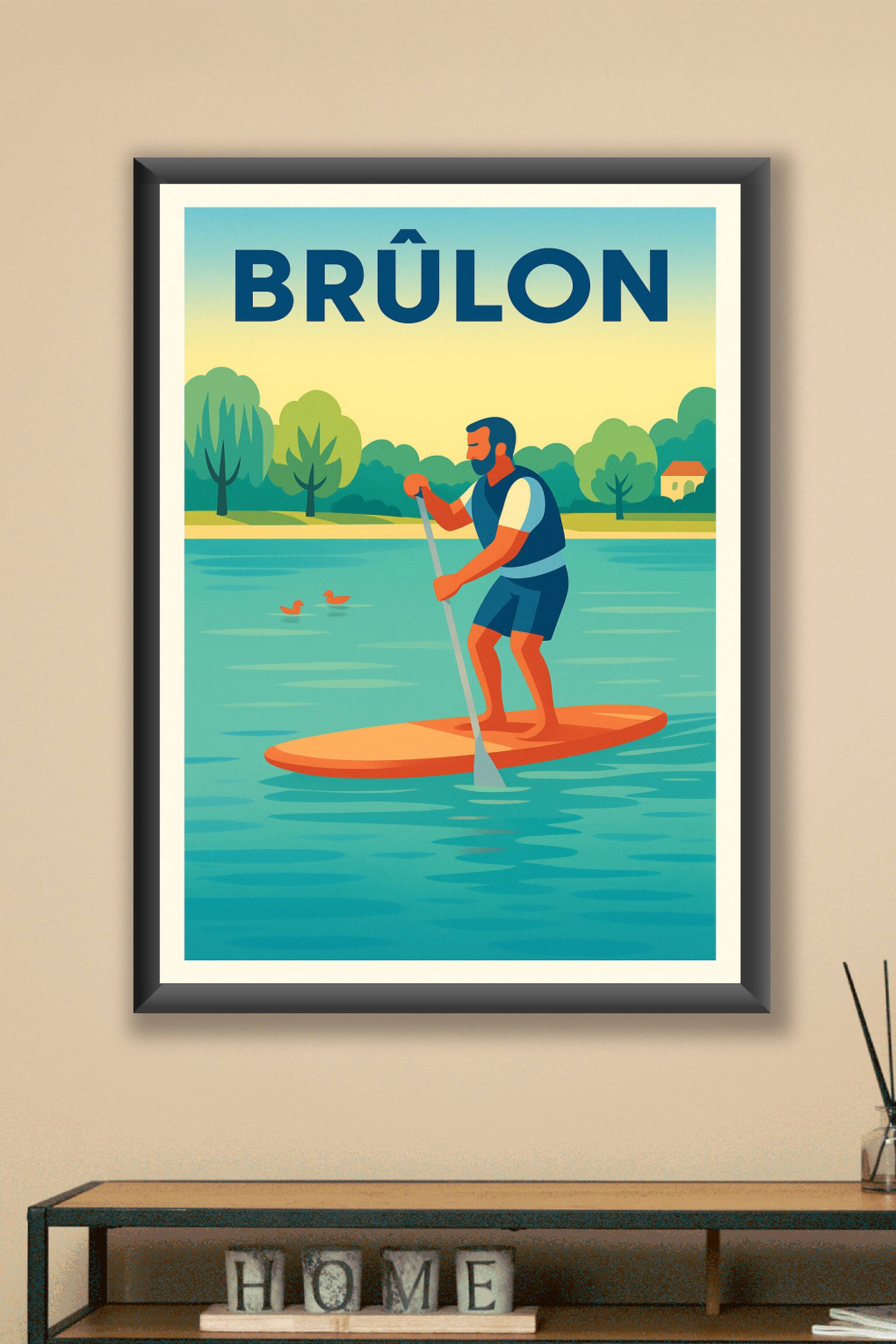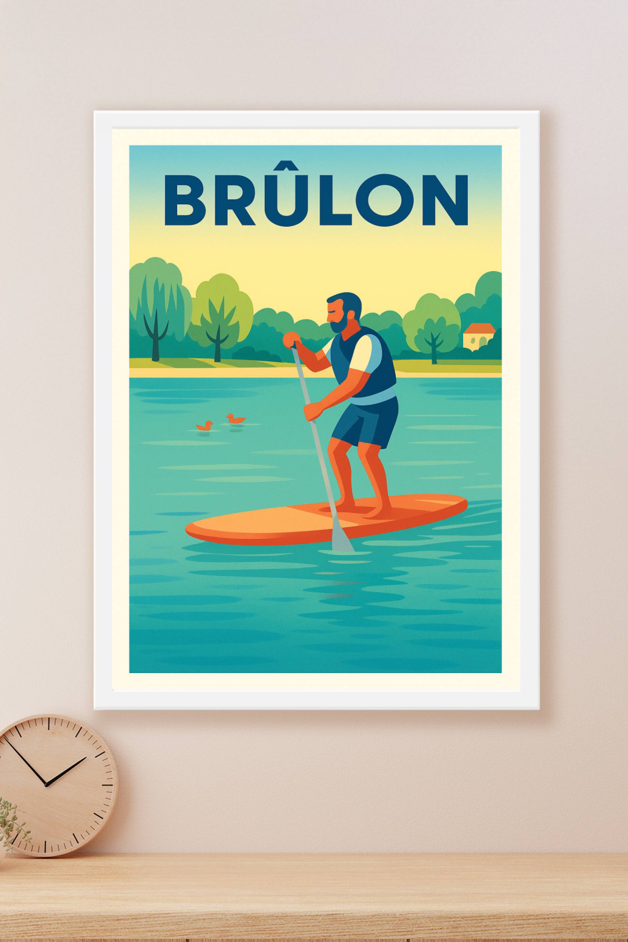 Découvrez l'ambiance paisible et rafraîchissante de Brûlon avec cette affiche illustrée mettant en scène une balade en paddle sur une étendue d'eau...