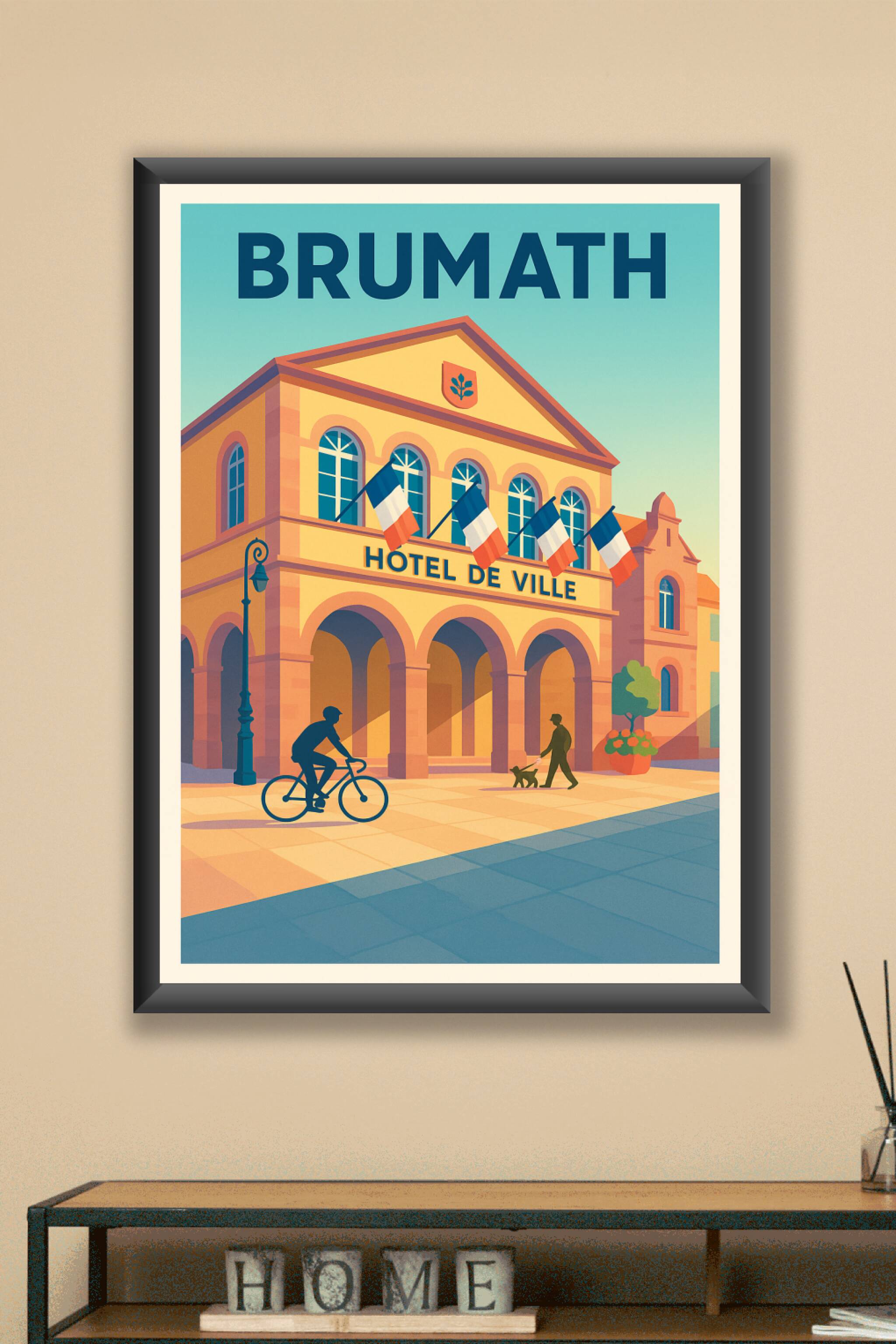 Découvrez l'élégance intemporelle de Brumath à travers cette affiche illustrée mettant en scène l'Hôtel de Ville et ses drapeaux français flottant ...