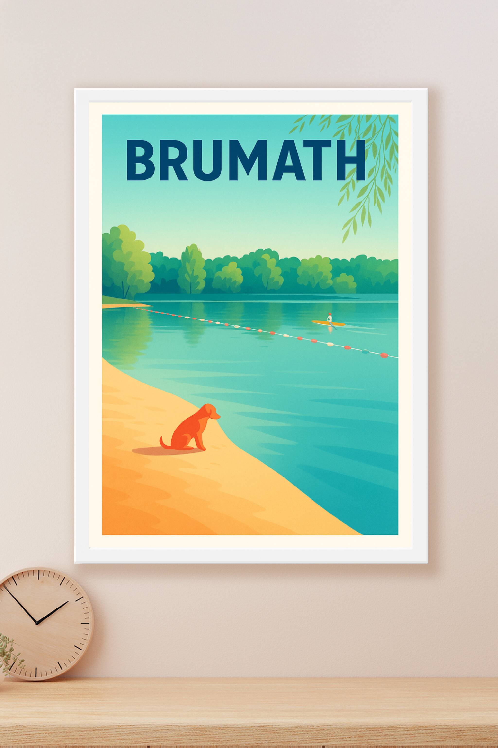 Découvrez la douceur et la sérénité de Brumath avec cette affiche au style vintage illustrant une scène tranquille au bord d'un lac, où un chien contemple l'eau tandis qu'un kayakiste glisse en arrière-plan. Ce poster, avec ses couleurs apaisantes et son ambiance champêtre, apportera une touche de calme et de naturel à votre intérieur. Imprimé en tirage "Fine Art" sur un papier de 305g coton, il garantit une qualité d'impression exceptionnelle, des couleurs profondes et une longévité remarquable. Disponible en formats A1 à A4, avec ou sans cadre, cette affiche est parfaite pour sublimer votre décoration ou offrir un souvenir élégant de Brumath.