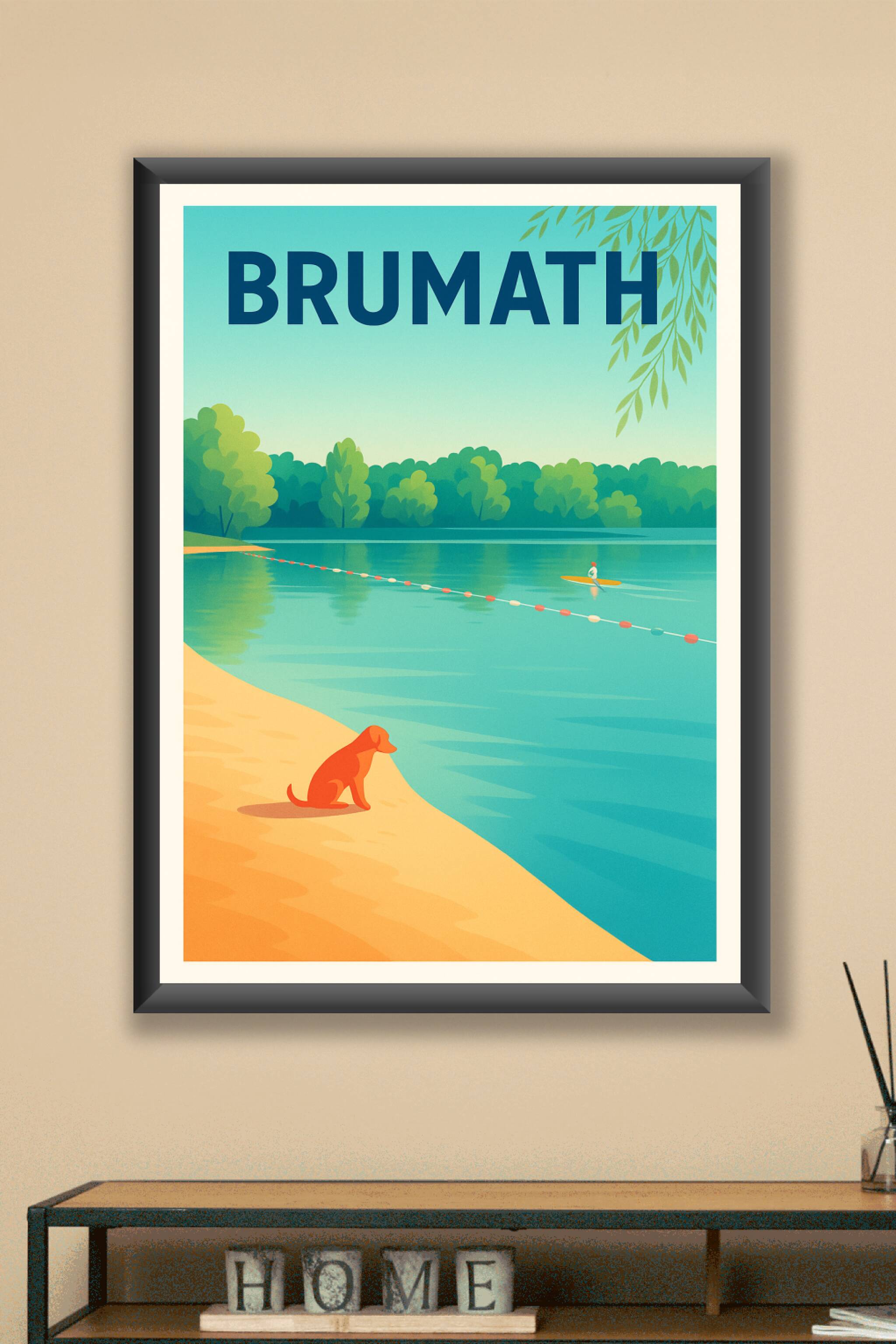 Découvrez la douceur et la sérénité de Brumath avec cette affiche au style vintage illustrant une scène tranquille au bord d'un lac, où un chien co...