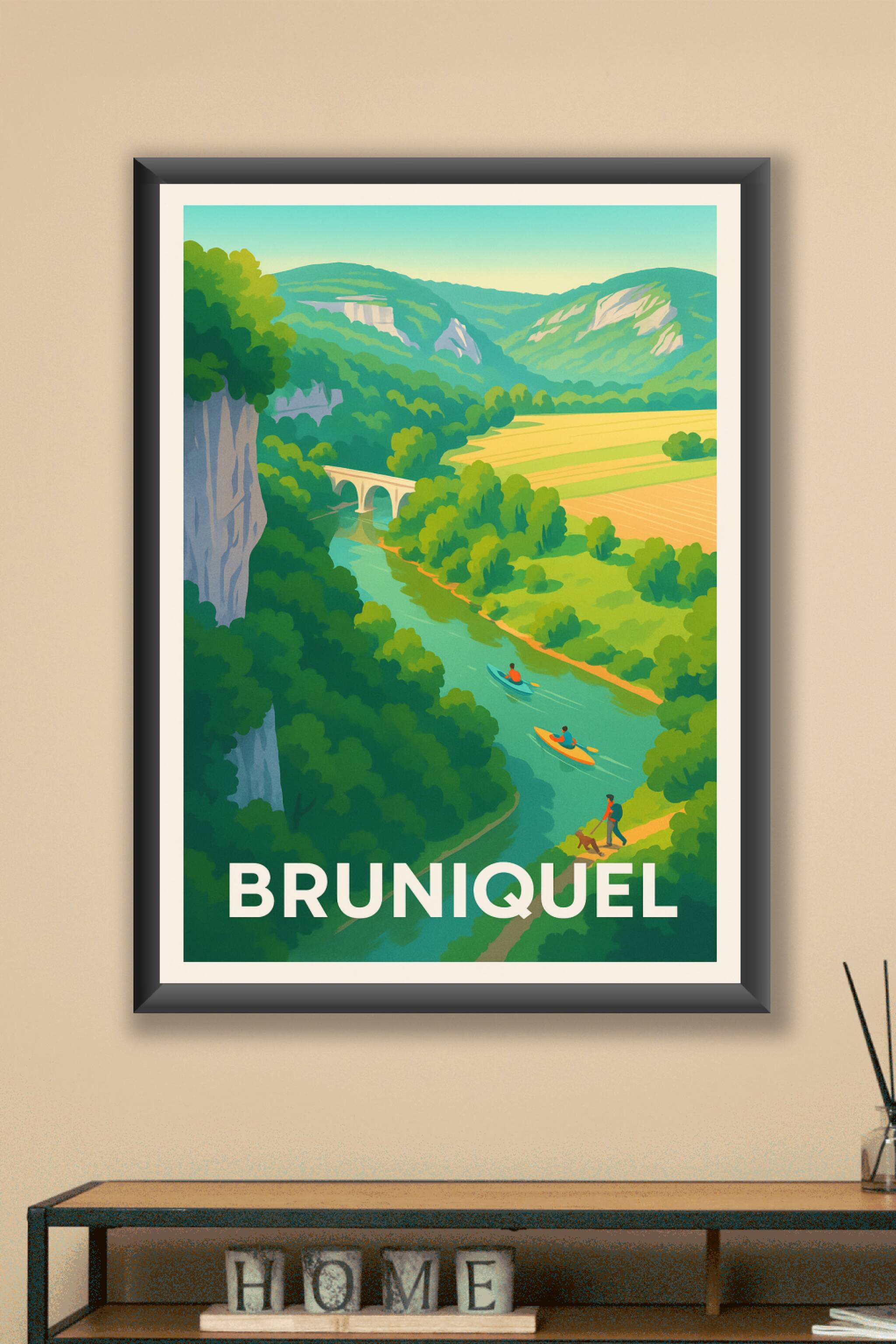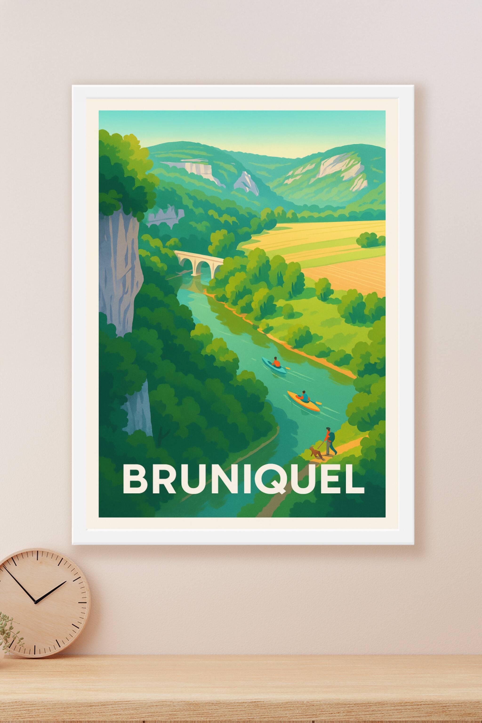 Découvrez la beauté authentique de Bruniquel avec cette affiche illustrée mettant en scène une vallée verdoyante traversée par une rivière où canoë...