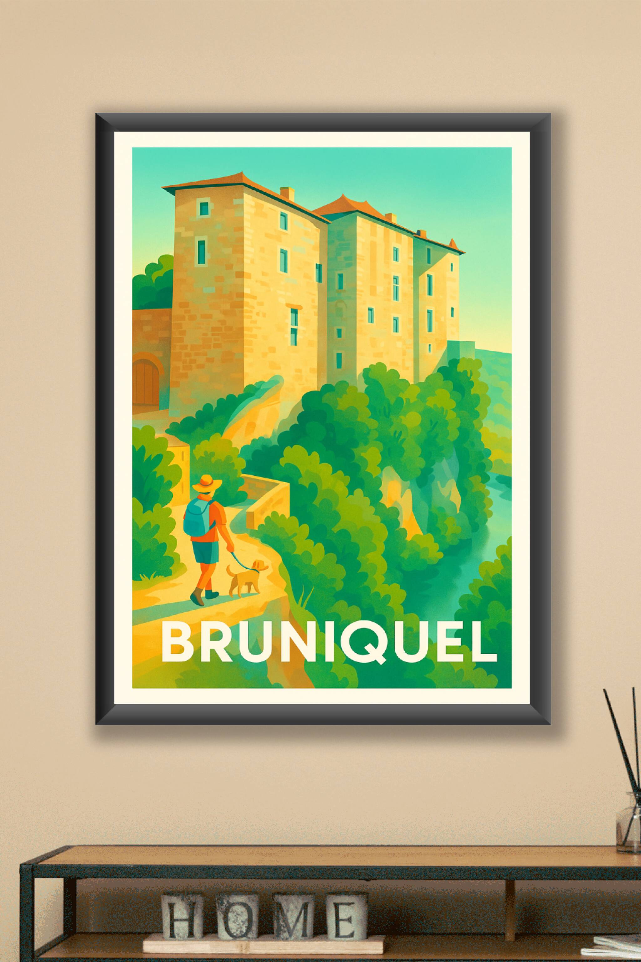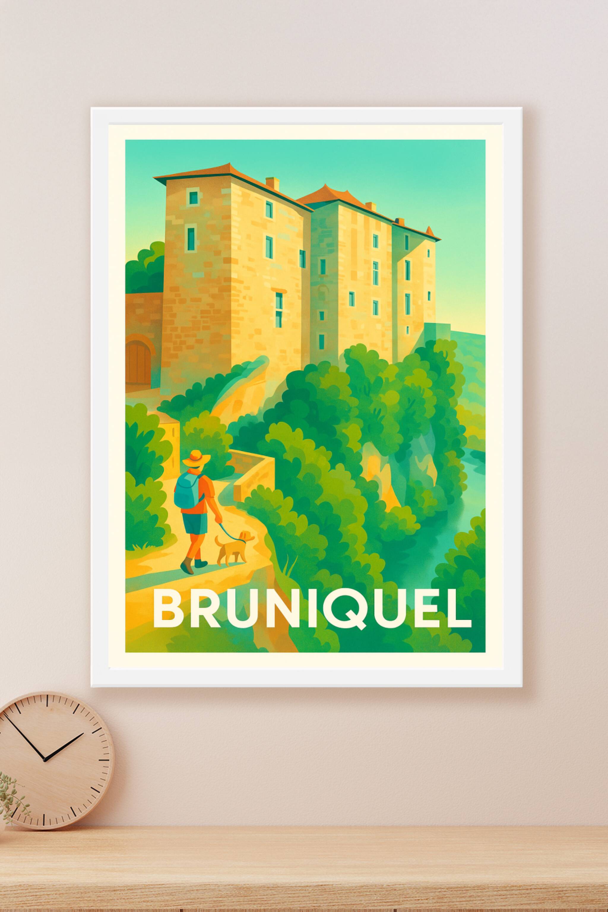 Découvrez la charmante ambiance du village médiéval de Bruniquel avec ce poster artisanal au style vintage, mettant en lumière ses bâtisses embléma...