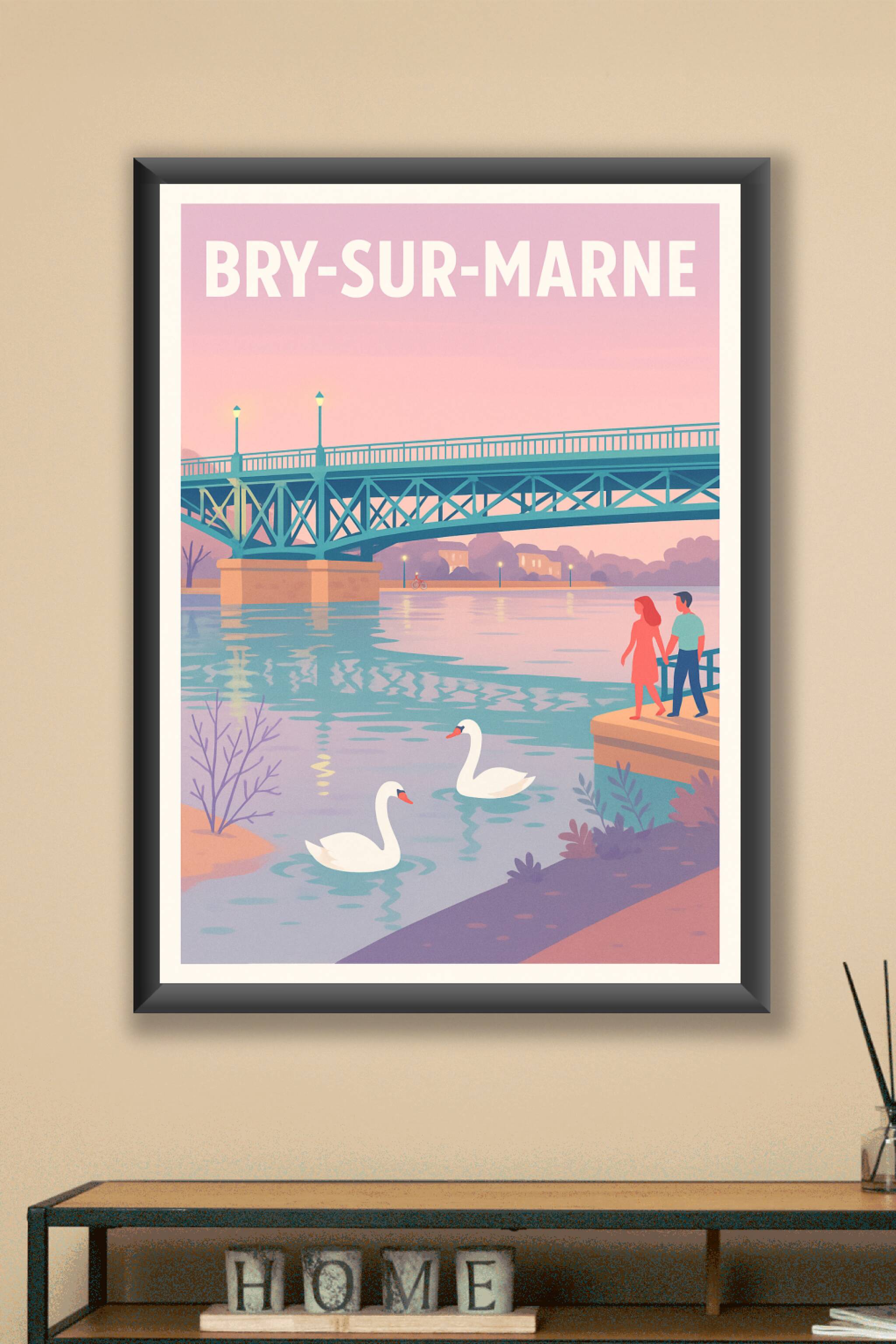 Offrez-vous une invitation à la sérénité avec ce poster représentant une scène paisible au bord de la Marne à Bry-sur-Marne. L'affiche illustre un ...