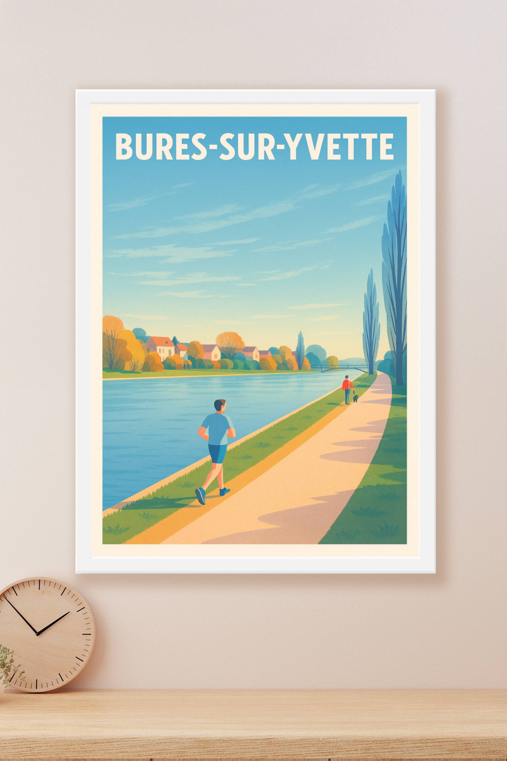 Découvrez la douceur de vivre à Bures-sur-Yvette avec cette affiche illustrée représentant une promenade paisible le long de la rivière, sous un ci...