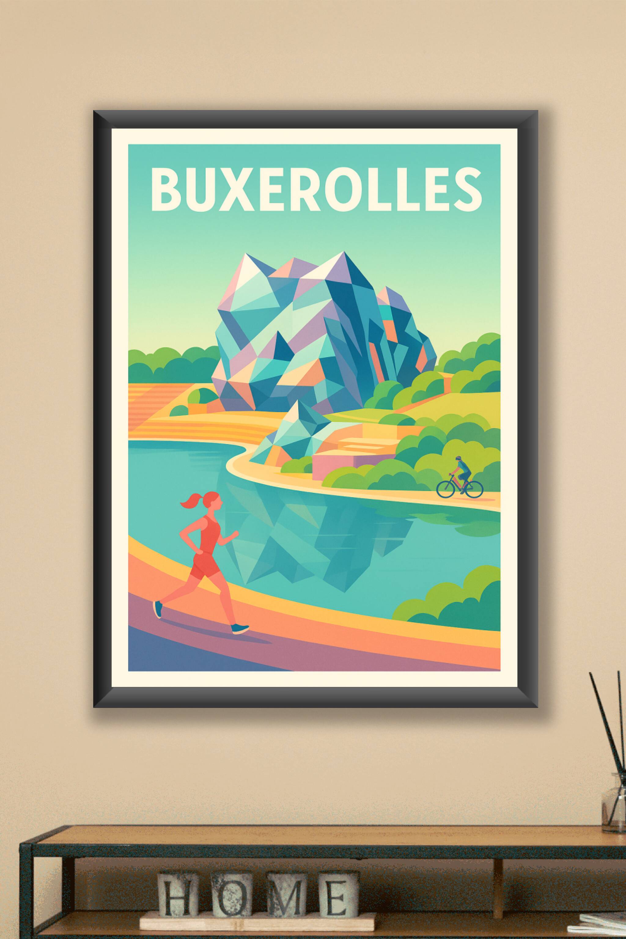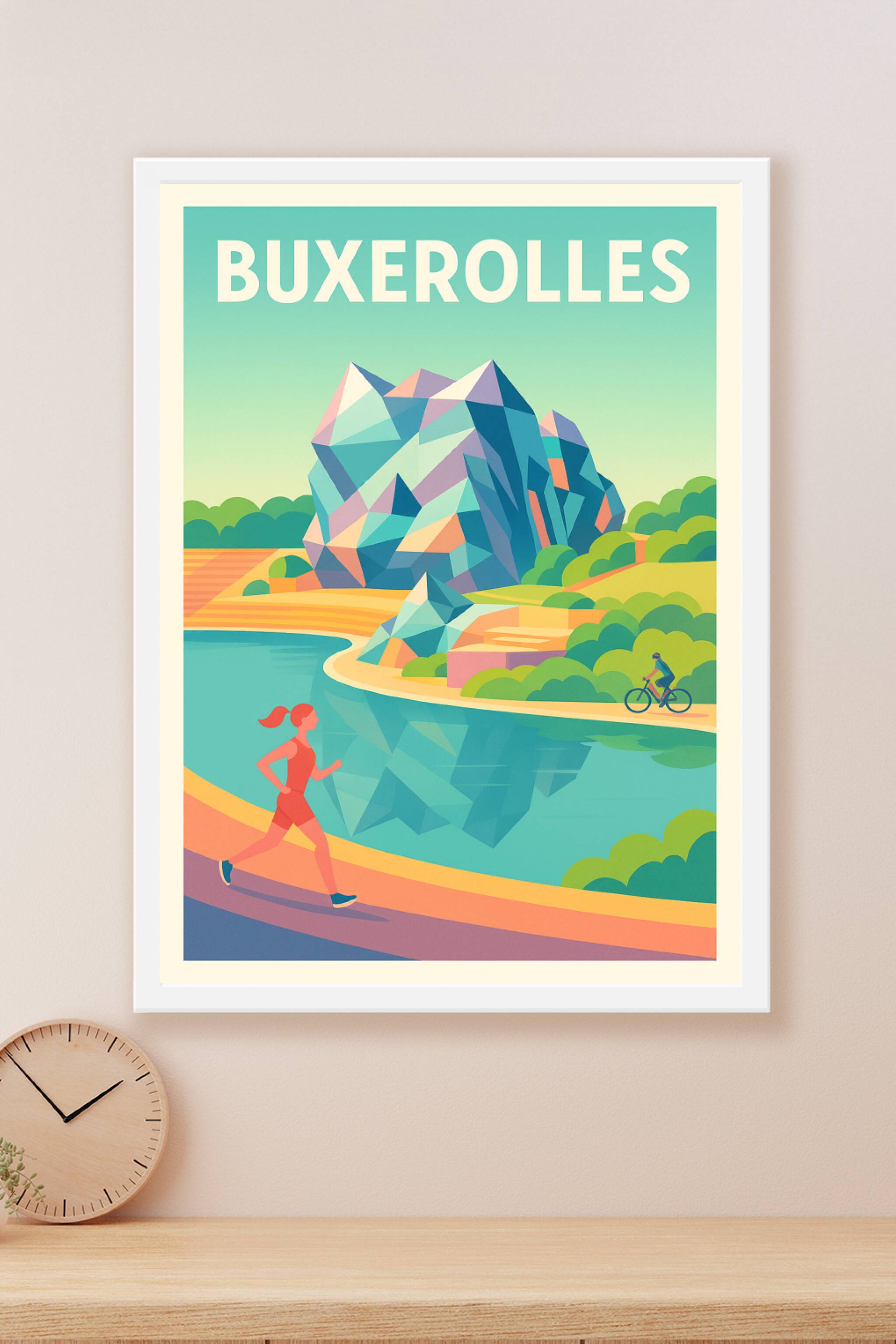 Découvrez l'atmosphère apaisante et dynamique de Buxerolles avec cette affiche au style graphique et moderne. Le poster illustre un paysage naturel où le sport en plein air prend tout son sens, entre jogging au bord de l'eau et cyclisme en pleine verdure. Imprimée en tirage "Fine Art" sur papier coton 305g, cette affiche offre une qualité d'impression exceptionnelle pour sublimer votre décoration. Disponible en plusieurs formats, du A1 au A4, avec ou sans cadre, elle s'adapte à tous les espaces et styles d'intérieur. Apportez une touche d'énergie et de fraîcheur à votre maison ou offrez un souvenir unique aux amateurs de nature et d'activités sportives.