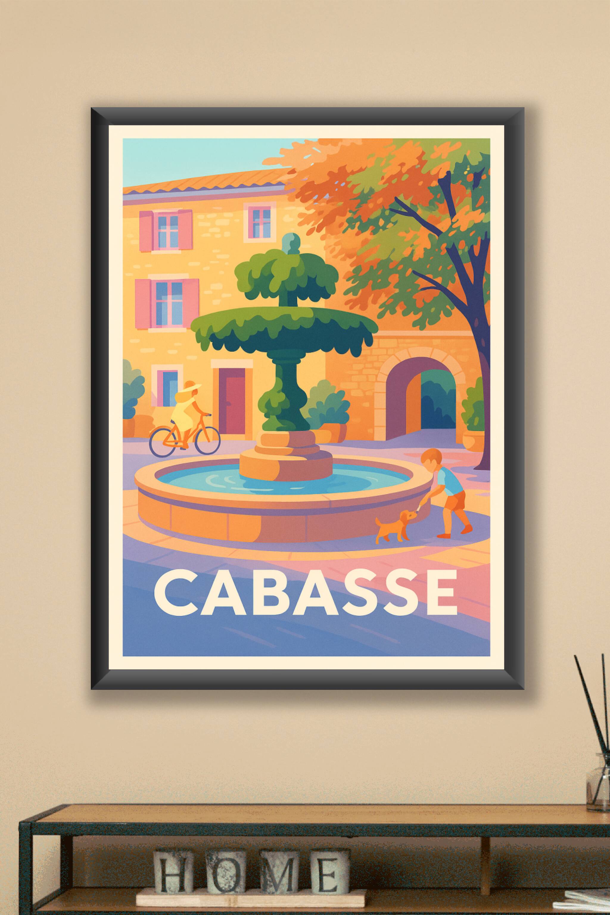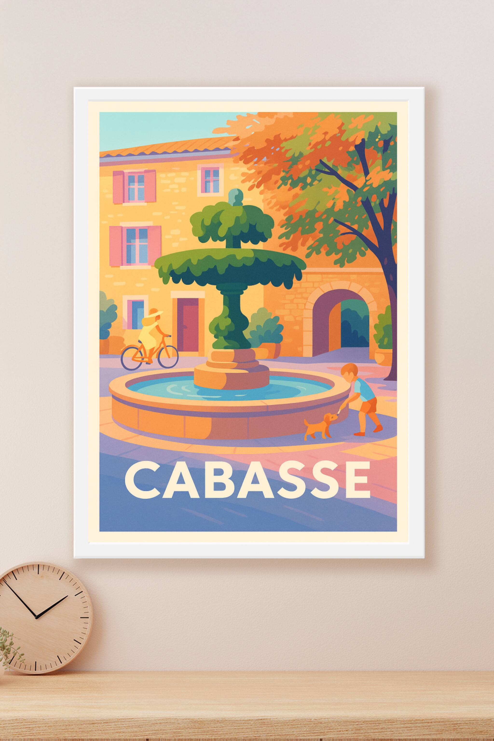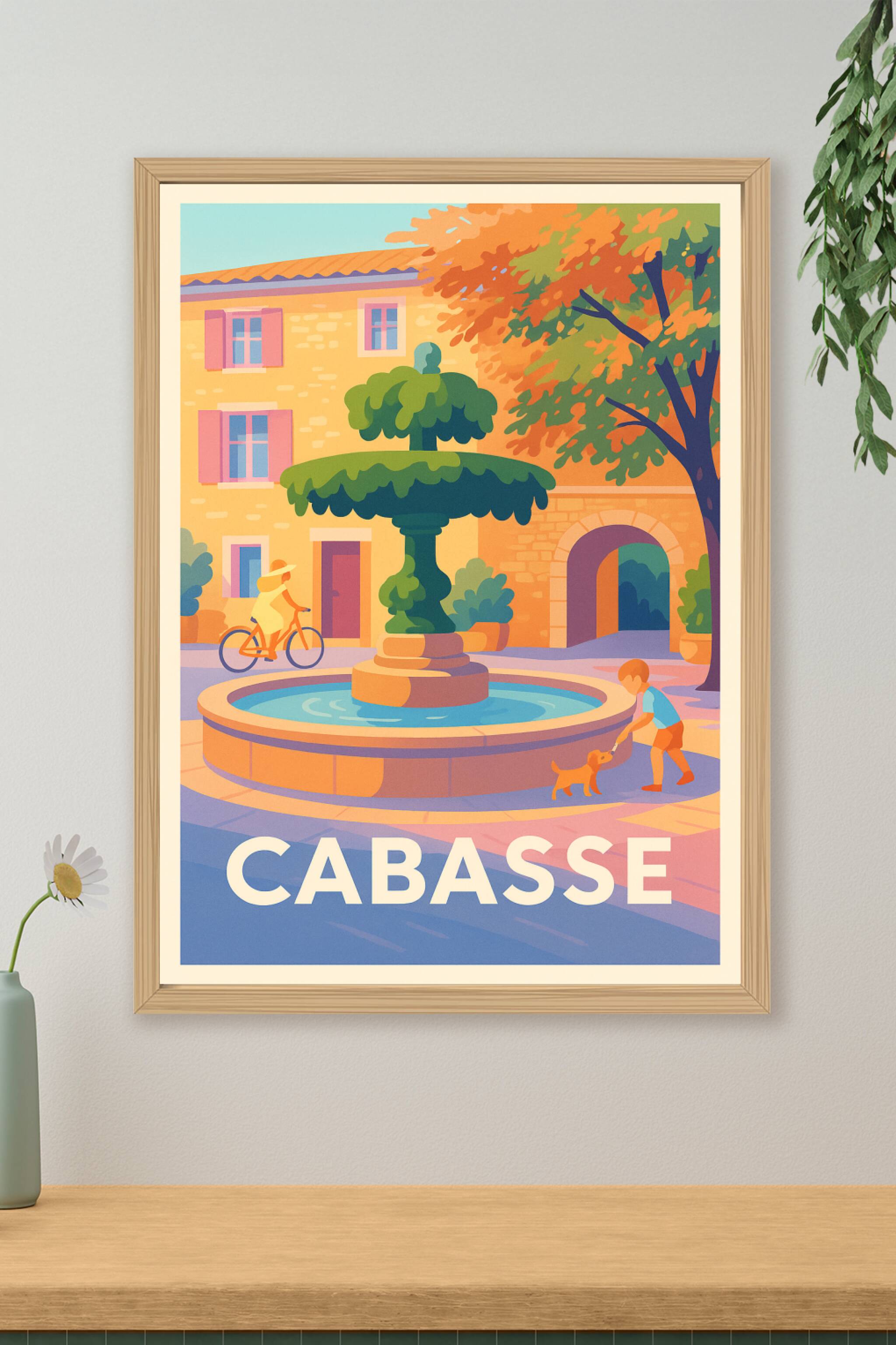 Découvrez l'ambiance paisible et chaleureuse de Cabasse avec cette affiche illustrée mettant en scène une fontaine typique entourée de touches auto...