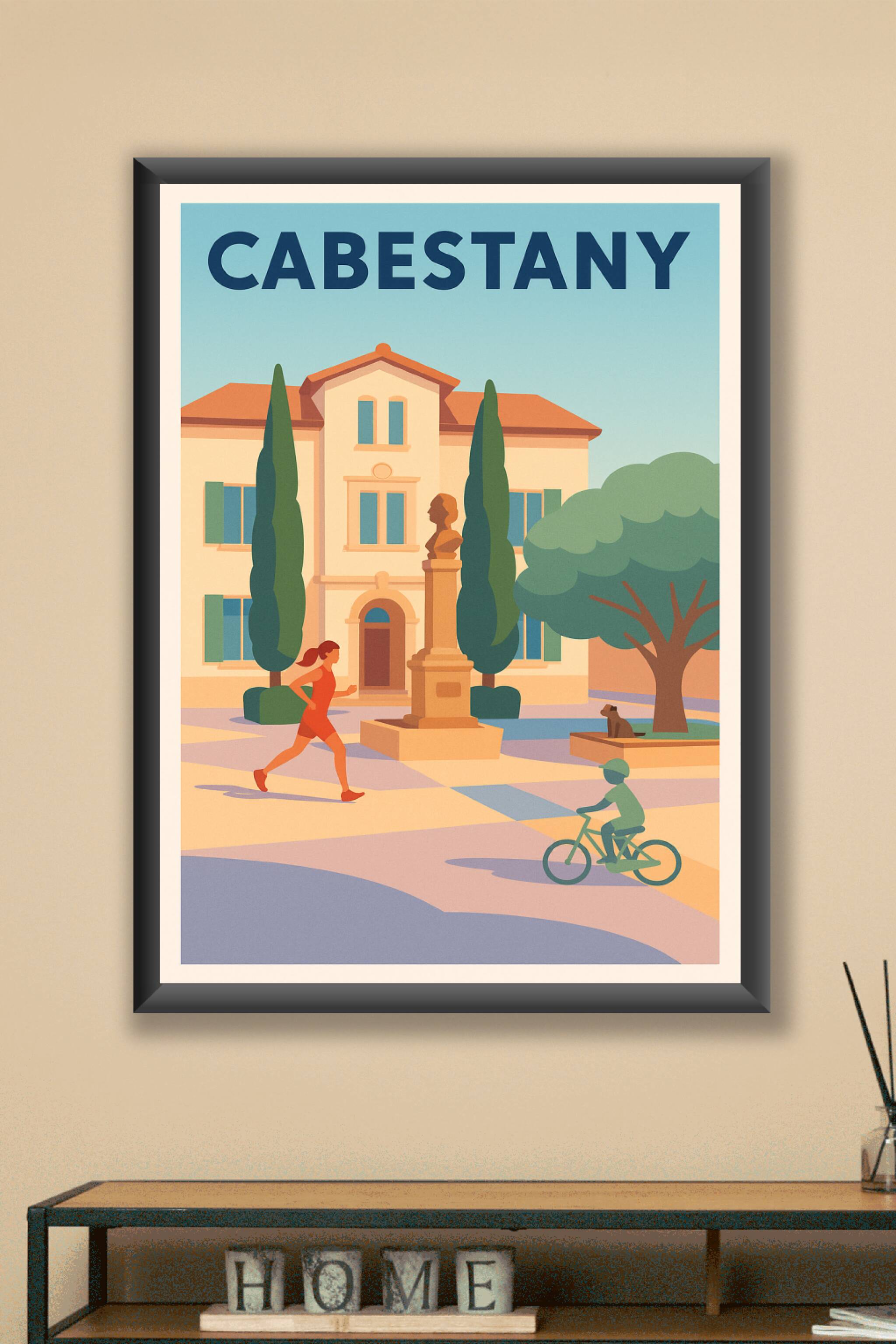 Découvrez l'ambiance paisible et accueillante de Cabestany à travers cette affiche illustrée pleine de charme. Représentant une scène quotidienne e...
