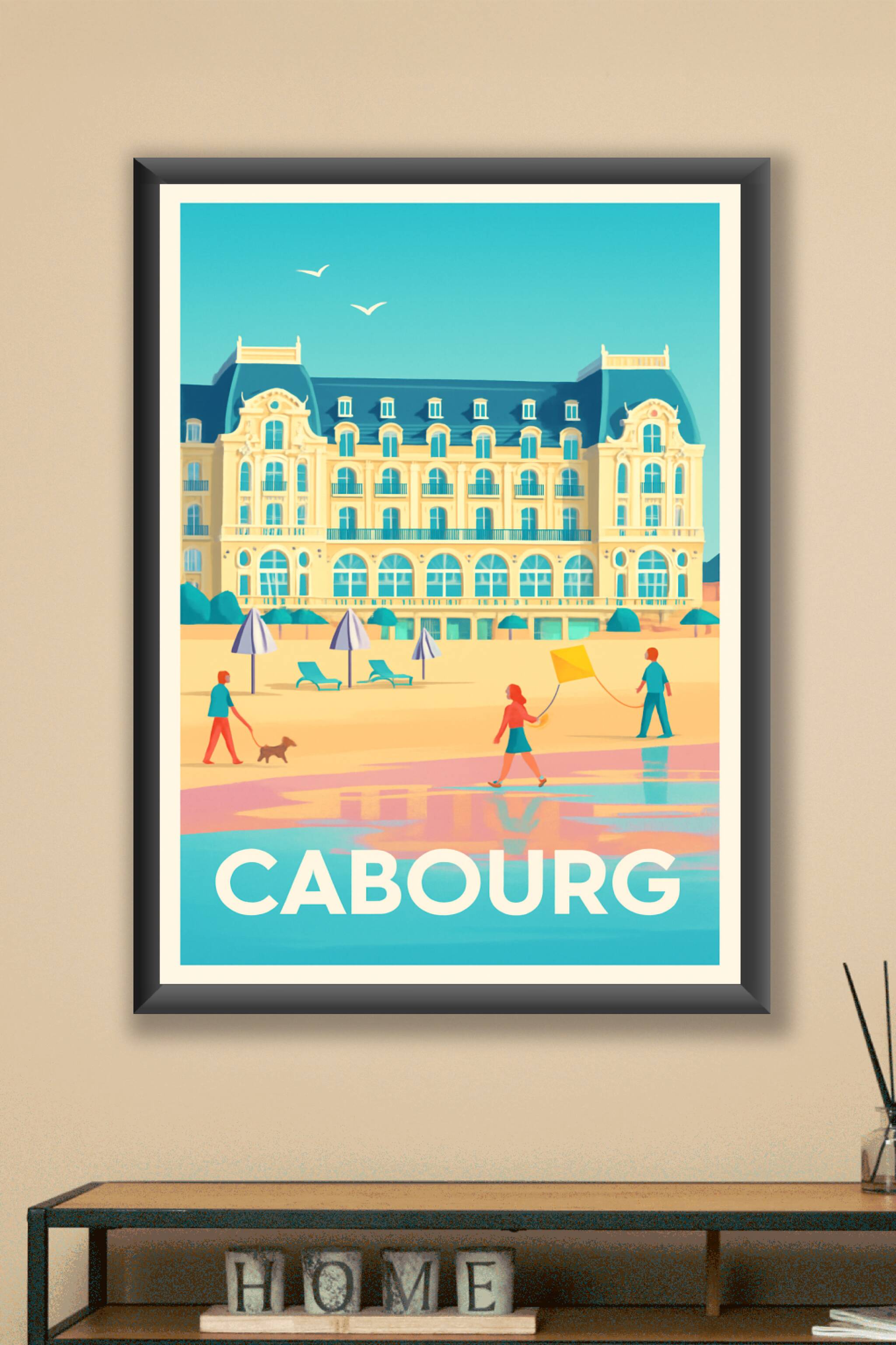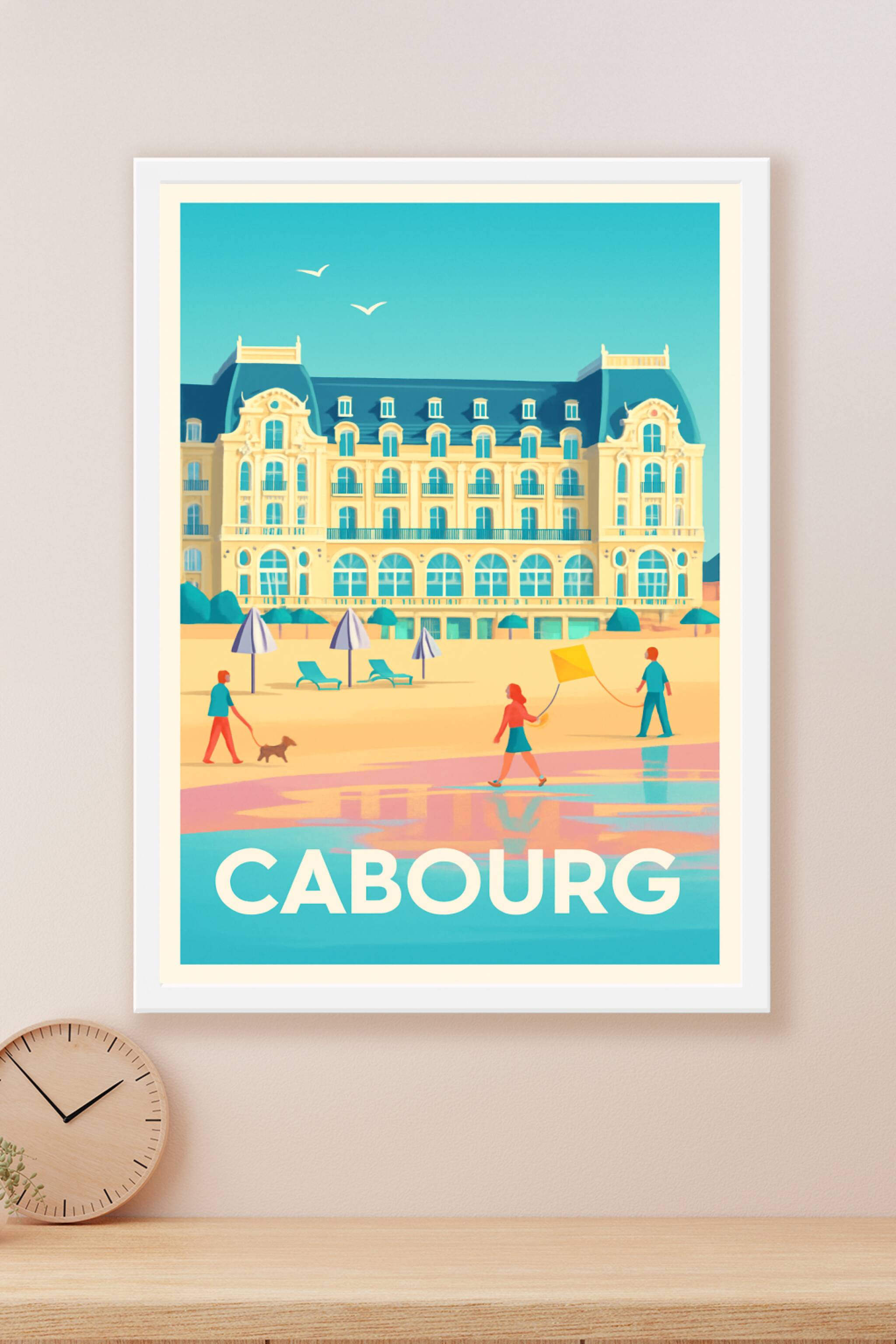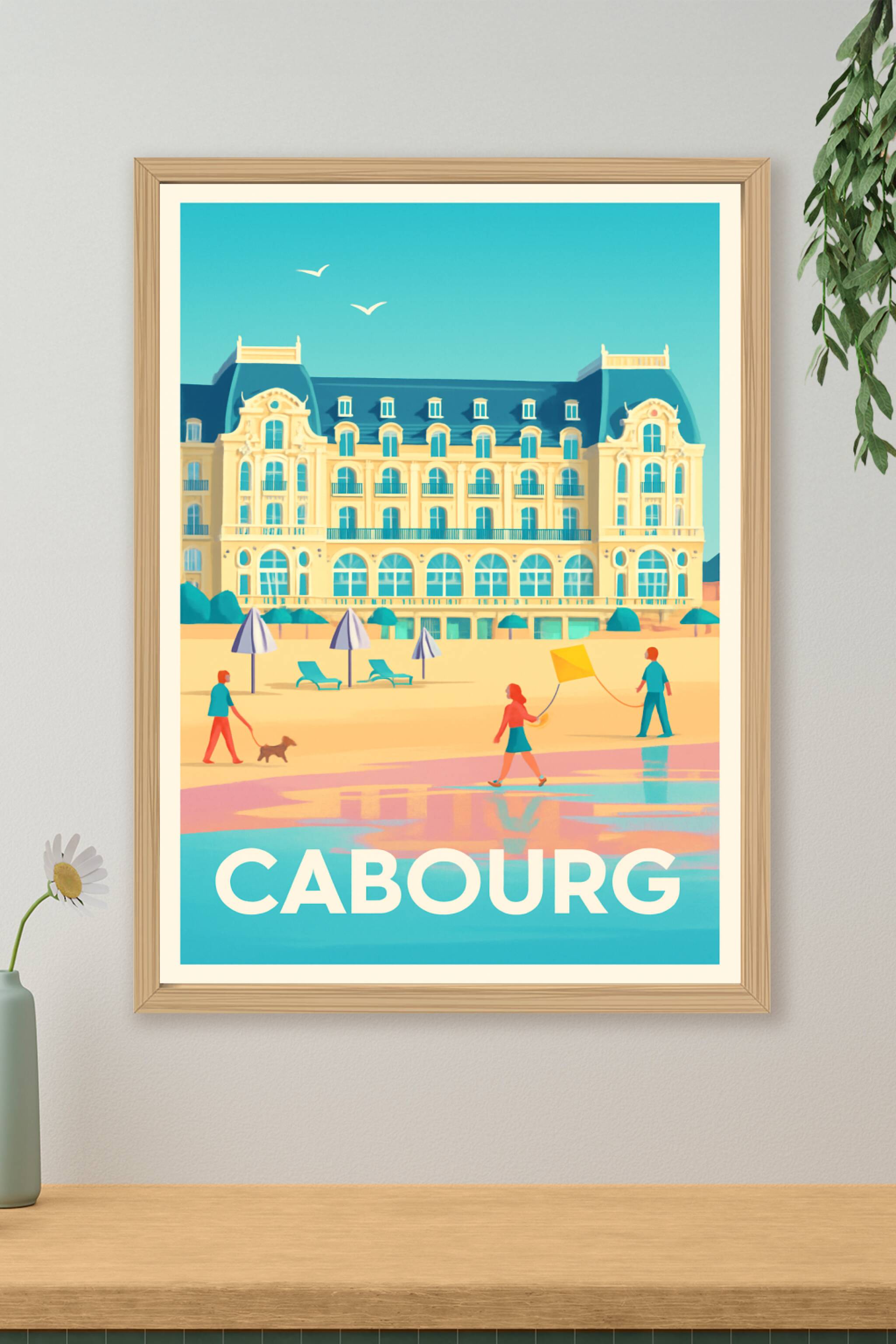 Découvrez la douceur de vivre normande avec cette affiche illustrée mettant en avant le charme architectural emblématique de Cabourg et la plage ba...