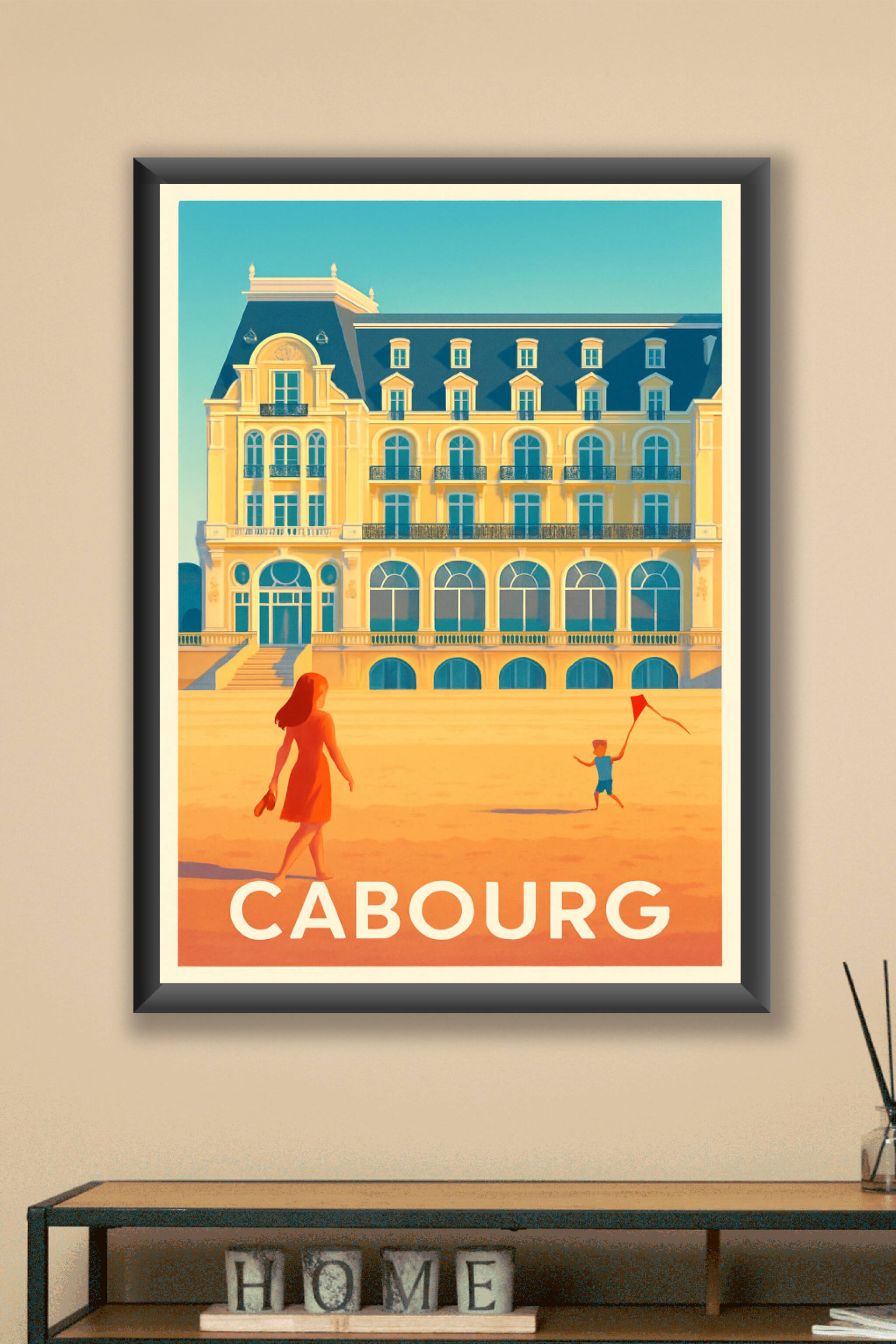Découvrez l'élégance intemporelle de Cabourg avec cette affiche vintage illustrant la célèbre architecture balnéaire de la ville au coucher du sole...