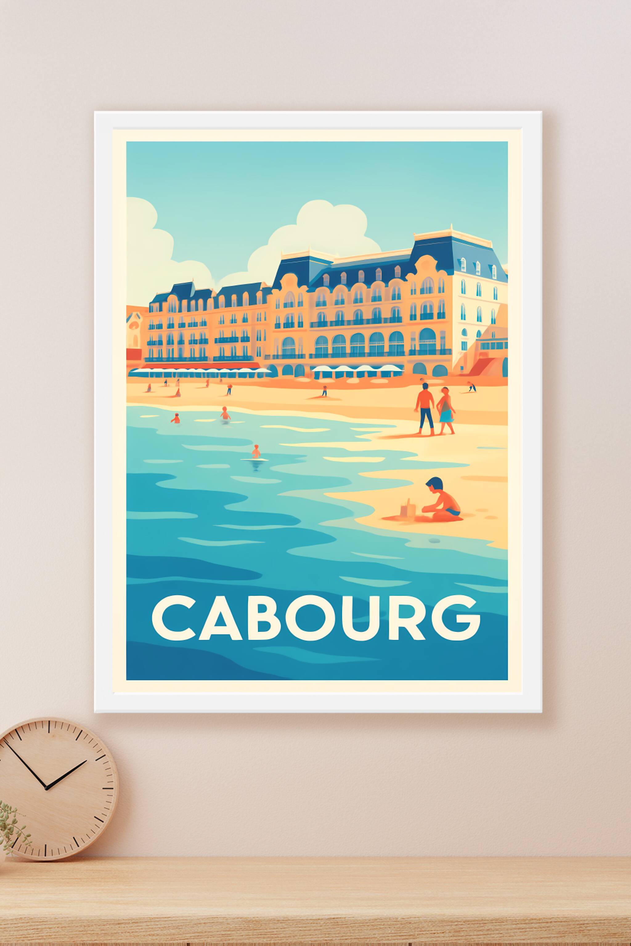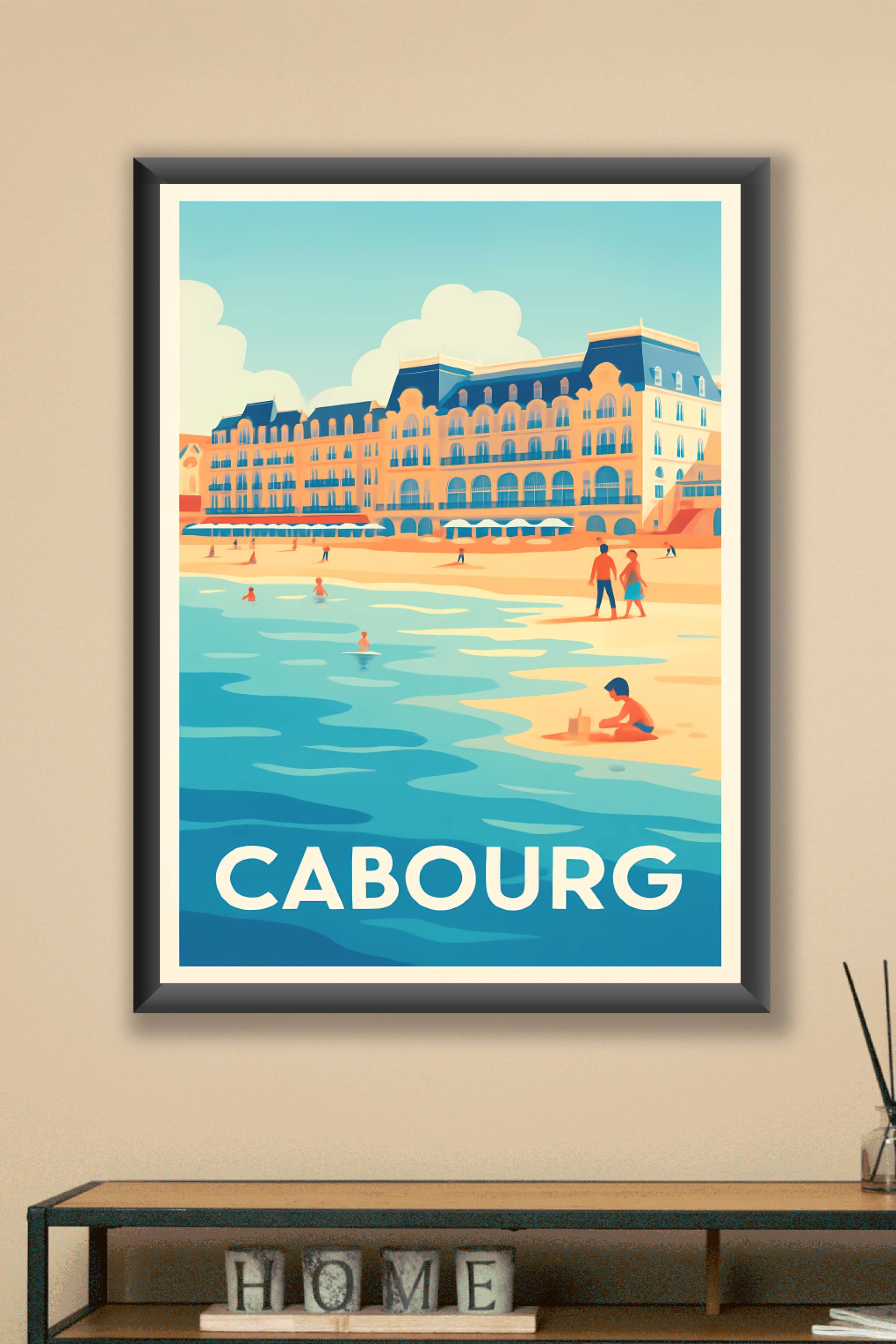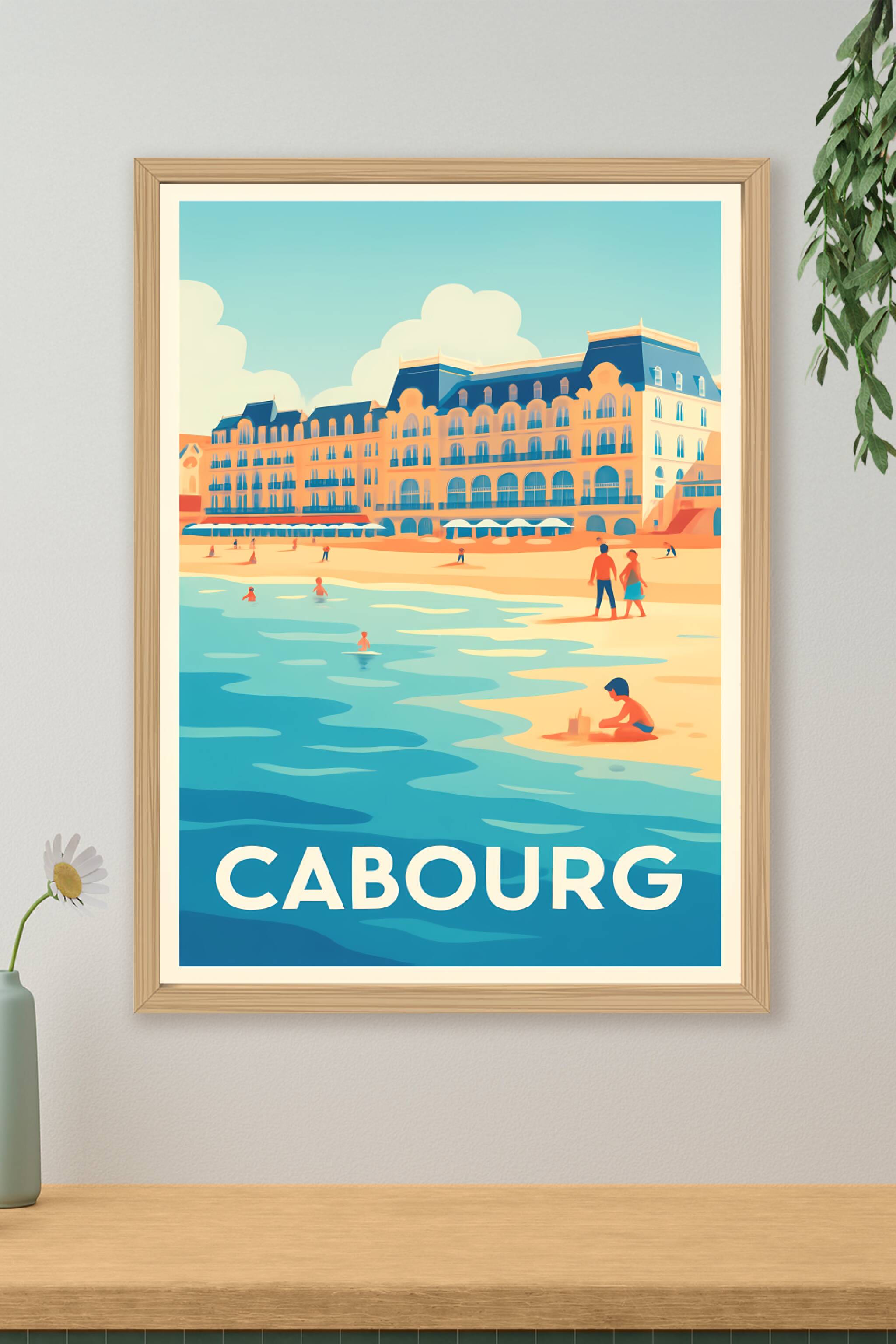 Découvrez l'atmosphère unique de la célèbre station balnéaire de Cabourg avec cette affiche artistique qui capture la plage animée et l'architectur...
