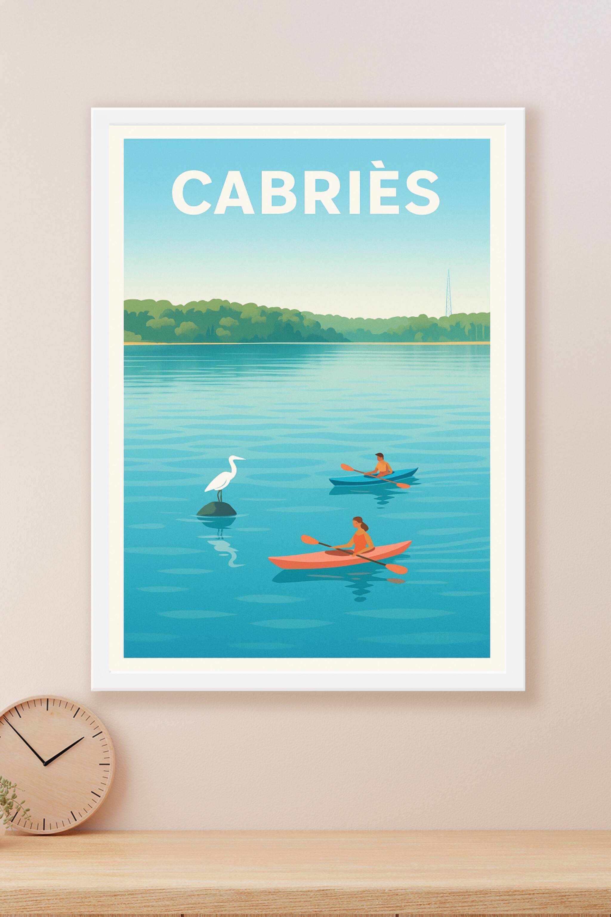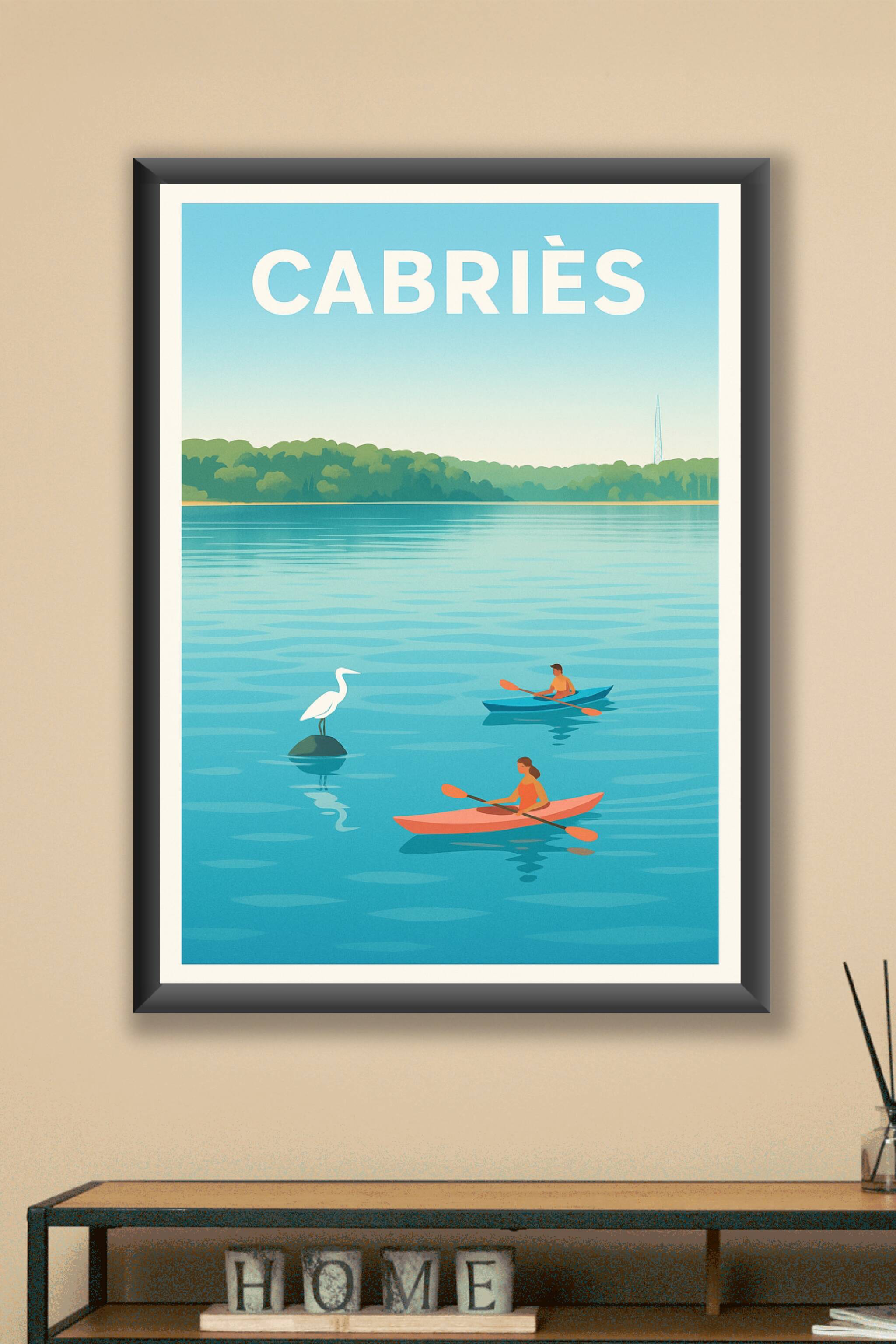 Découvrez la douceur et la tranquillité des paysages de Cabriès avec cette superbe affiche illustrée mettant en scène deux kayakistes glissant pais...