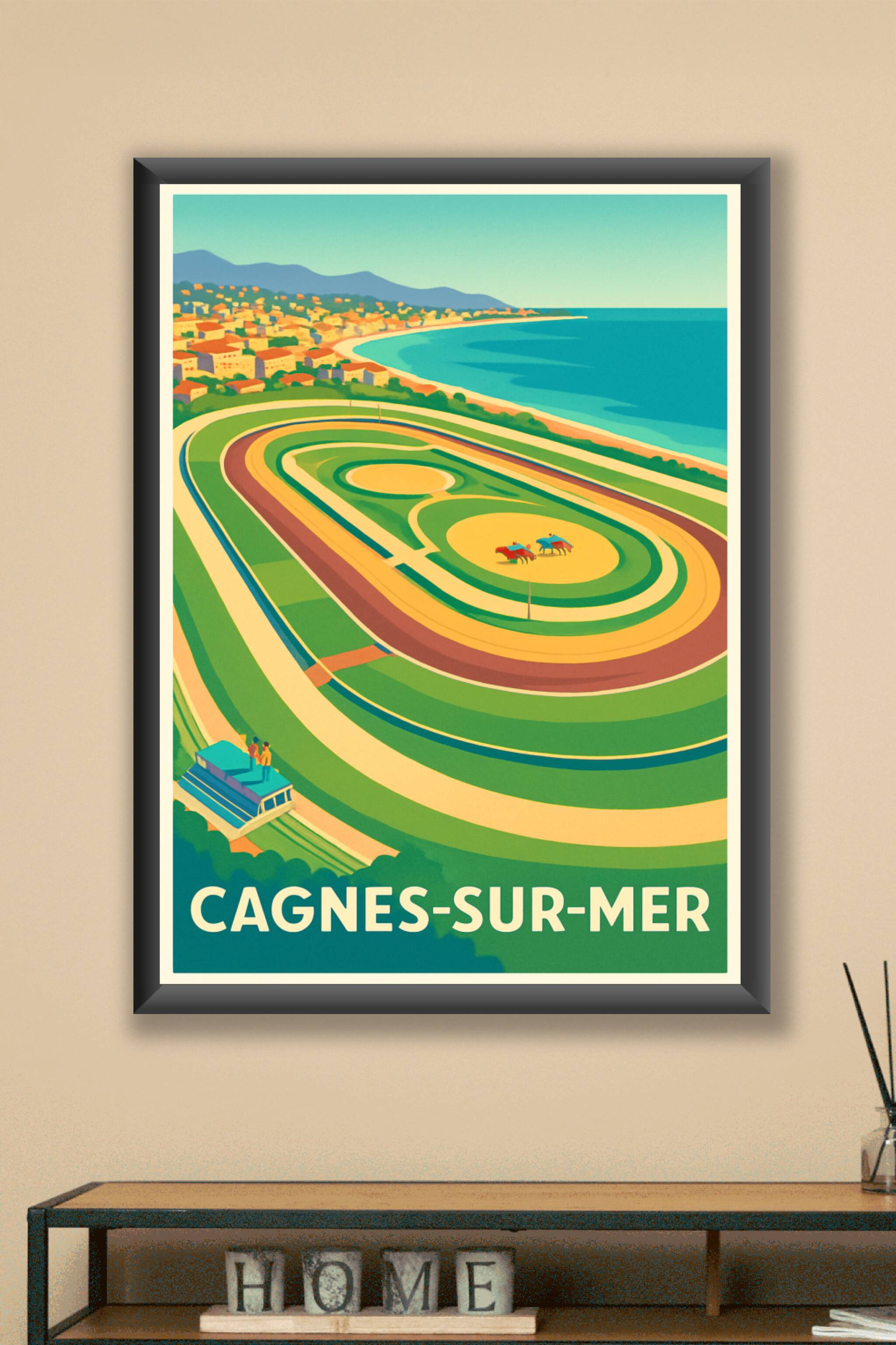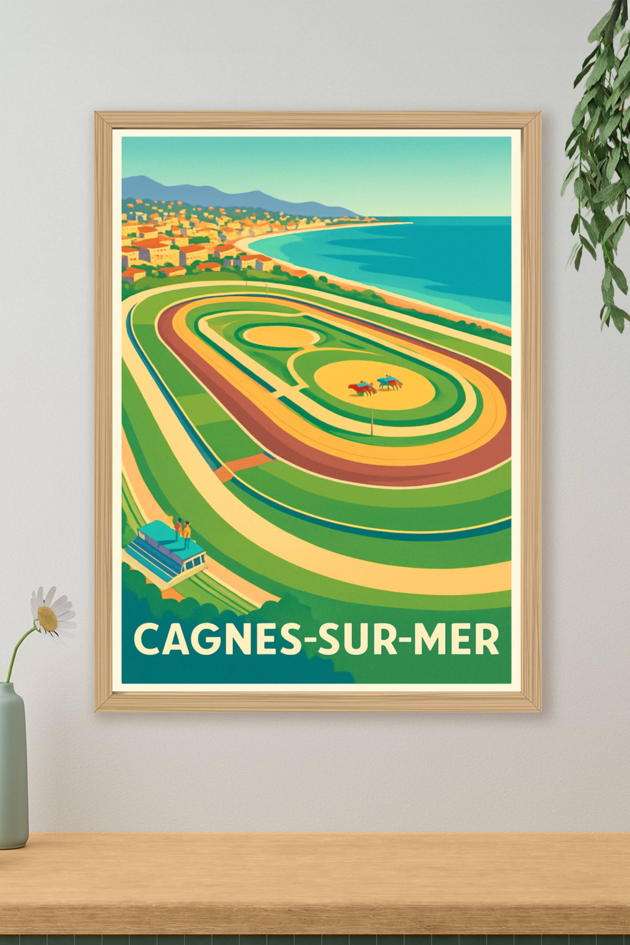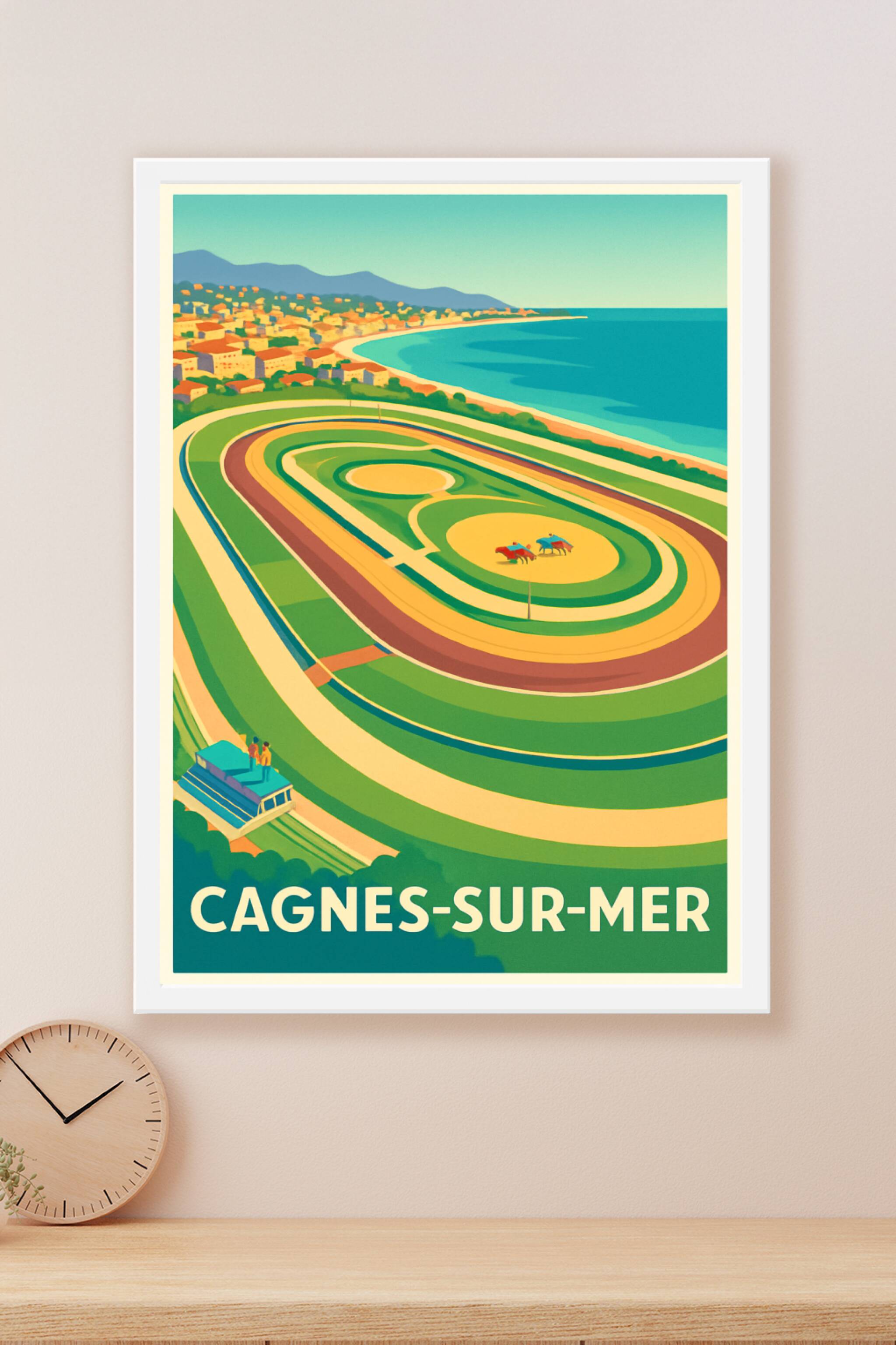 Découvrez l’atmosphère unique de Cagnes-sur-Mer avec cette affiche vintage représentant l’hippodrome en bord de mer, un lieu où la passion des courses hippiques se mêle à la beauté du littoral azuréen. Ce poster au style rétro est parfait pour apporter une touche de charme et de dynamisme à votre intérieur. Imprimé en tirage "Fine Art" sur un papier coton 305g de grande qualité, il garantit une longue tenue des couleurs et une finesse d'impression remarquable. Disponible en formats A1, A2, A3 et A4, avec ou sans cadre, cette affiche est idéale pour les amateurs de la Côte d'Azur ou les passionnés de courses hippiques. Profitez d’un produit fabriqué en France, alliant esthétisme et qualité pour décorer ou offrir un souvenir raffiné de Cagnes-sur-Mer.