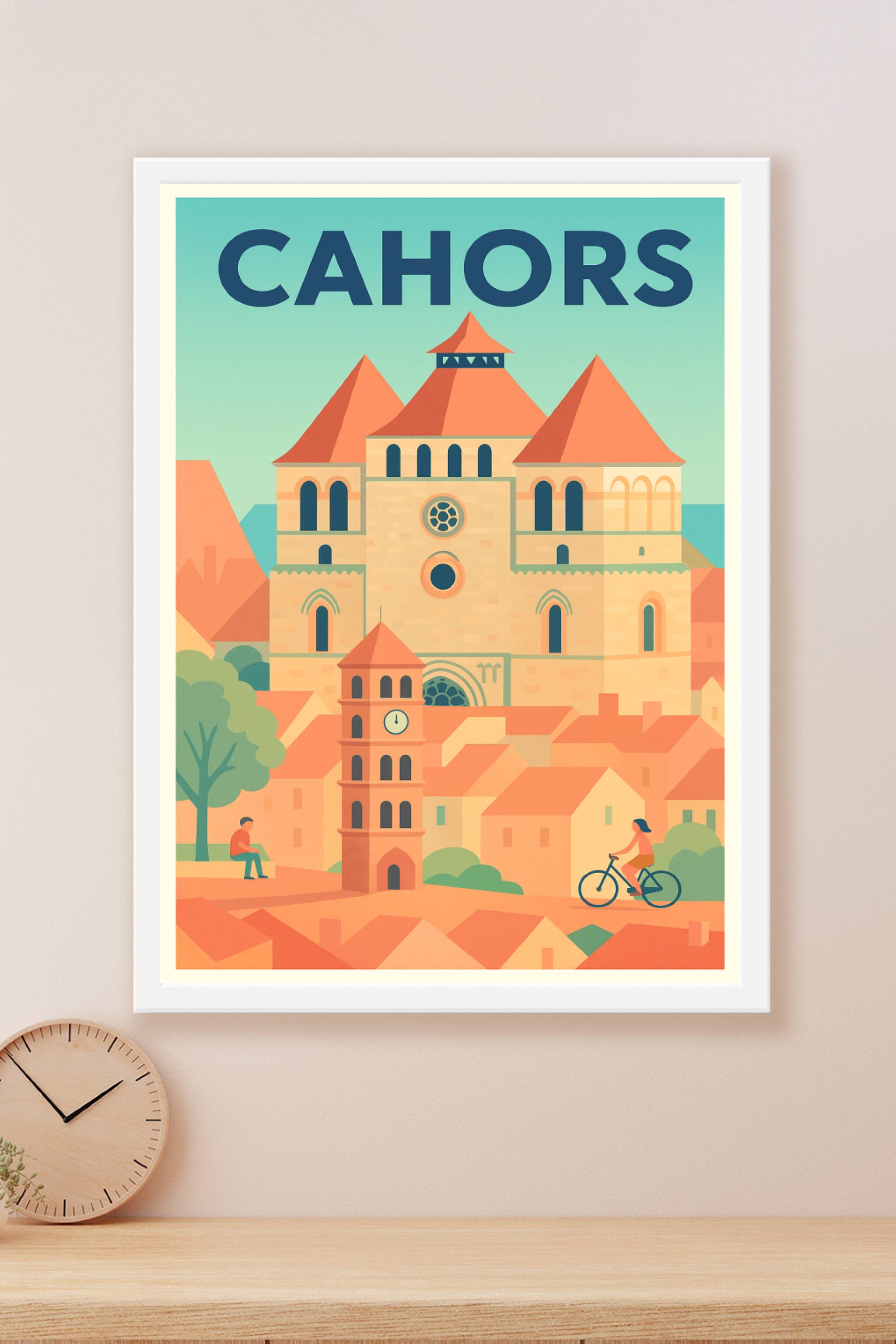 Découvrez le charme intemporel de Cahors avec cette affiche illustrée qui met en valeur l'architecture médiévale et les toits ocres emblématiques d...