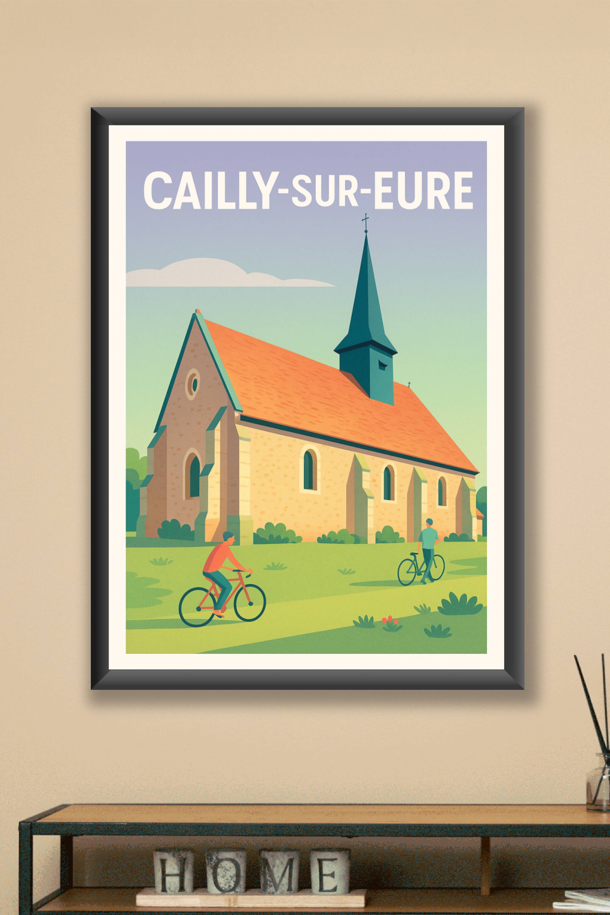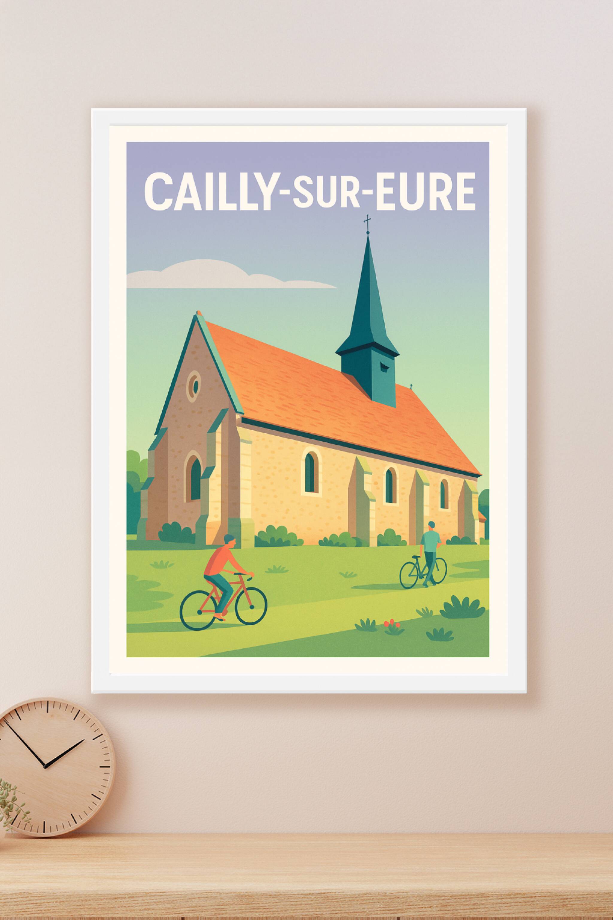 Découvrez la tranquillité unique de Cailly-sur-Eure avec cette affiche au design épuré et coloré, illustrant une église typique et deux cyclistes p...