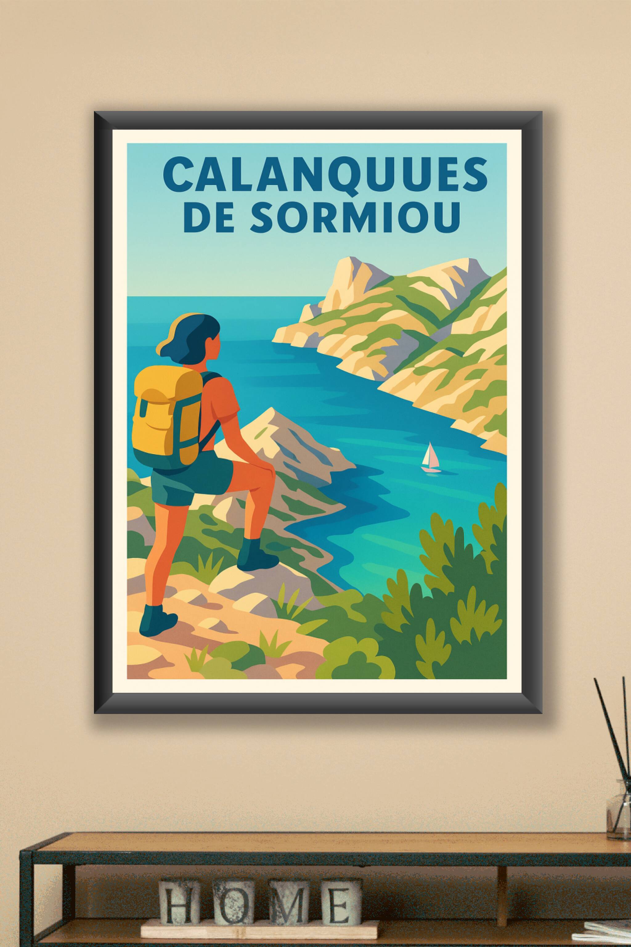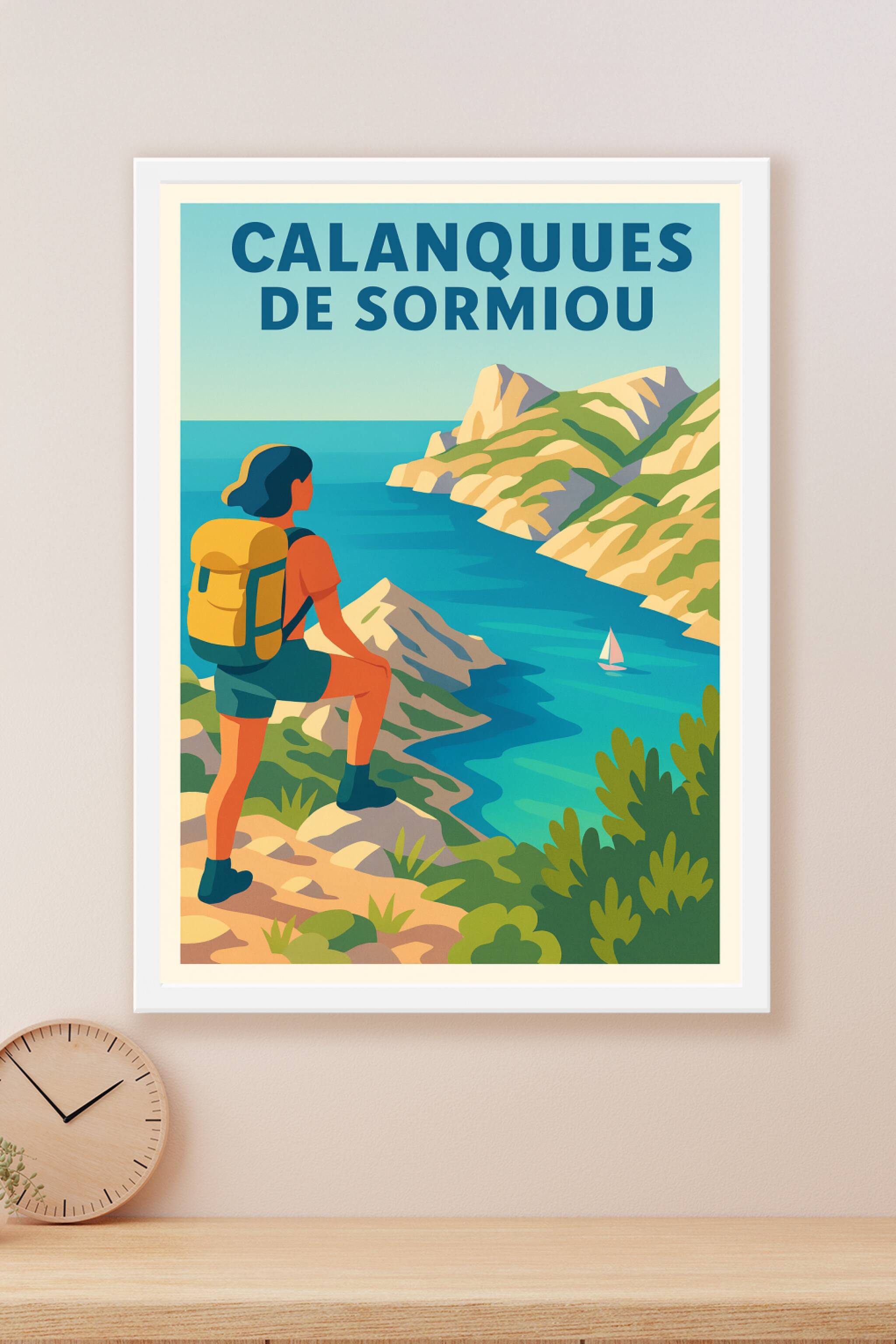 Découvrez la beauté sauvage et préservée des Calanques de Sormiou avec cette affiche illustrée qui capture l'essence d'une randonnée méditerranéenn...