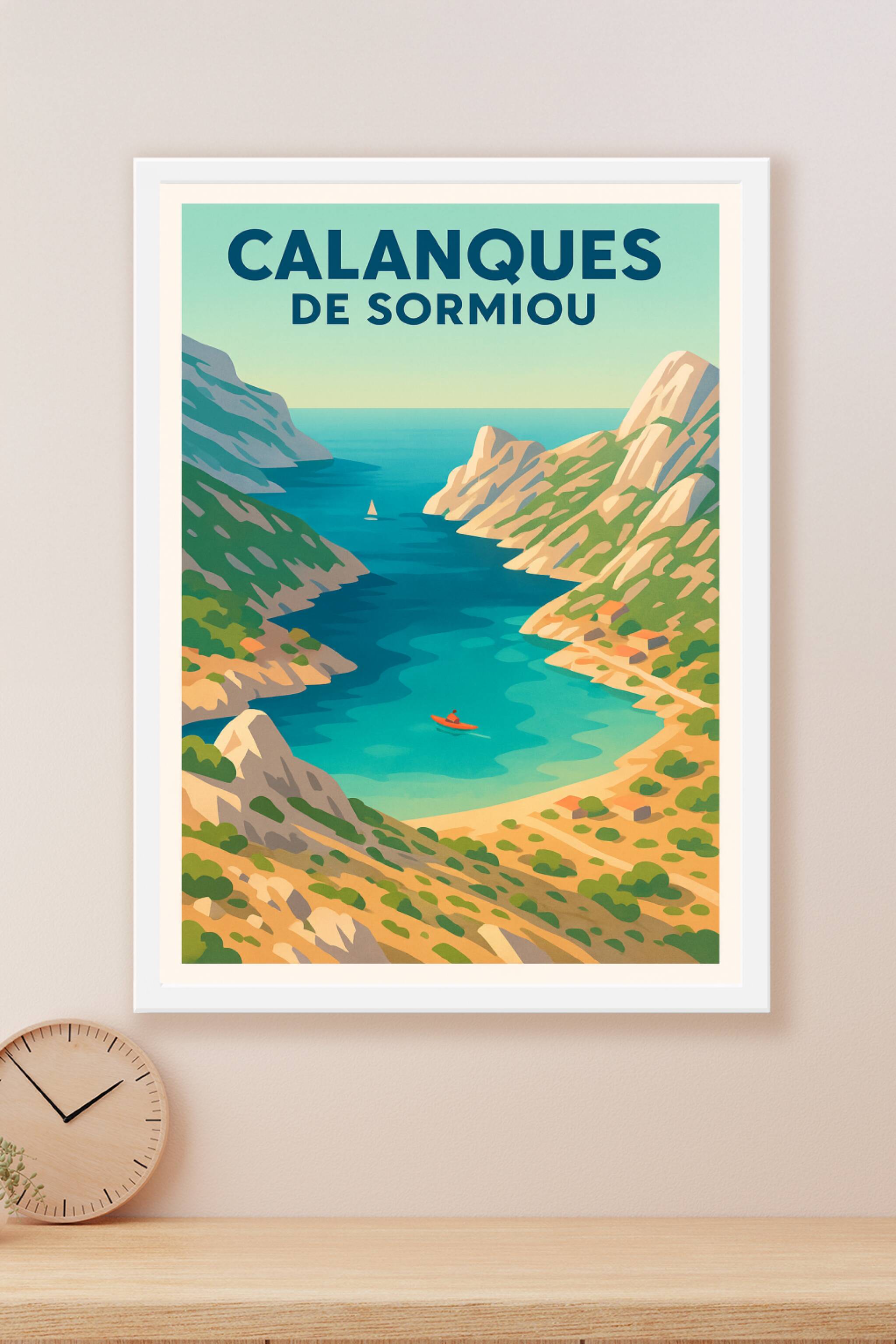 Découvrez la sérénité des Calanques de Sormiou à travers cette affiche au style illustratif et coloré, qui capture la beauté sauvage de ce joyau naturel méditerranéen. Cette magnifique scène marine, où kayak et voilier évoluent dans des eaux turquoise, invite à l'évasion et au voyage.Ce poster est imprimé en tirage "Fine Art" sur un papier de qualité supérieure 305g coton, garantissant des couleurs éclatantes et une netteté exceptionnelle. Disponible en formats A1 à A4, avec ou sans cadre, cette affiche apportera une touche authentique et apaisante à votre décoration intérieure. Profitez d'une impression premium, 100% fabriquée en France, parfaite pour offrir ou embellir votre espace avec une atmosphère provençale inoubliable.