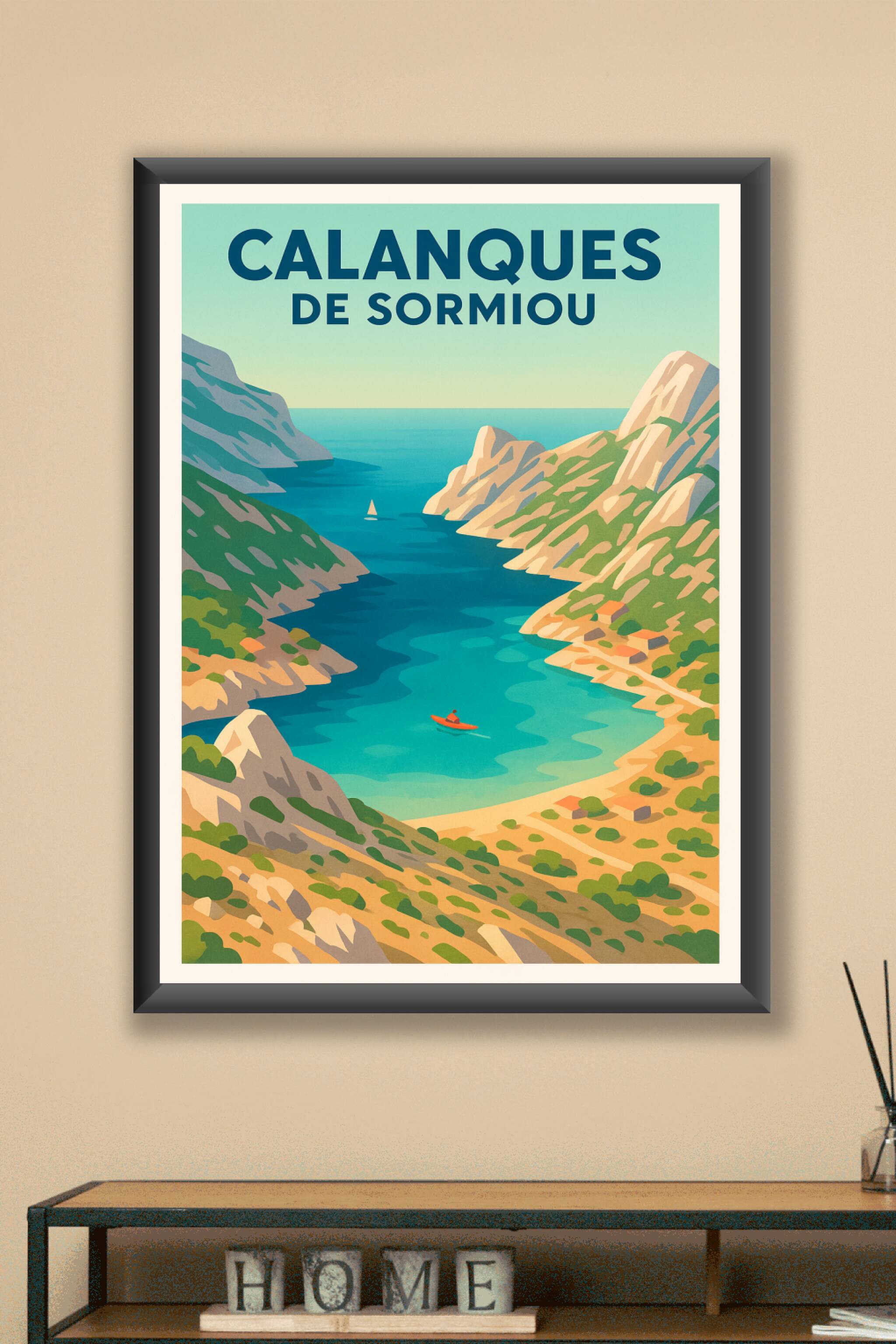 Découvrez la sérénité des Calanques de Sormiou à travers cette affiche au style illustratif et coloré, qui capture la beauté sauvage de ce joyau na...
