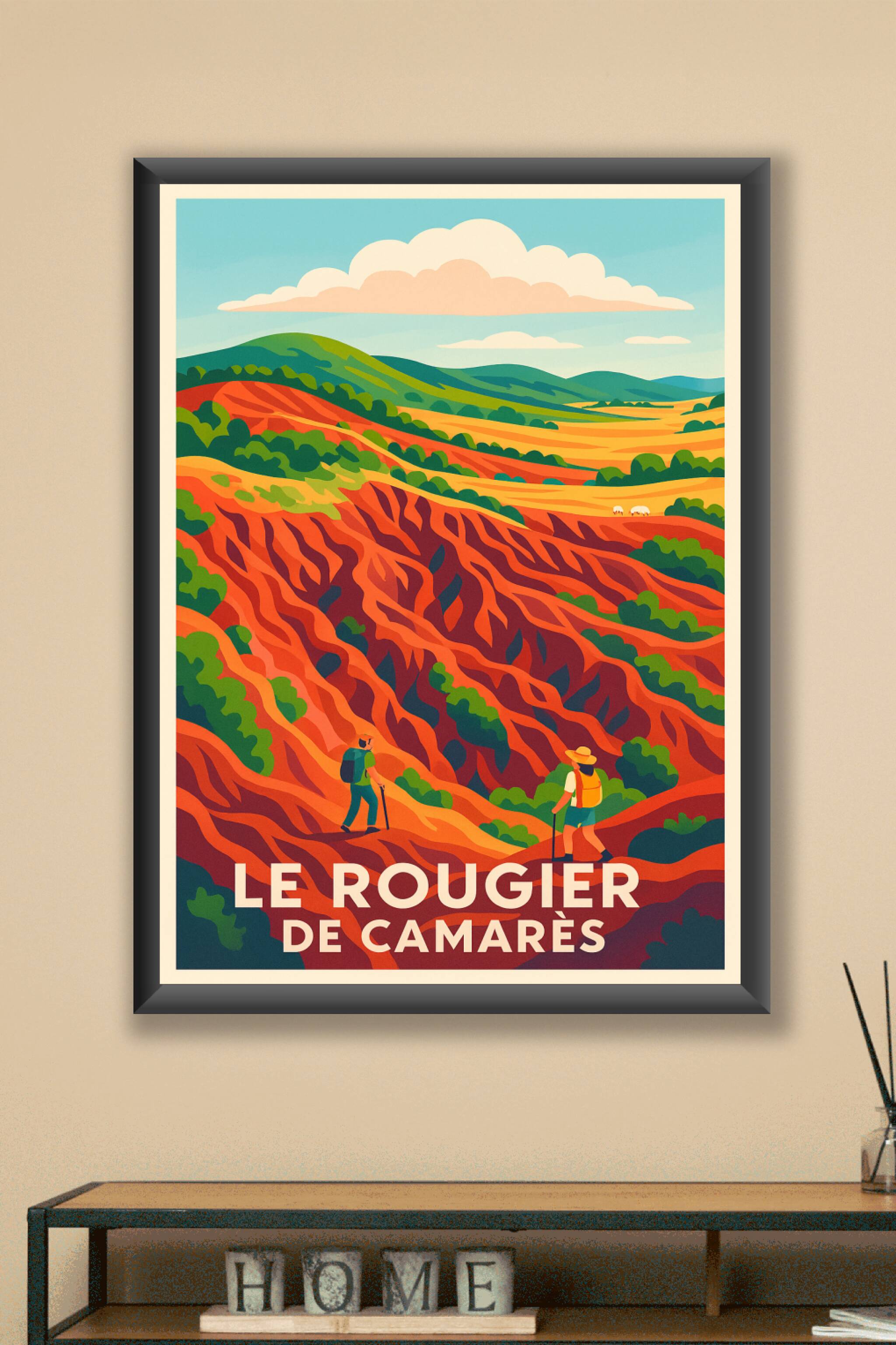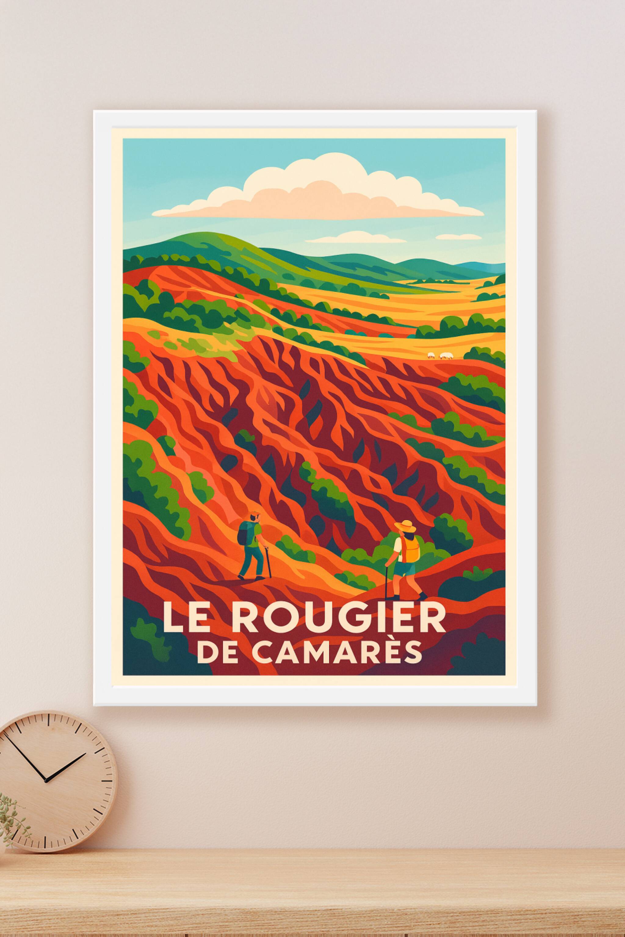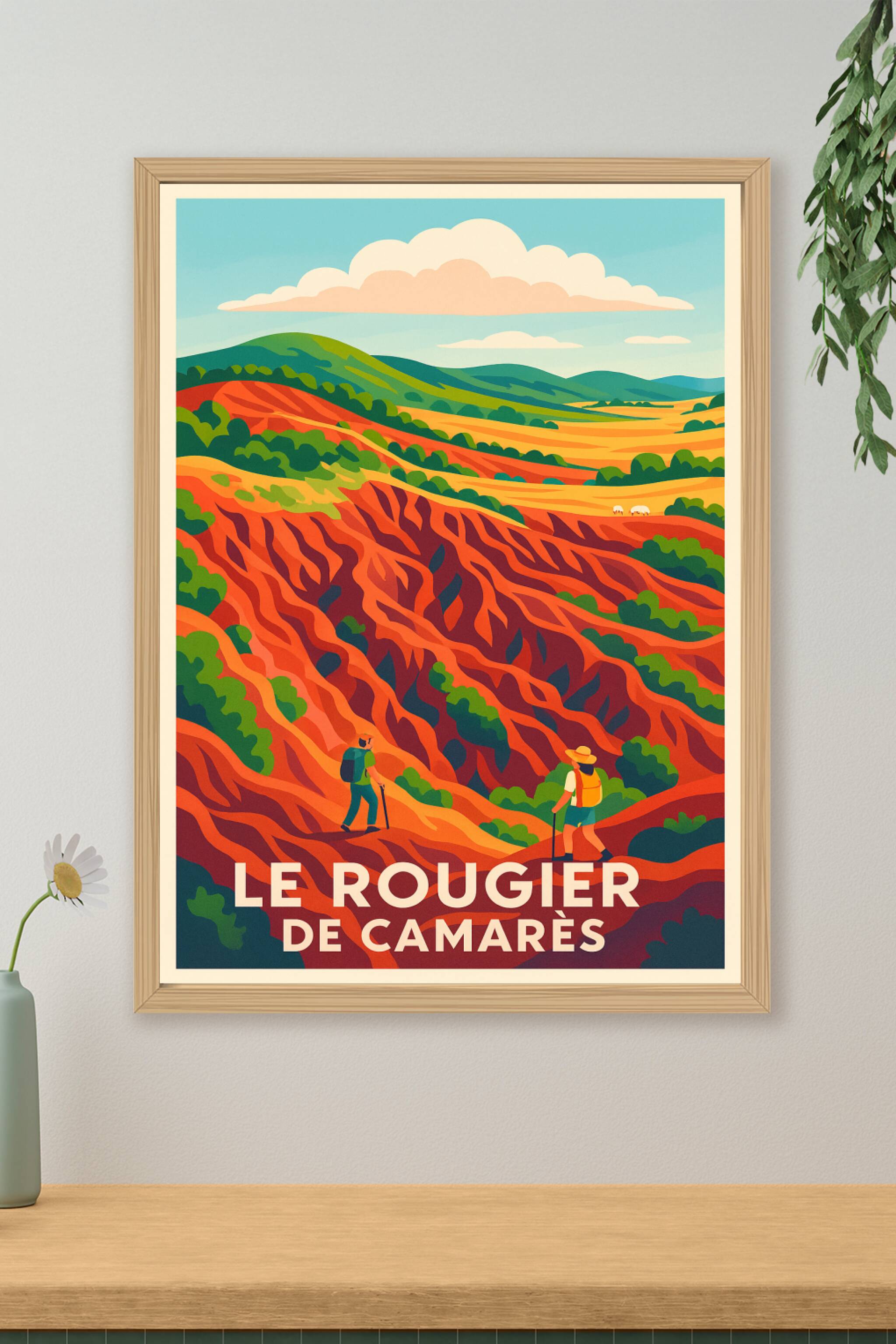 Découvrez la beauté spectaculaire des paysages du Rougier de Camarès avec cette affiche au style rétro vibrant et coloré. Cette scène captivante met en avant les collines ocres et les sentiers escarpés parcourus par des randonneurs, offrant une invitation parfaite à l'évasion et à l'aventure en pleine nature. Imprimée en tirage "Fine Art" sur papier haute qualité 305g coton, cette affiche garantit une finesse et une durabilité exceptionnelles. Disponible en formats A1, A2, A3 et A4, avec ou sans cadre, ce poster s'adapte parfaitement à votre décoration intérieure ou à un cadeau unique pour les amoureux des paysages authentiques. Profitez d'une impression premium 100% fabriquée en France pour sublimer votre espace avec l’esprit sauvage et coloré du Rougier de Camarès.