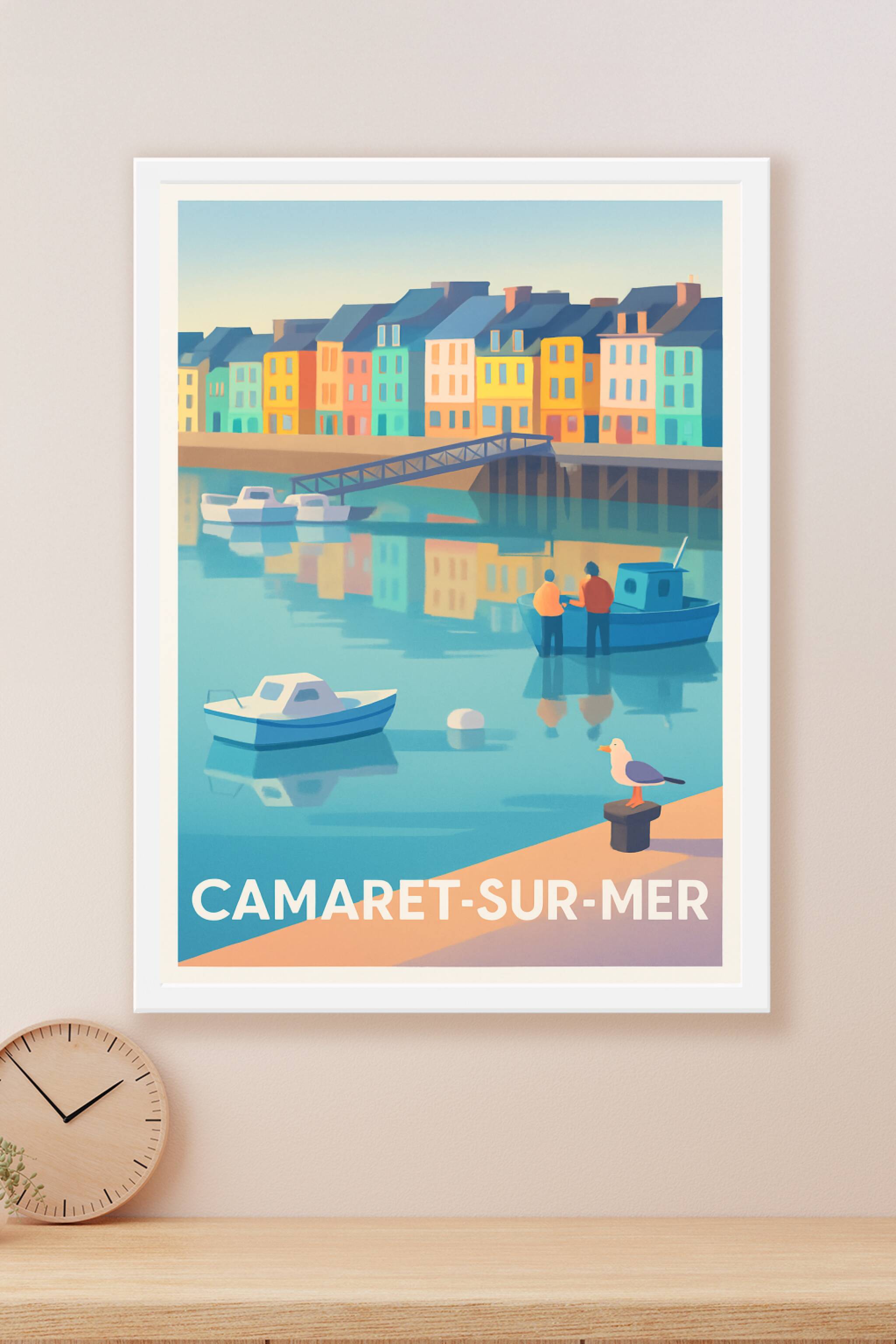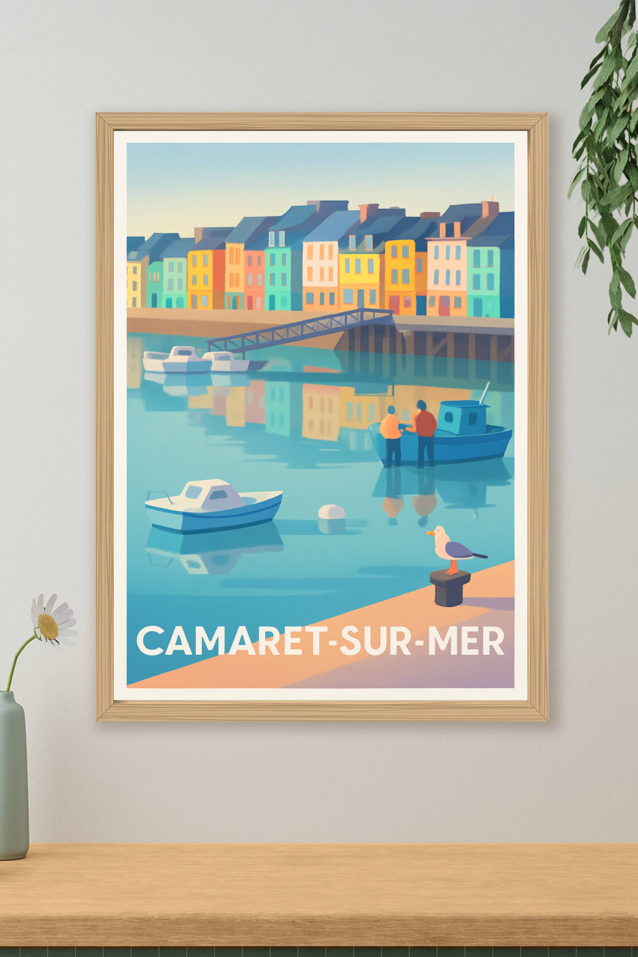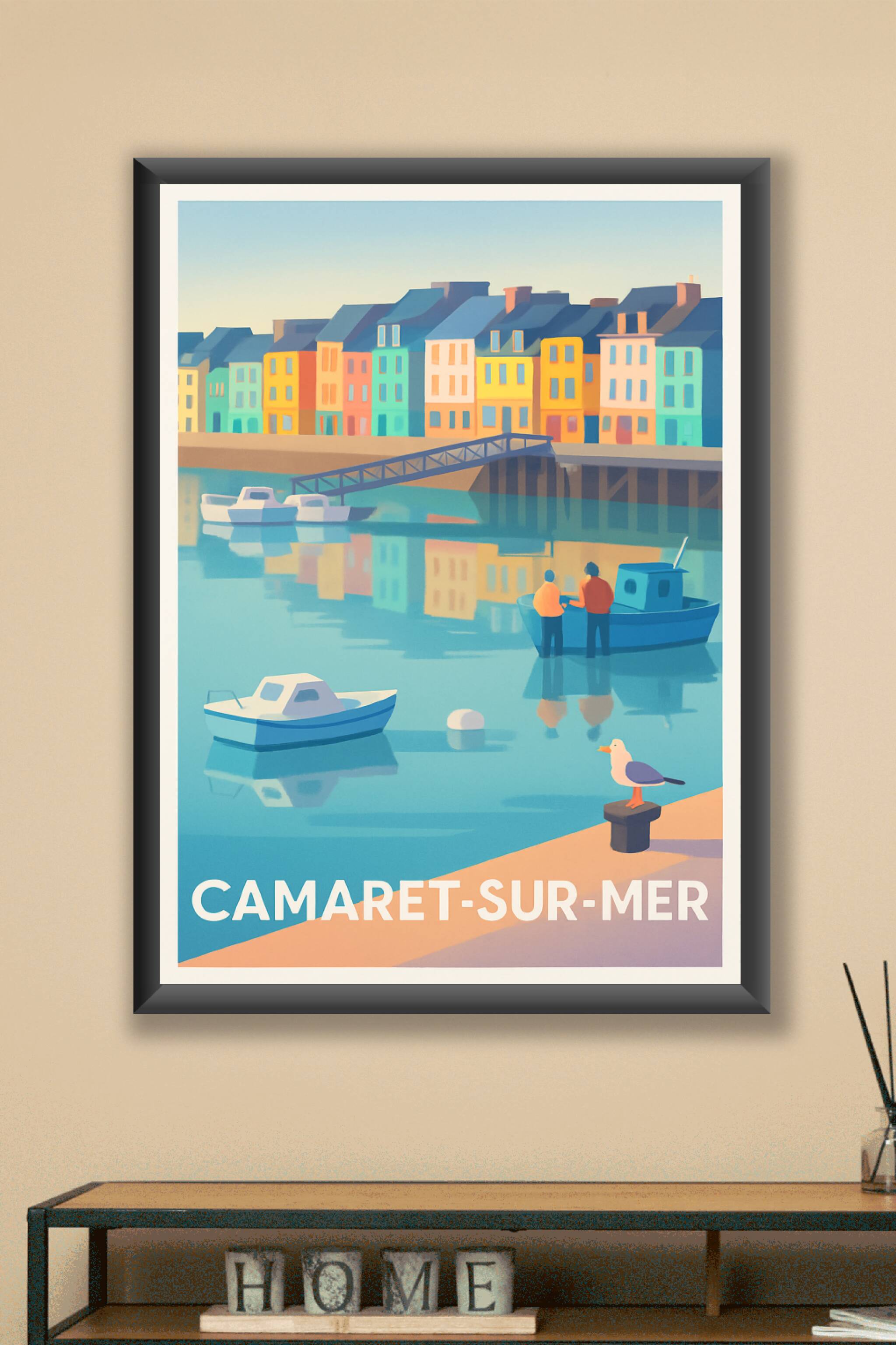 Découvrez l'atmosphère paisible et colorée de Camaret-sur-Mer avec cette affiche évoquant son charmant port de pêche bordé de maisons aux façades p...