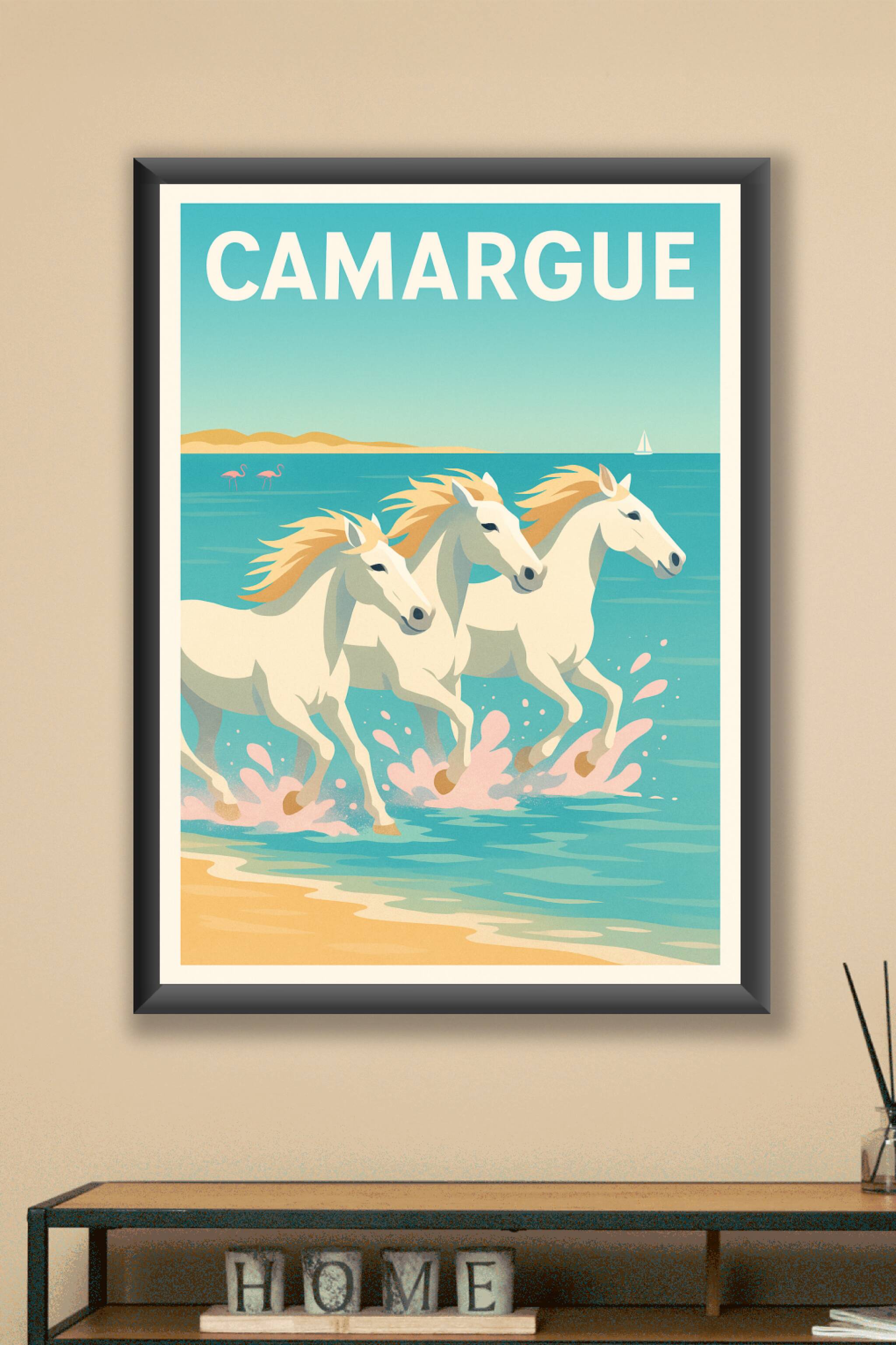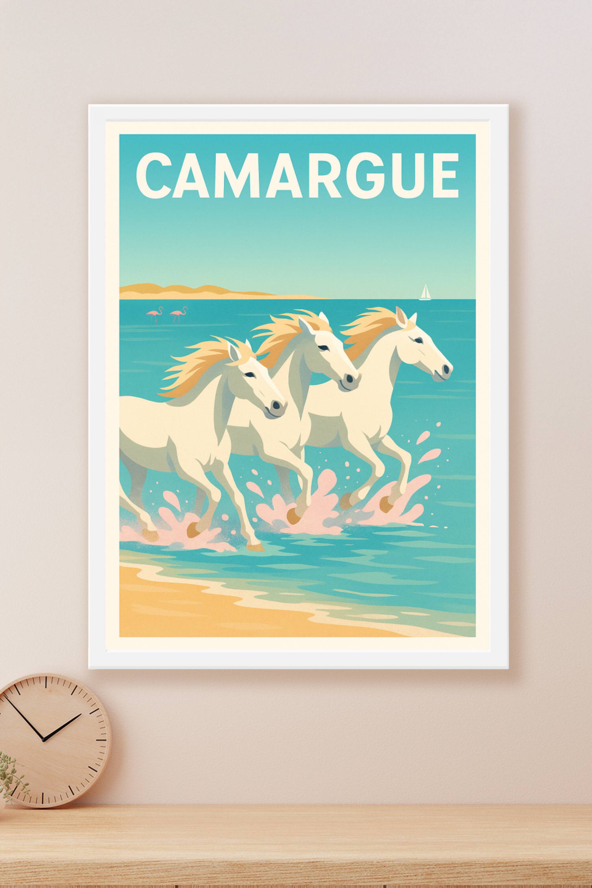 Succombez au charme intemporel de la Camargue avec cette affiche représentant trois célèbres chevaux blancs gambadant dans les eaux turquoise. Ce p...
