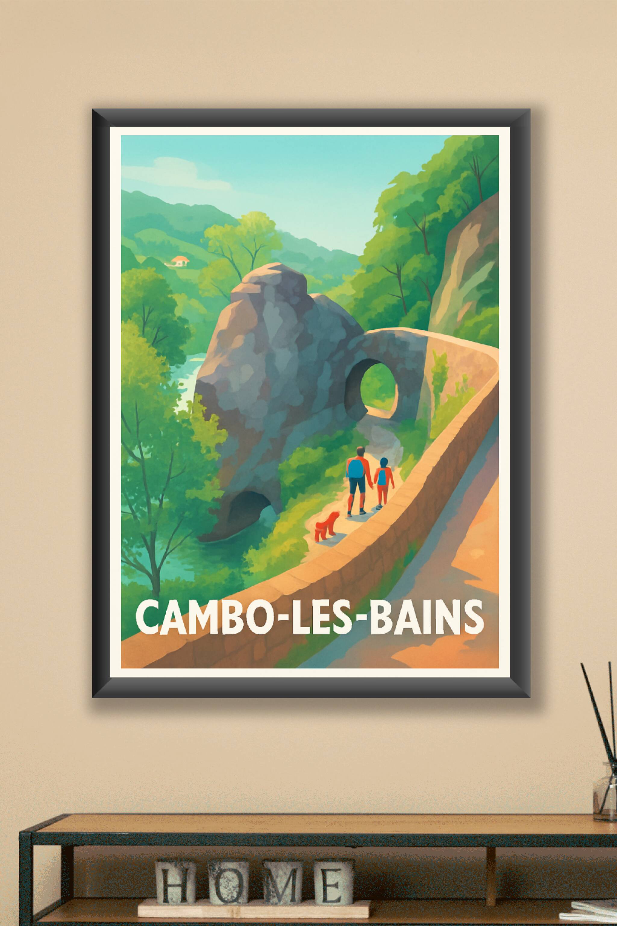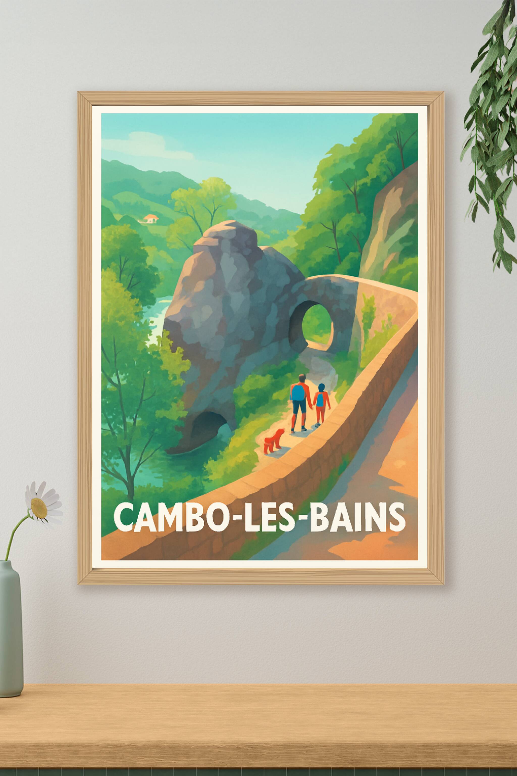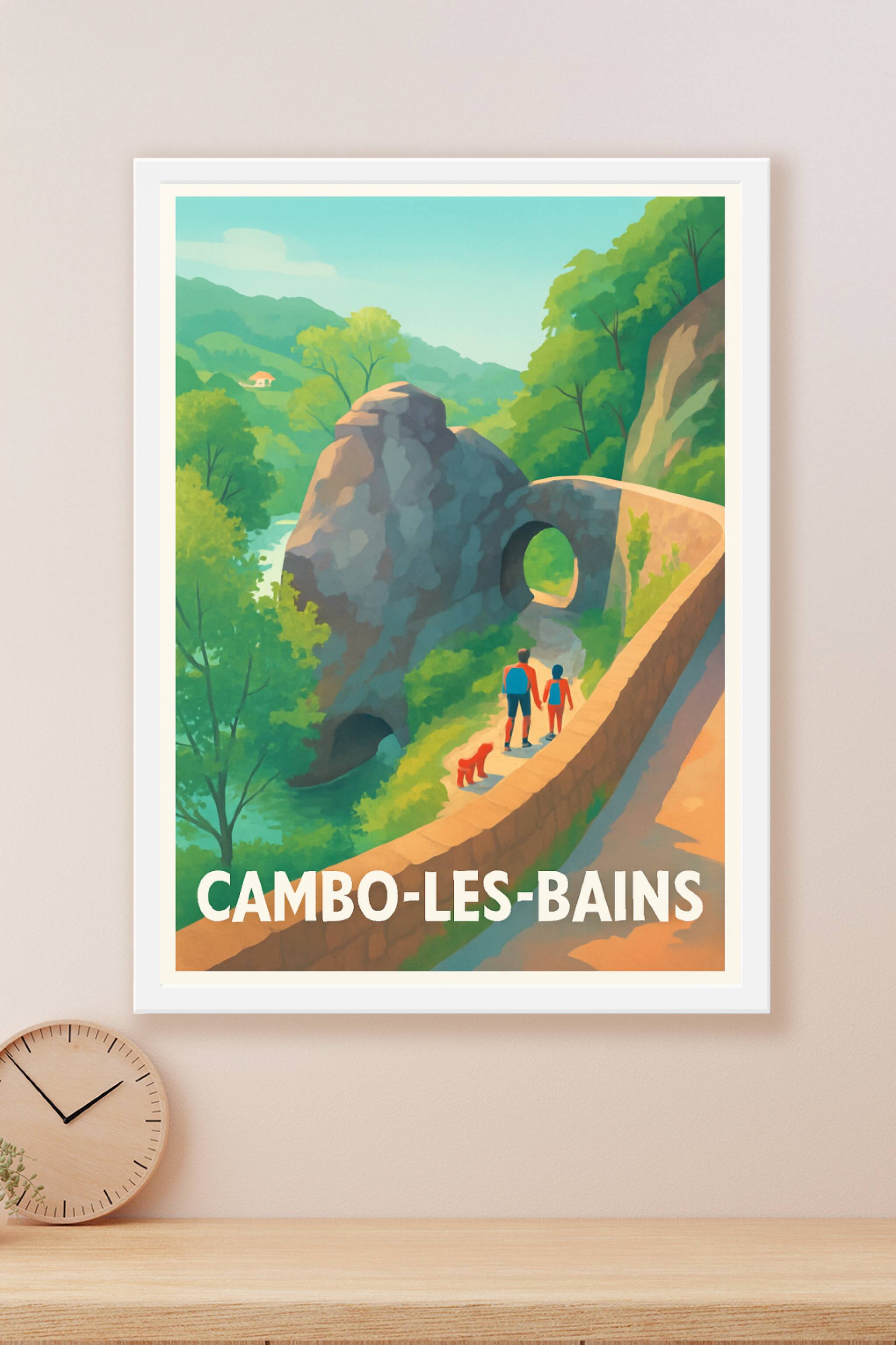 Découvrez la beauté paisible de Cambo-les-Bains avec cette superbe affiche illustrée, représentant une promenade au bord d'un paysage naturel emblé...