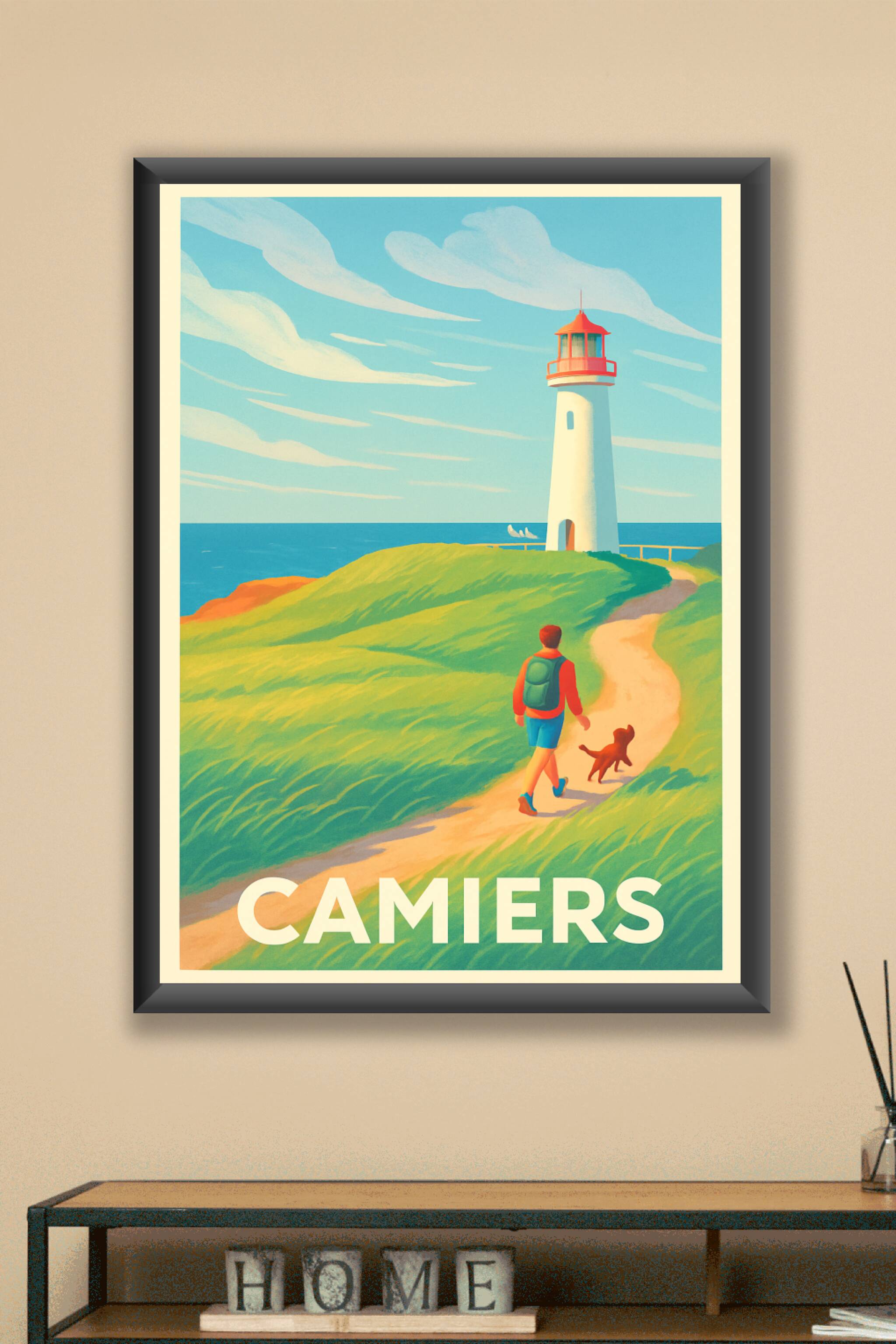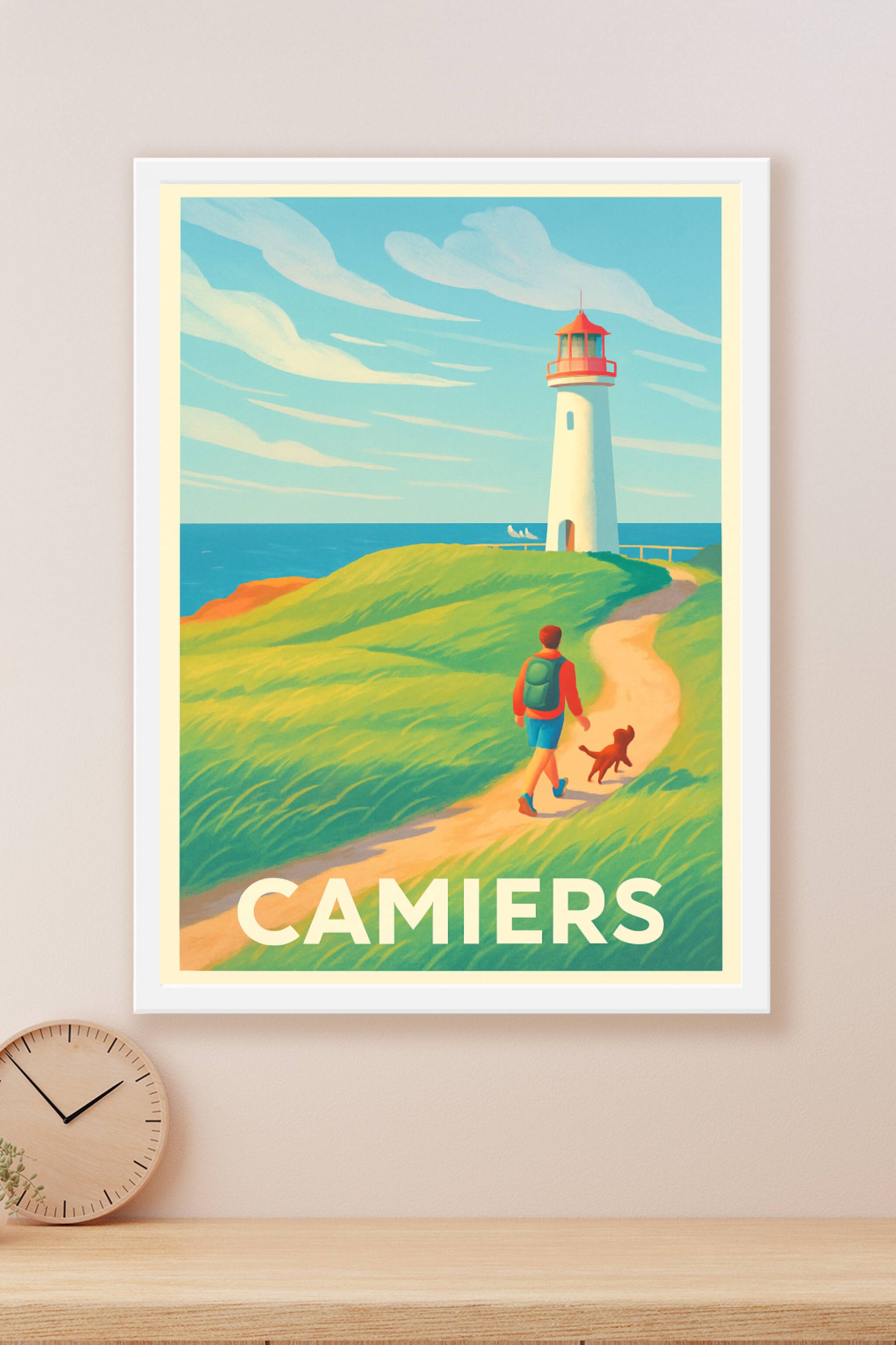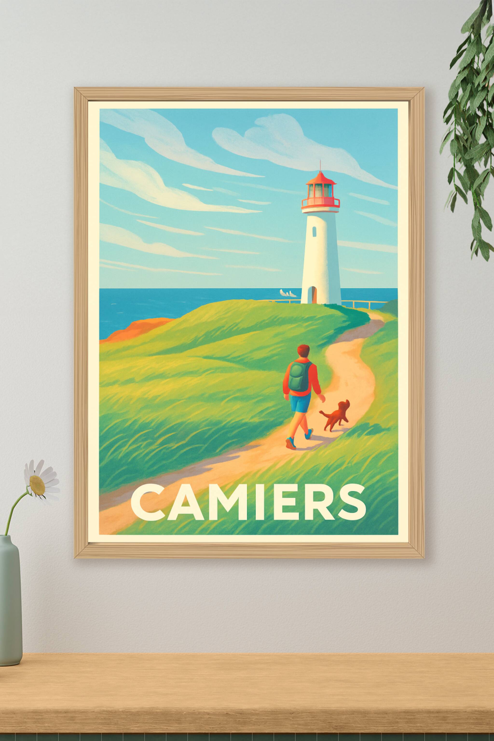 Découvrez la sérénité des paysages côtiers de Camiers avec cette affiche illustrée au style doux et lumineux. Représentant une promenade apaisante ...