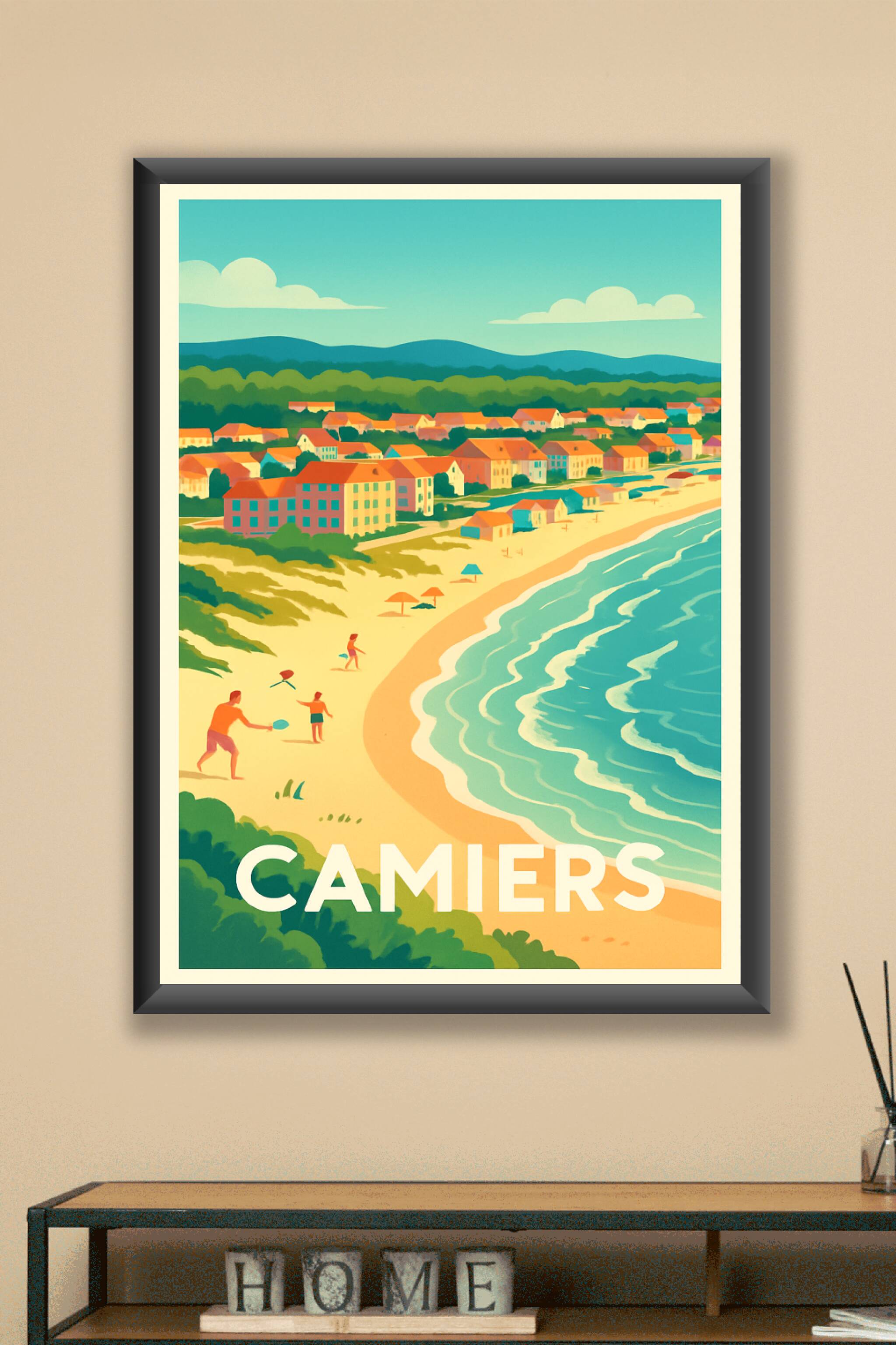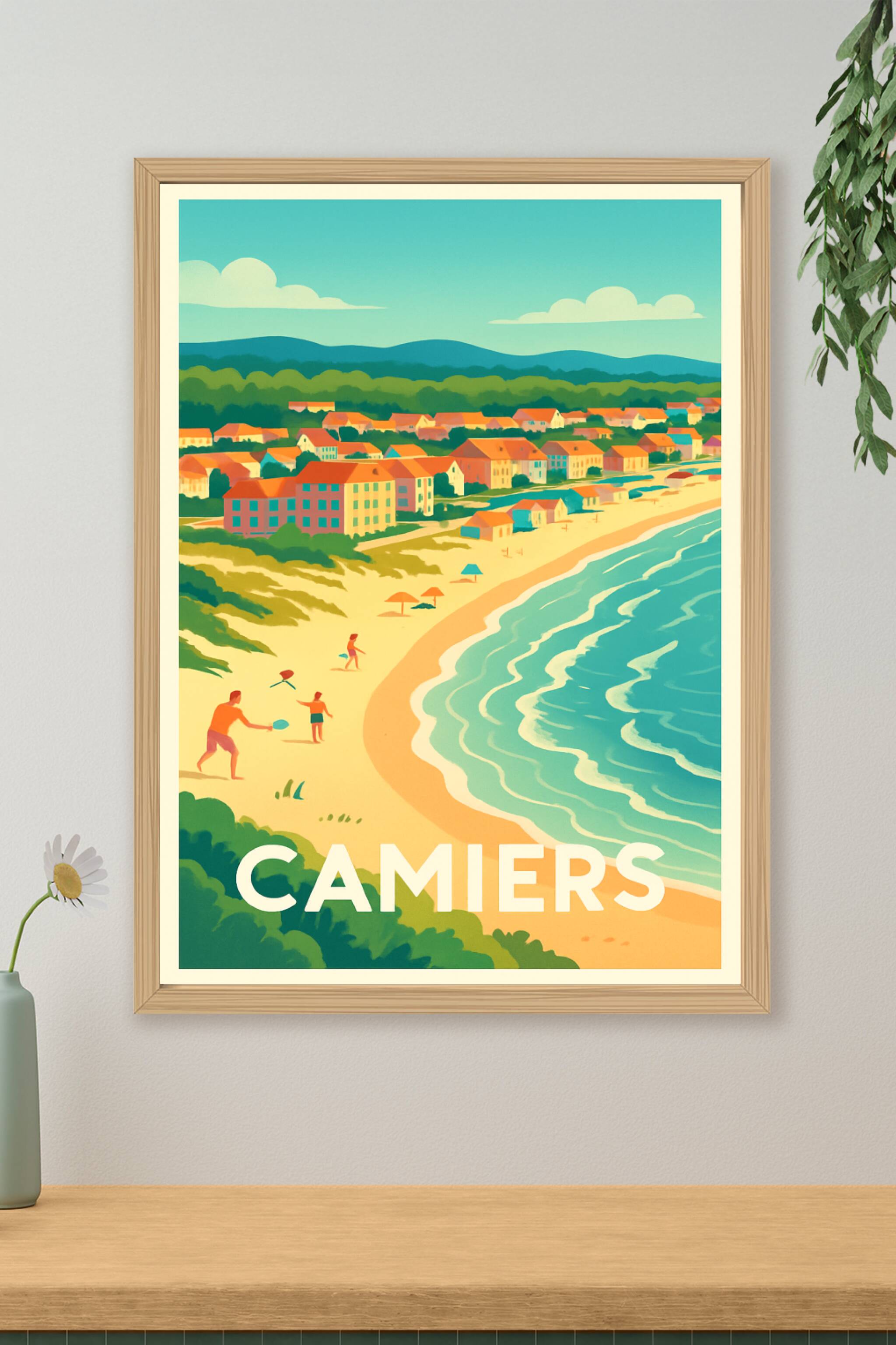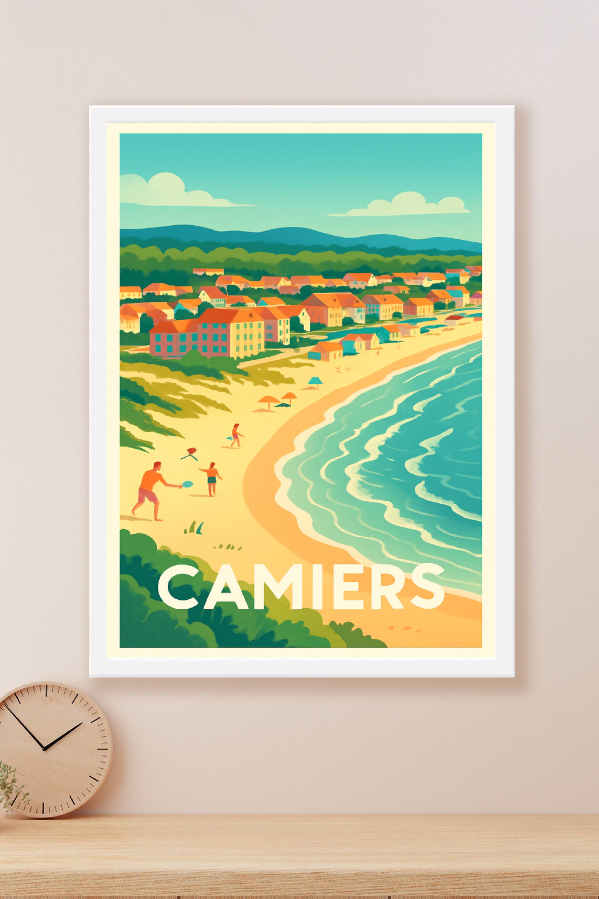 Découvrez l'atmosphère paisible et lumineuse de Camiers à travers cette affiche au style rétro et coloré qui capture la beauté de sa plage et ses m...